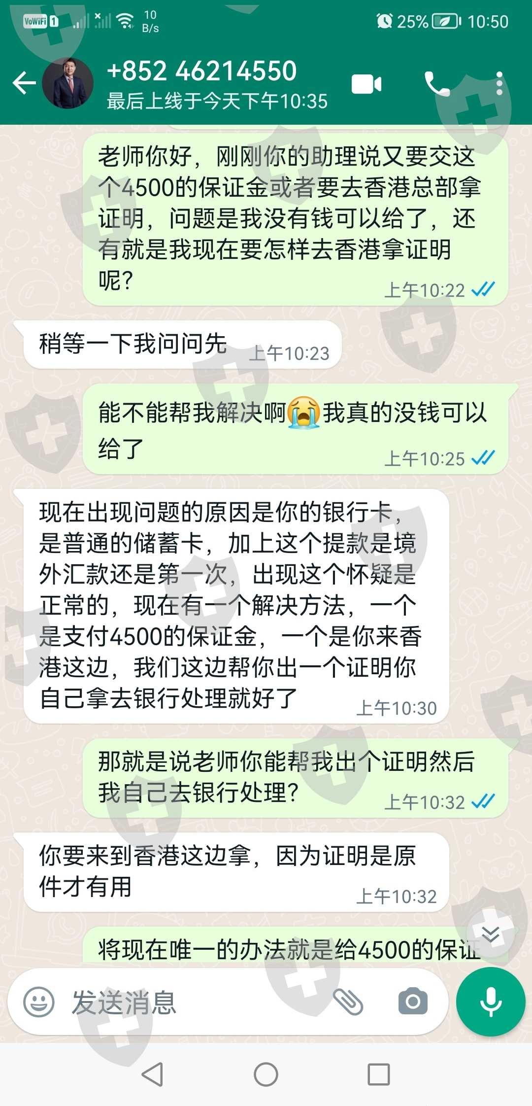 一开始有位香港女生加我whatsapp好友然后介绍了一位叫黄海的老师给我认识,之后就叫我入金900马币去赚钱,但是当我要提现的时候他就介绍一位他的助理小琴给我,但是当我提现的时候被告知要先给佣金,好了我给了之后她又说要给马来西亚政府规定的手续费,好了我再给了之后又说要什么保证金,但是这次我没有给,所以我决定先爆光。我这里有那位黄海老师的证件,他说是什么CFA的,所以我有请各位和官方帮我看看这个是真的还是假的,还有就是官方你帮帮我追回我的金额。打扰了各位,希望官方可以尽快解决,但愿你们也不要被受骗了。