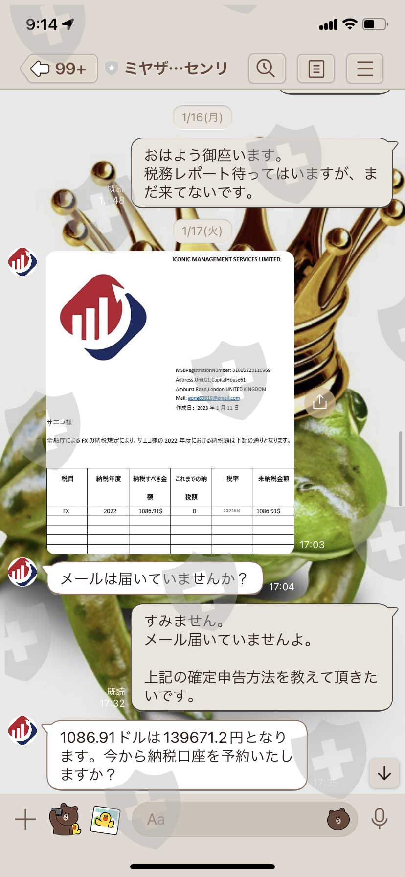 1月頃に投資シェア会F4にてグループ内で全員一度出金するようにとお願いされていましたが、その時にいつもLINEで問い合わせてる宮崎千里と名乗るiconic management取引所の日本担当のマネージャーに出金のお願いをしました。