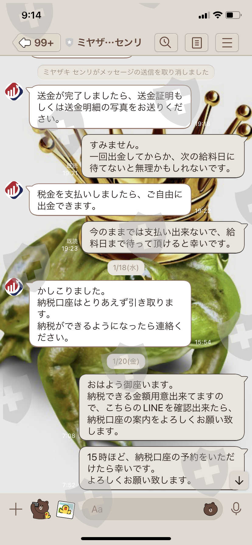 1月左右,在F4的投资分享会上,群里的每个人都被要求退出一次。我提出了一个要求。当时为了全额提取,转税额缴纳所得税后才可以自由提取。并保留税务帐户?我去取的时候,当时没有日元可以用,所以我决定拿回去,两天后就联系不上了。不过,关于这次的真相大白,由于我是2月中旬才交完税,所以在取款之前无法联系到你们。我有。后来才知道是骗局。我交了税后,一时联系不上他们,结果被怀疑洗钱了。如果真的要说出产地出示或者税金出示的时候我们要准备什么,没有说明,所以银行账户信息等也是一样。我觉得是欺诈以致无法取款。