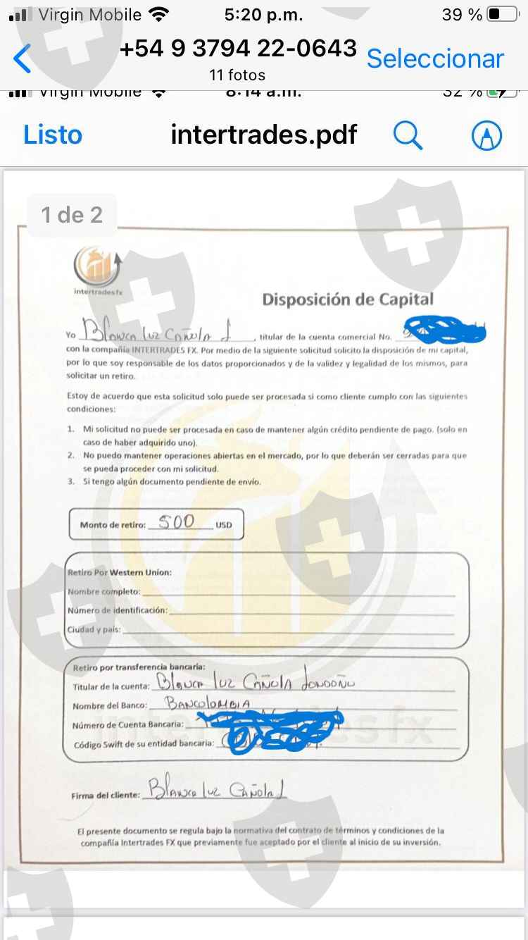 下午好,我写信给你是为了请你帮我找回我的钱,因为我是一个骗局的受害者,因为 IntertradesFx我在 Facebook 上看到一则广告,我注册是因为我想投资。广告上说经过认证的经纪人,但经纪人本身是 IntertradesFx我注册了,他们非常有说服力地打电话给我,我给了他们 50 美元,然后又给了他们 50 美元,但为了开始操作,我存入了 100 美元,然后假定的分析师打电话给我,他每 3 天发送一些有回报的表格。他取得了我的信任,告诉我要多投资,70万哥伦比亚比索每周到账,公司会借到下周,我接受了,下周存了336美元,钱已经打光了。 subject nestor garcia a month 行政部门的一个人打电话给我,他告诉我我的账户是 00,在我欠他们 900 美元之前,如果他不知道市场是如何运作的,他告诉我很多不愉快的事情,我也回答了他们是骗子,因为我将永远感谢您的合作。然后是付款证明;