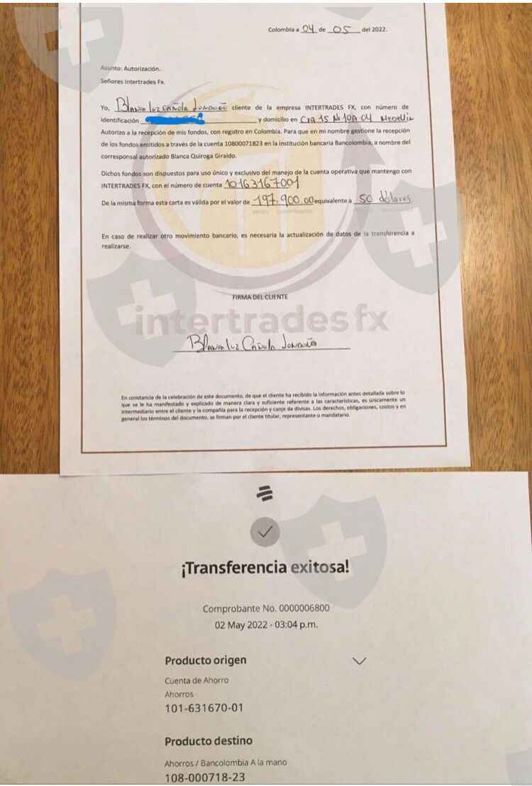 Buenas tardes me dirijo a ustedes para que por favor me colaboren a recuperar mi dinero , ya que fui victima de una estafa ,por Intertradesfx, vi un anuncio en el Facebook y me registré porque quería invertir el anuncio decía broker certificados pero el broker como tal es Intertradesfx me registré me llamaron muy convincentes les consigné 50 usd luego otros 50usd pero que para empezar a operar era con 100usd los consigné luego me llamo él supuesto analista mandaba unos hojas con unos rendimientos cada 3 días . Se ganó mi confianza y me dijo que invirtiera más que cada semana me iban a llegar 700 mil en pesos colombianos , y que la empresa los prestaba hasta la siguiente semana y yo acepte y ala siguiente semana le consigné 336 usd , y ya se perdió el sujeto Nestor garcia al mes me llamo un señor de la parte administradora y me dijo que mi cuenta estaba en 00 que antes les debía 900usd , que si no sabía cómo funcionaba el mercado Y me dijo muchas cosas desagradables yo también le respondí son unos estafadores por su colaboración quedaré eternamente agradecida . A continuación los comprobante de pago;