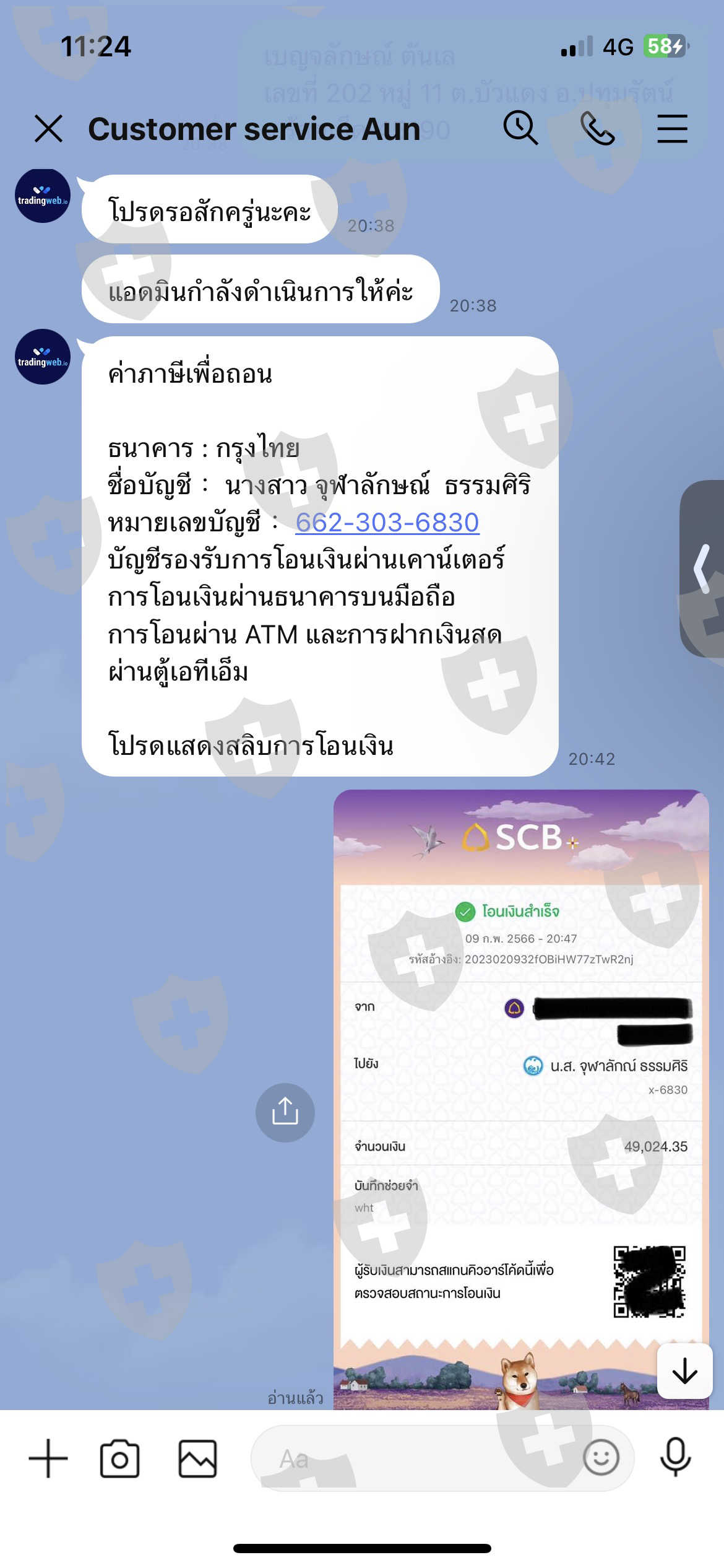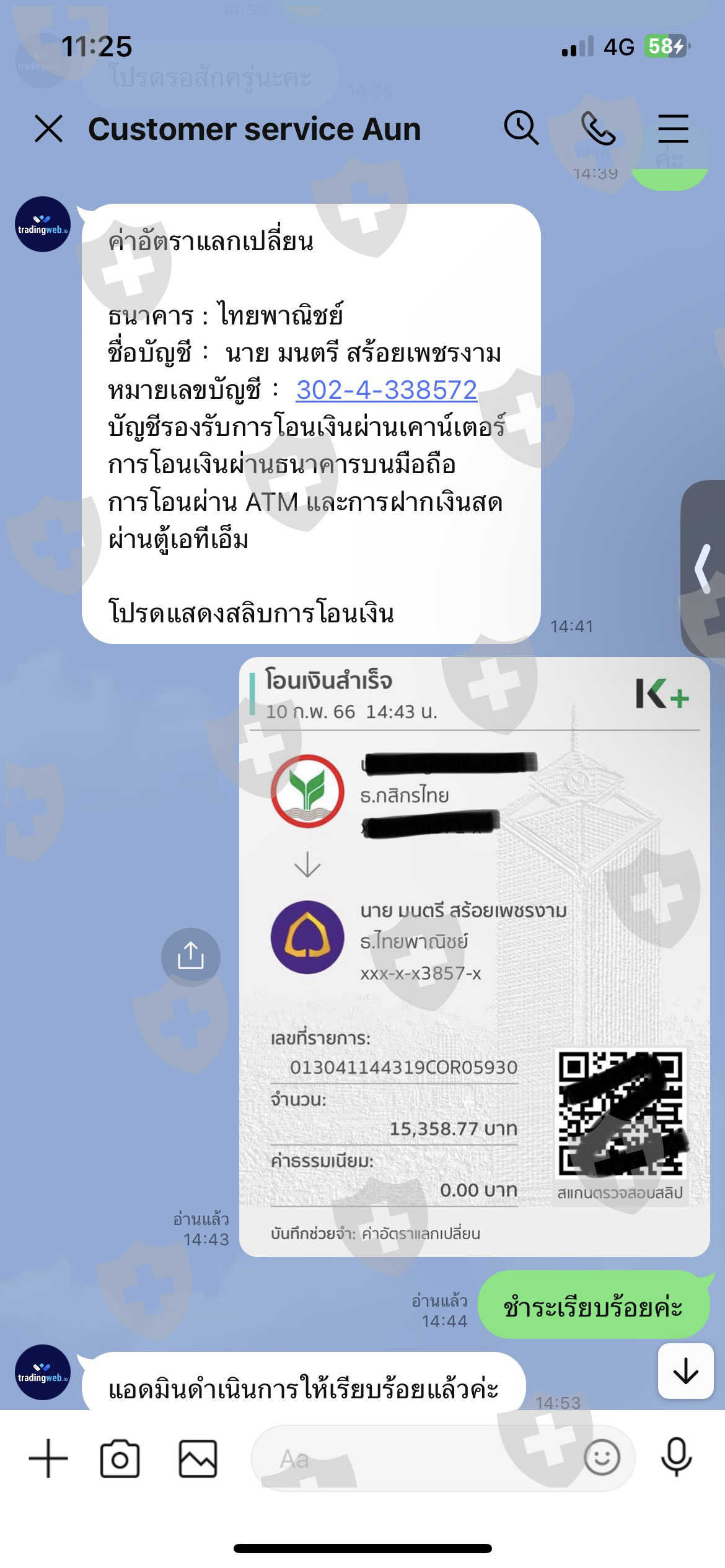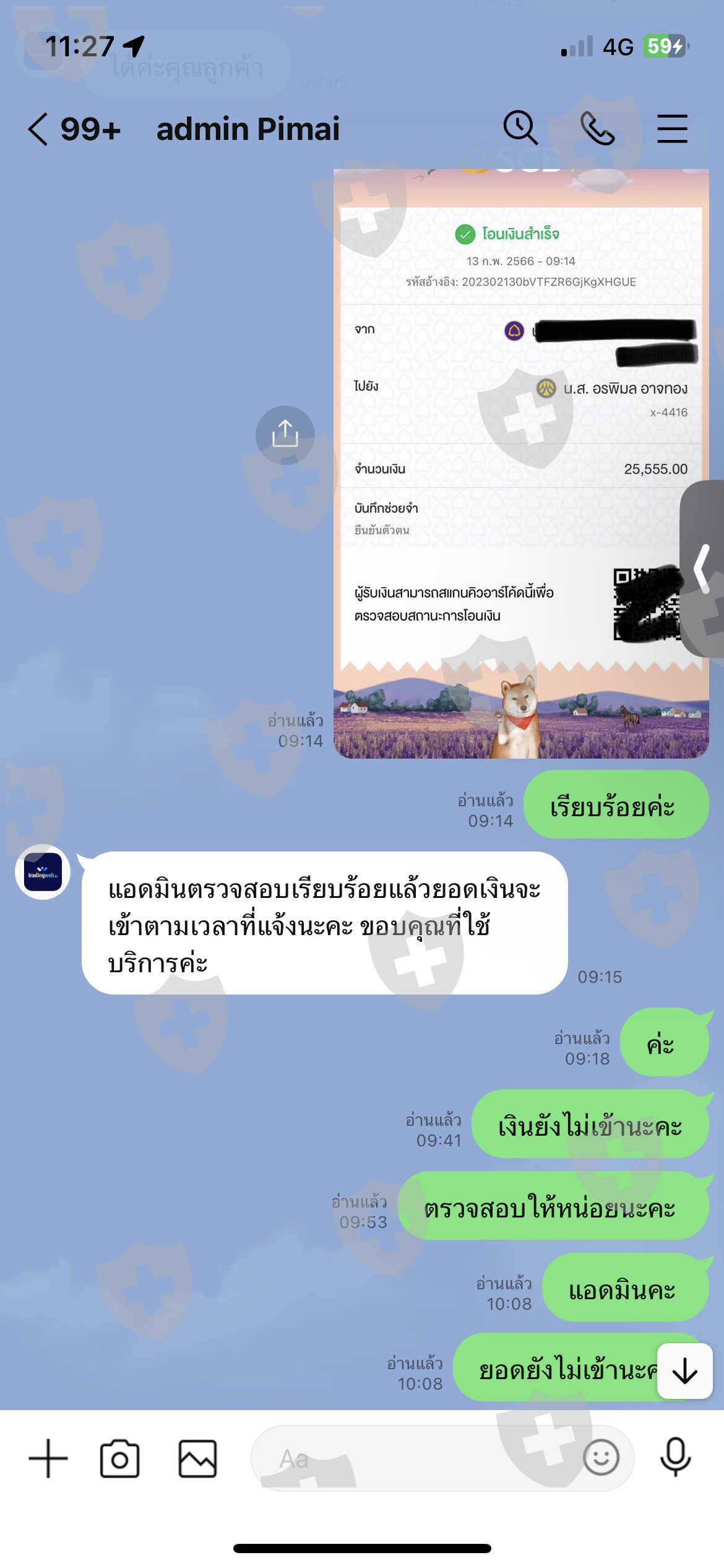 6. แอดมินแจ้งต้องชำระค่ายืนยันตัวตนลูกค้าใหม่ที่ถอนครั้งแรกอีกจำนวน 25,555 บาท (จะได้รับคืนพร้อมยอดถอน)