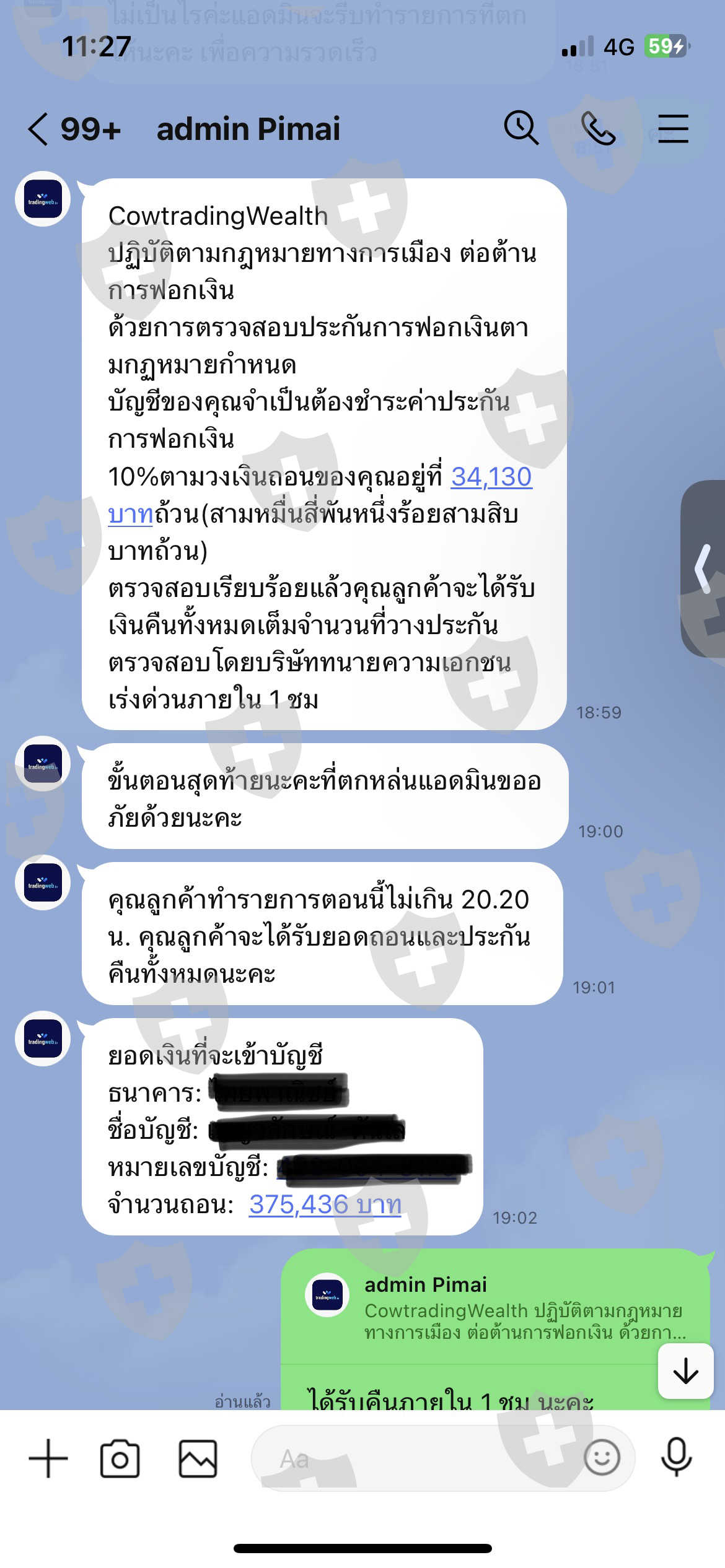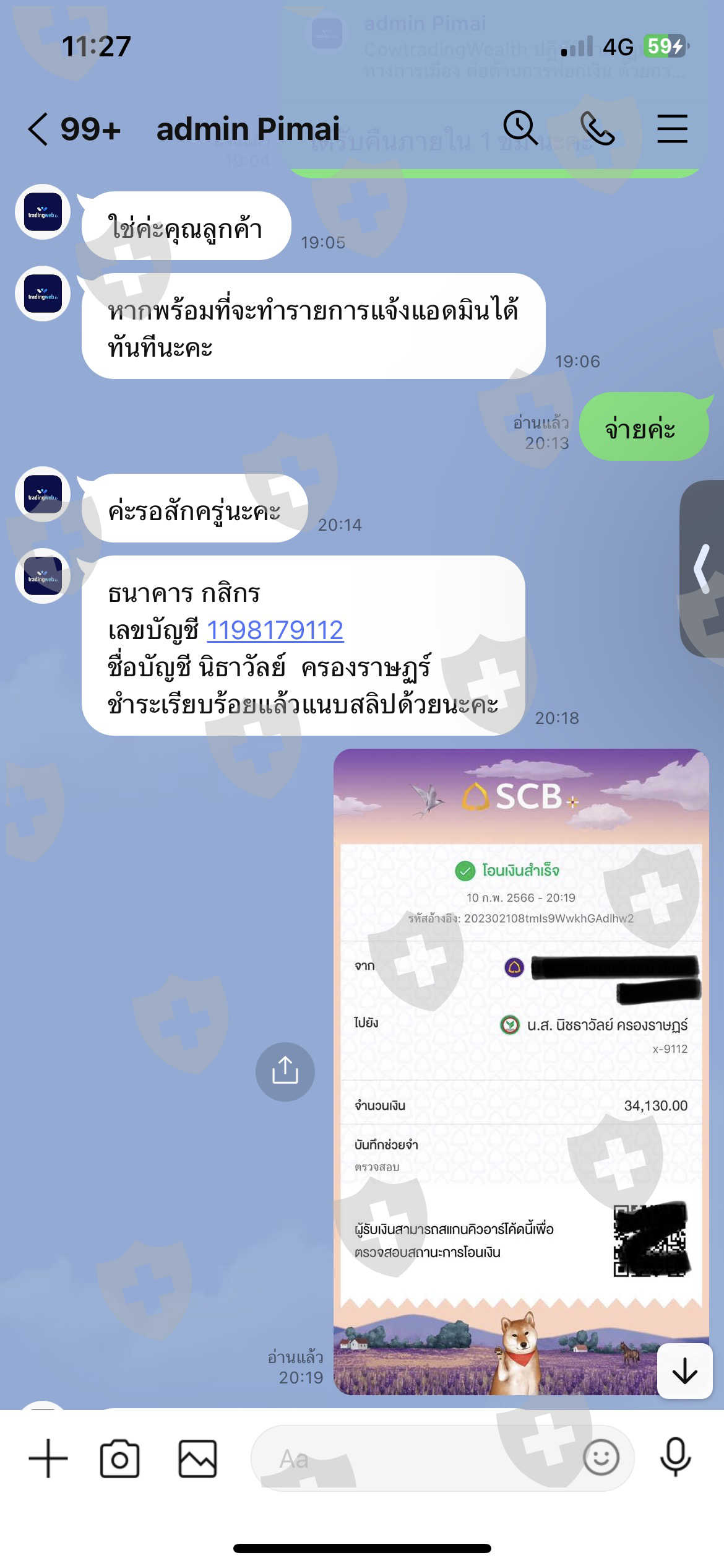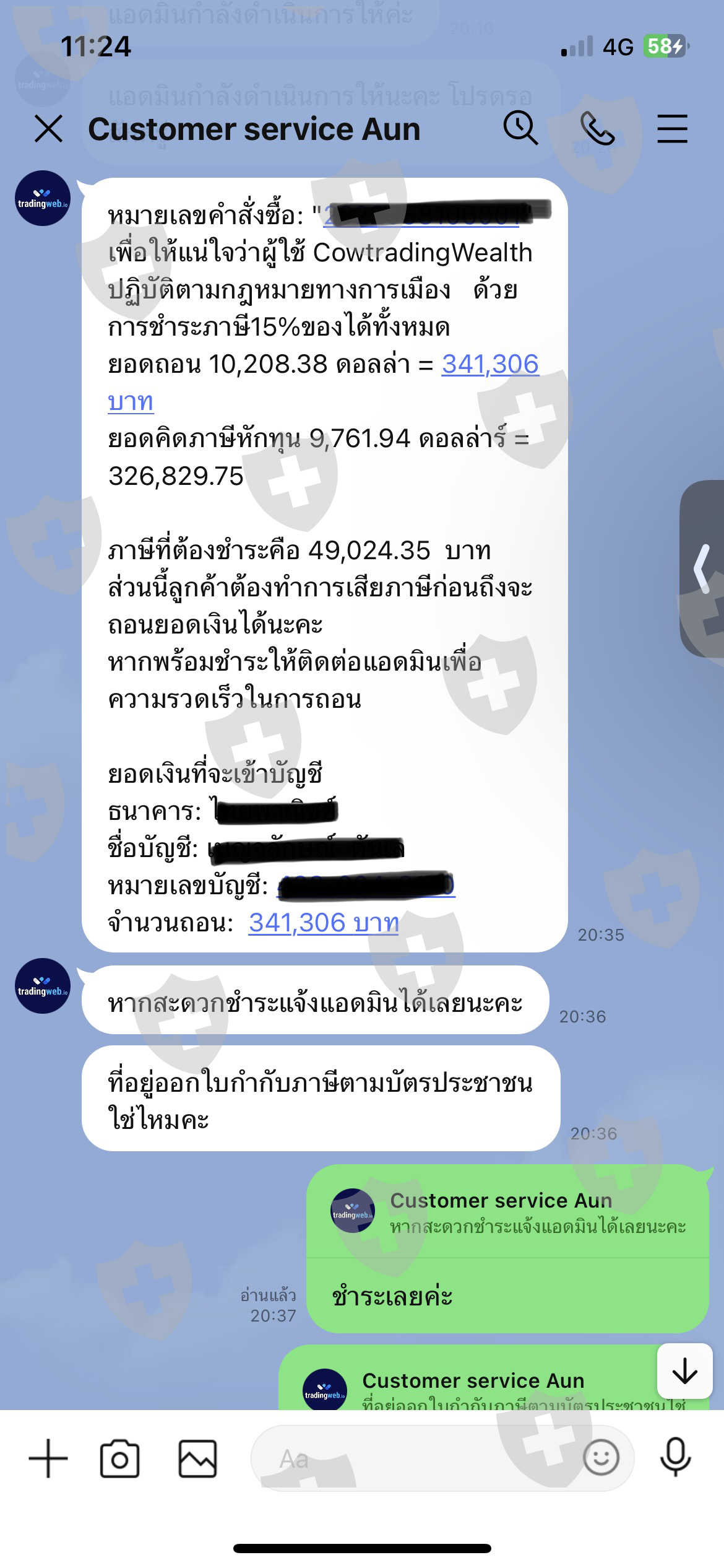 5. แอดมินแจ้งต้องชำระค่าบริการตรวจสอบฟอกบัญชีสำหรับการถอนครั้งแรก 10% ของเงินที่ถอน จำนวน 34,130,บาท (จะได้รับเงินคืนพร้อมยอดที่แจ้งถอน)