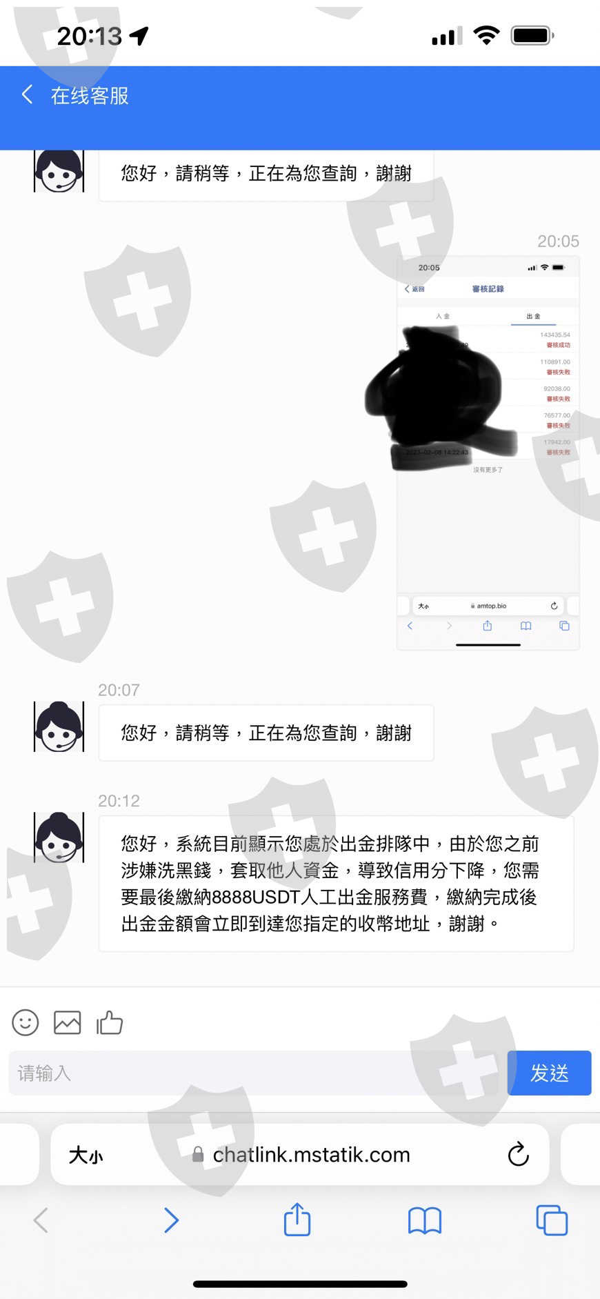無法出金,使用各種理由套金,如洗黑錢、凍結帳戶、保證金、人工出金費….等理由,這種平台根本詐騙,還會一直更換網址,只要是看到Amtop的字眼都是假的,客服的網址都是下面的網址,所有網址的IP有四處各地,跟官網上寫的都不一樣,請大家不要再被騙了。