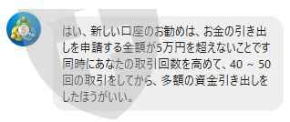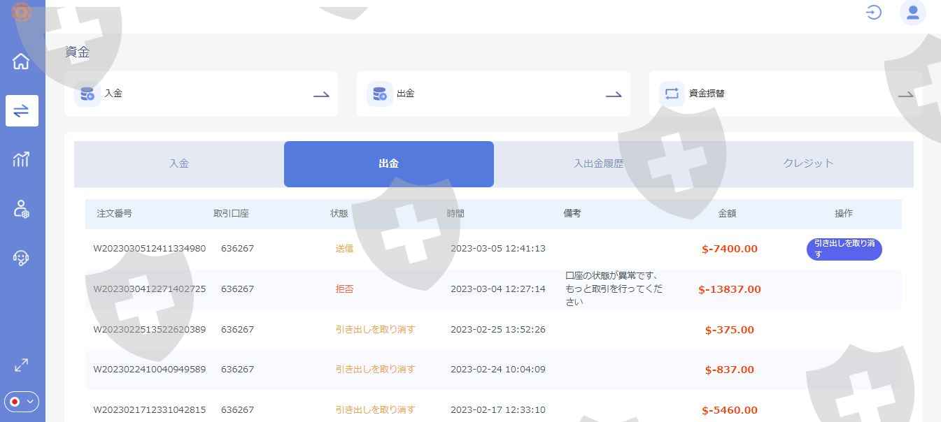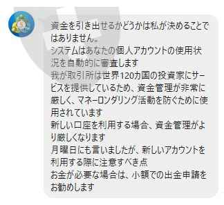 最初は少額の入金から始まり、借金でローンを組ませてまで入金を進めるので怪しく感じました。最初は出金確認のため2度ほど出金依頼したらきちんと振り込まれましたが、少し大きな金額の申請をした途端審査が通らなくなりました。少額なら出せるよう言われ、金額を下げても出金はできません。もう何を言っても添付の資料の通り、のらりくらり言い訳をしてきます。