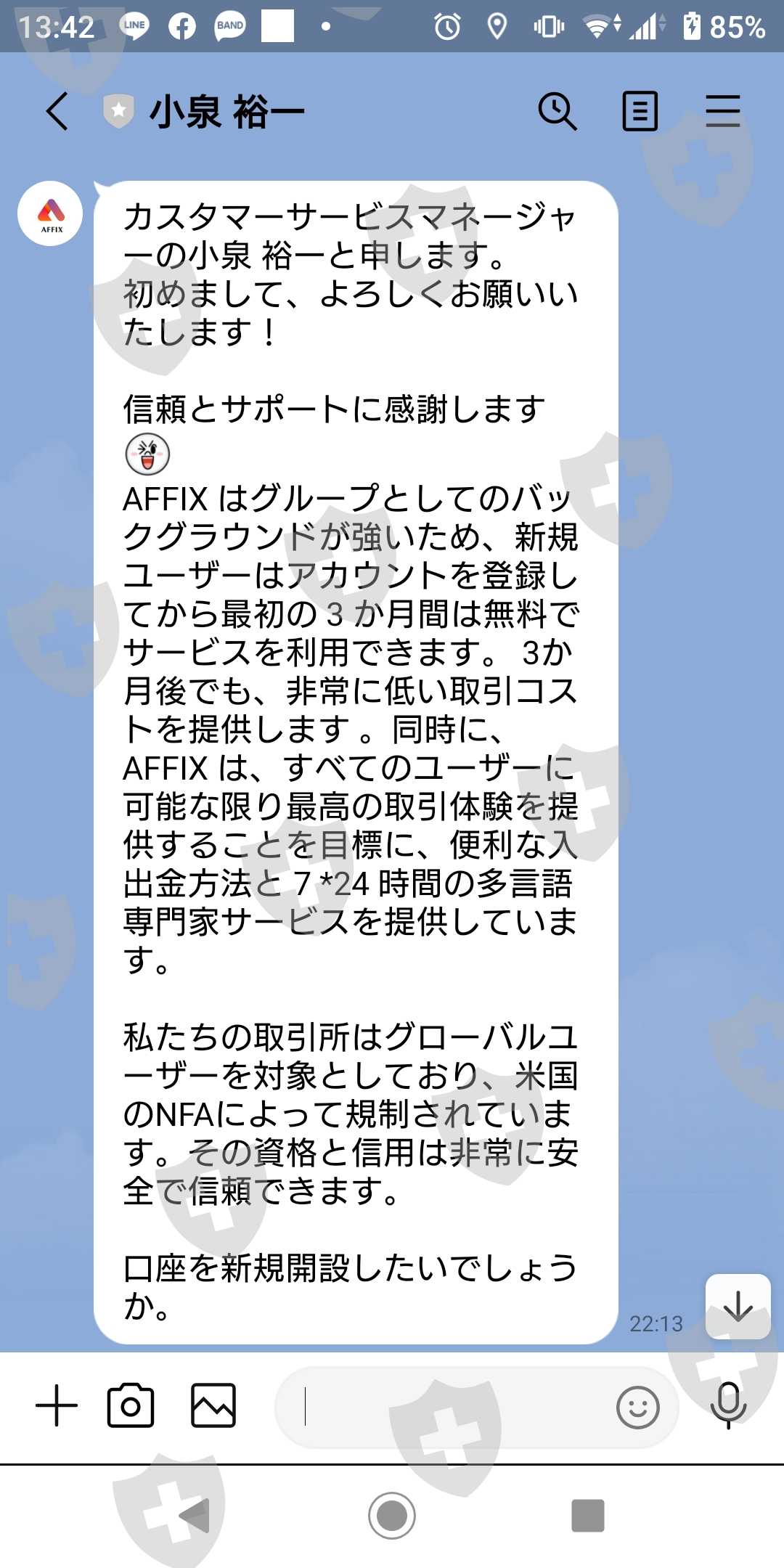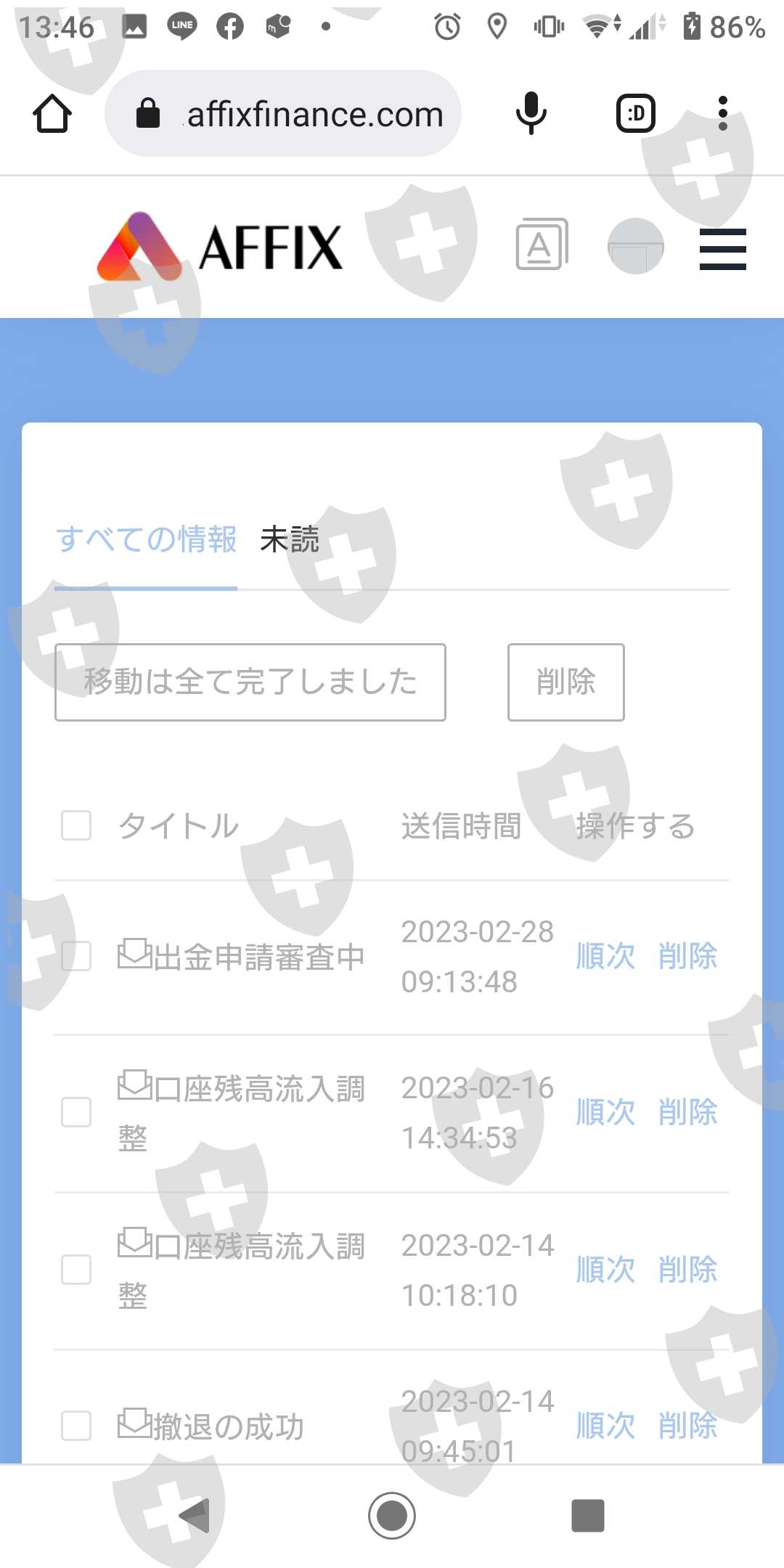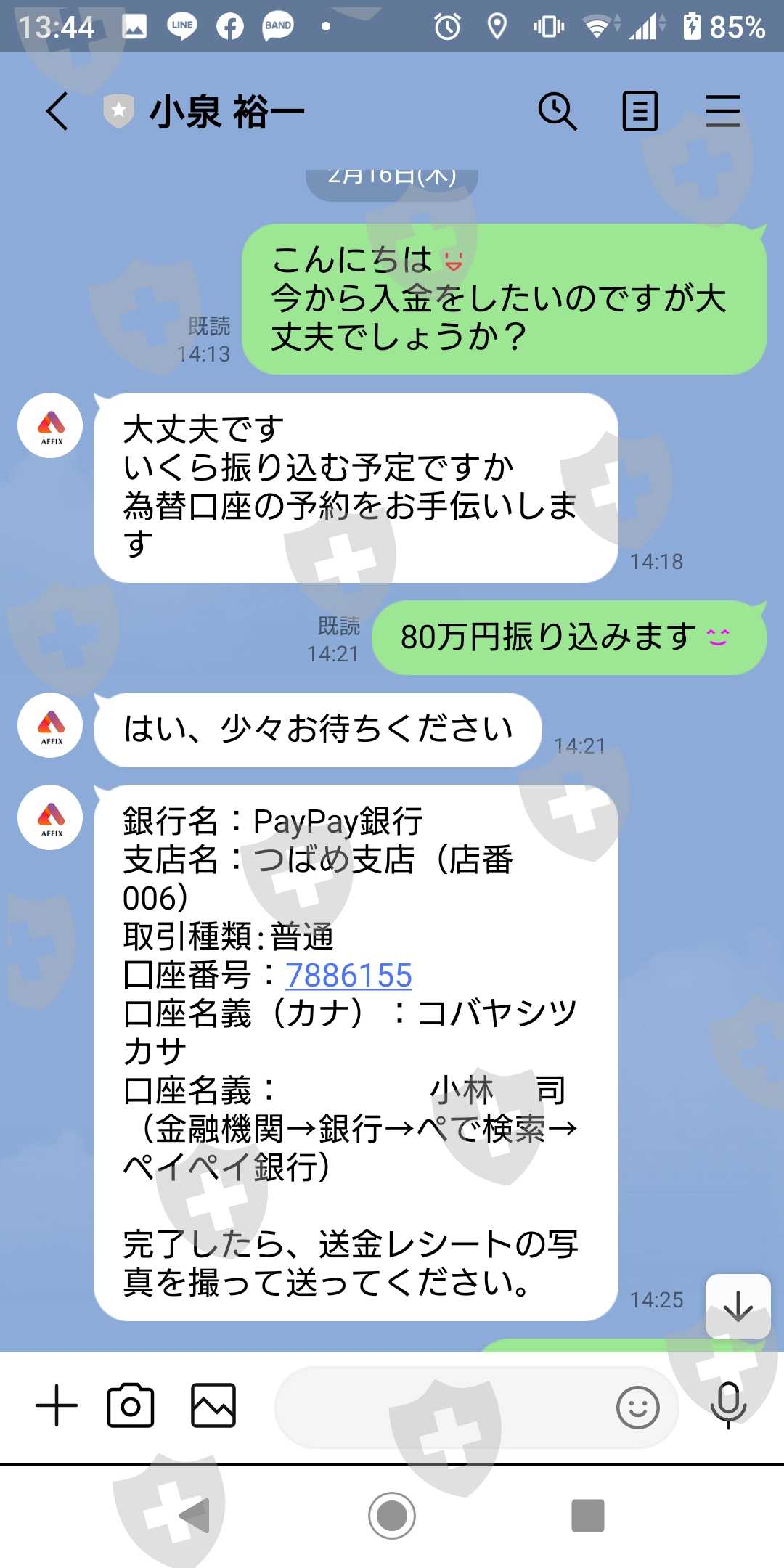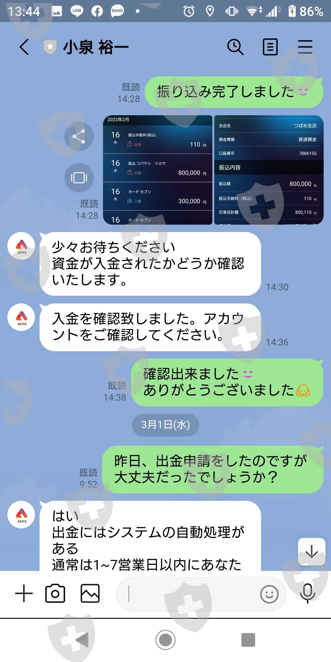 FXグループラインにはいり、そのグループ内でAFFIX口座を作らないかと勧誘していたのですが、その時にカスタマーサービスマネージャーの小泉裕一という人が担当で、口座を開設しました。ラインでの開設と入出金のやりとりも小泉裕一が担当でした。入金したい旨を伝えると知らない個人の為替口座でした。不安だったので最初に5万円だけ振り込みをして取引口座に反映されたので、次の日に又5万円入金しました。入金をしたので1度出金に慣れる為に小泉さんに出金する旨を伝え、取引口座から10万円出金申請をしました。この時の出金は翌日には口座に入金されていました。なので安心して今度は80万円を入金しました。取引をして1度の取引で$2,928損失してしまったので残りの$4,133.03を出金申請しました。1月28日に申請してまだ出金されていません。AFFIXの取引口座のメッセージを見てもまだ出金申請審査中です。カスタマーサービスマネージャーの小泉裕一にライン連絡をしても既読にもならず、連絡もありません。早くお金を出金してほしいです。