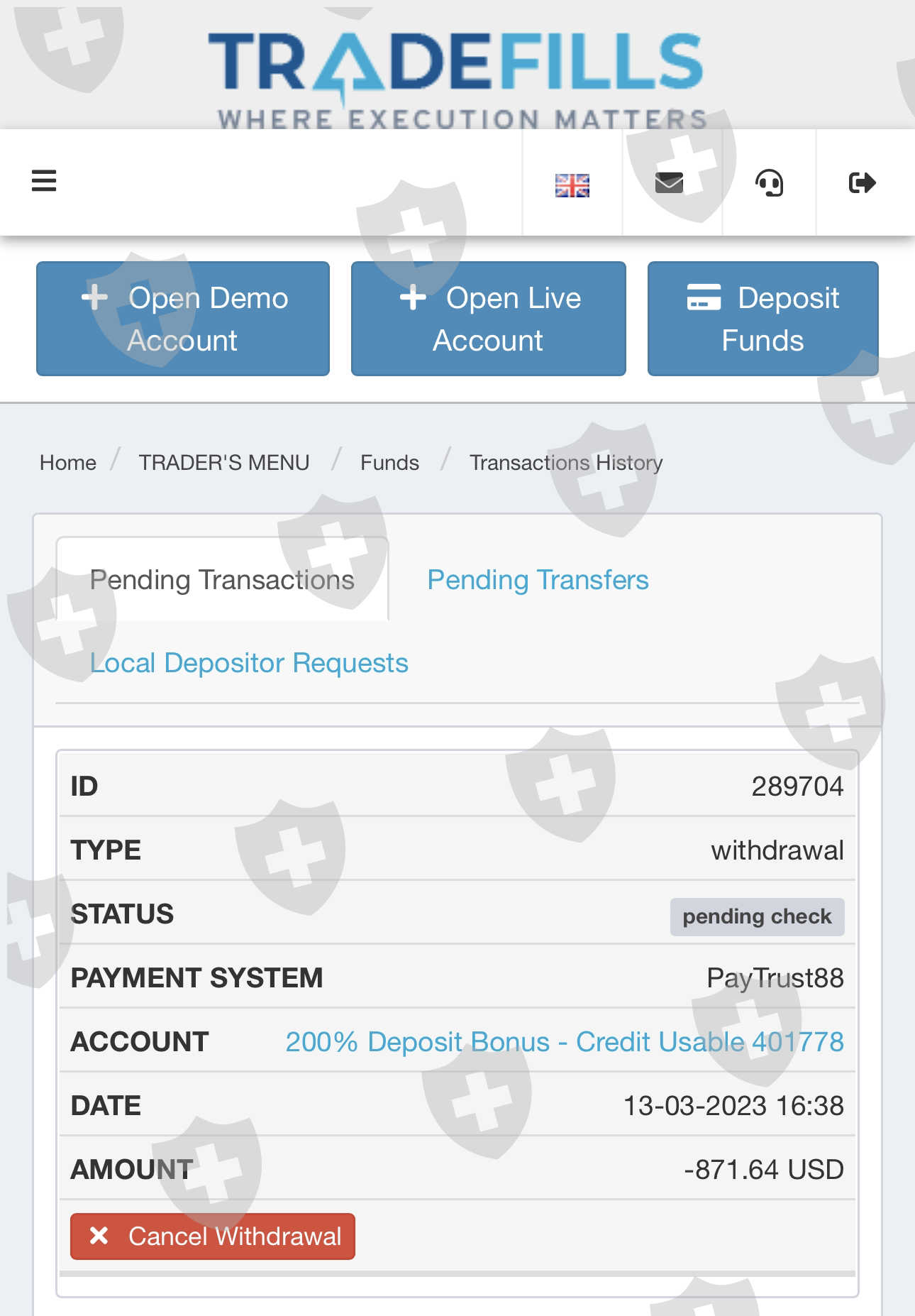 tradefills unable to withdraw