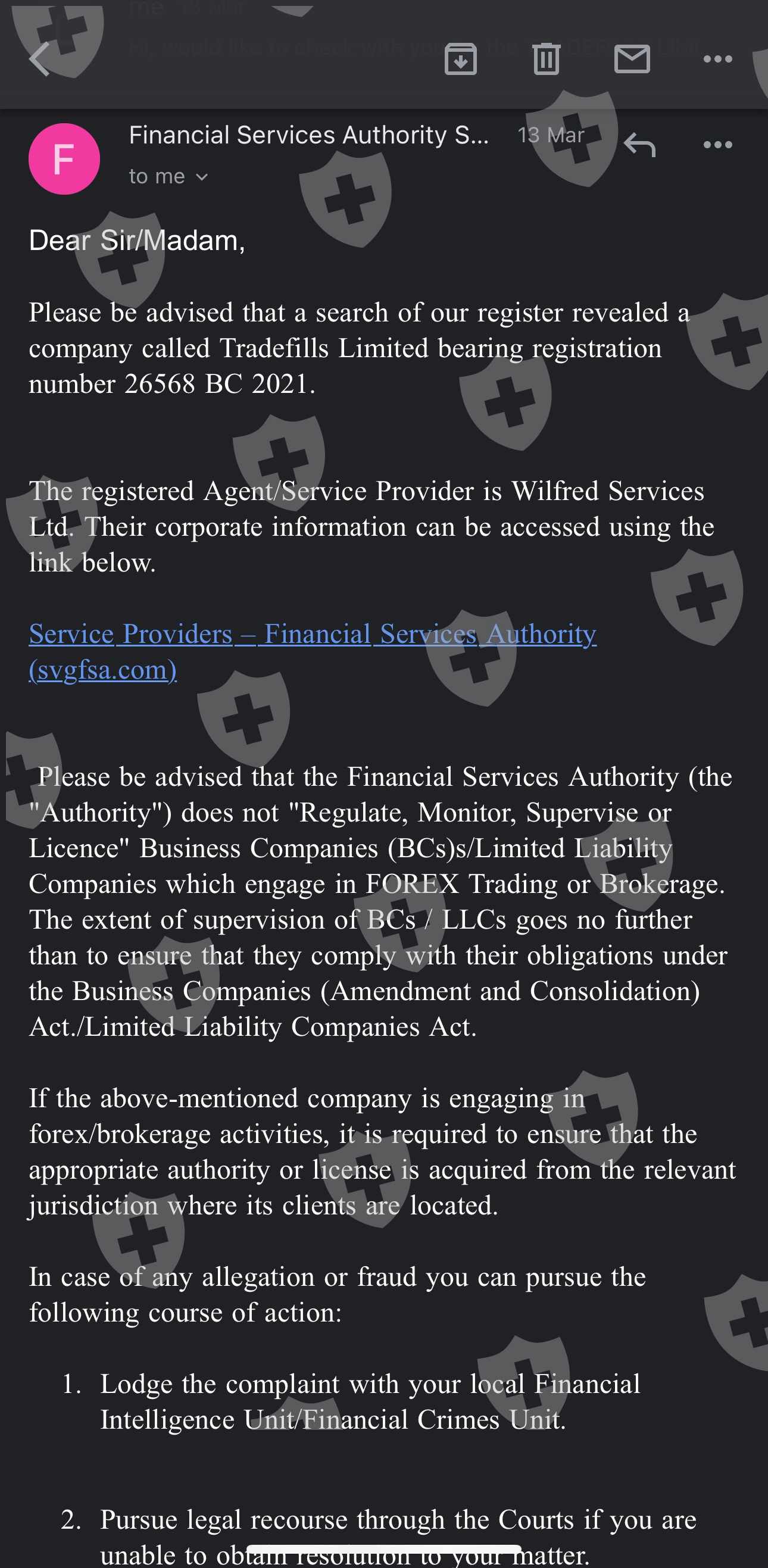 When texted the Financial Services Authority that provide license for Tradefills. They claim that they do not incharge for this issue !