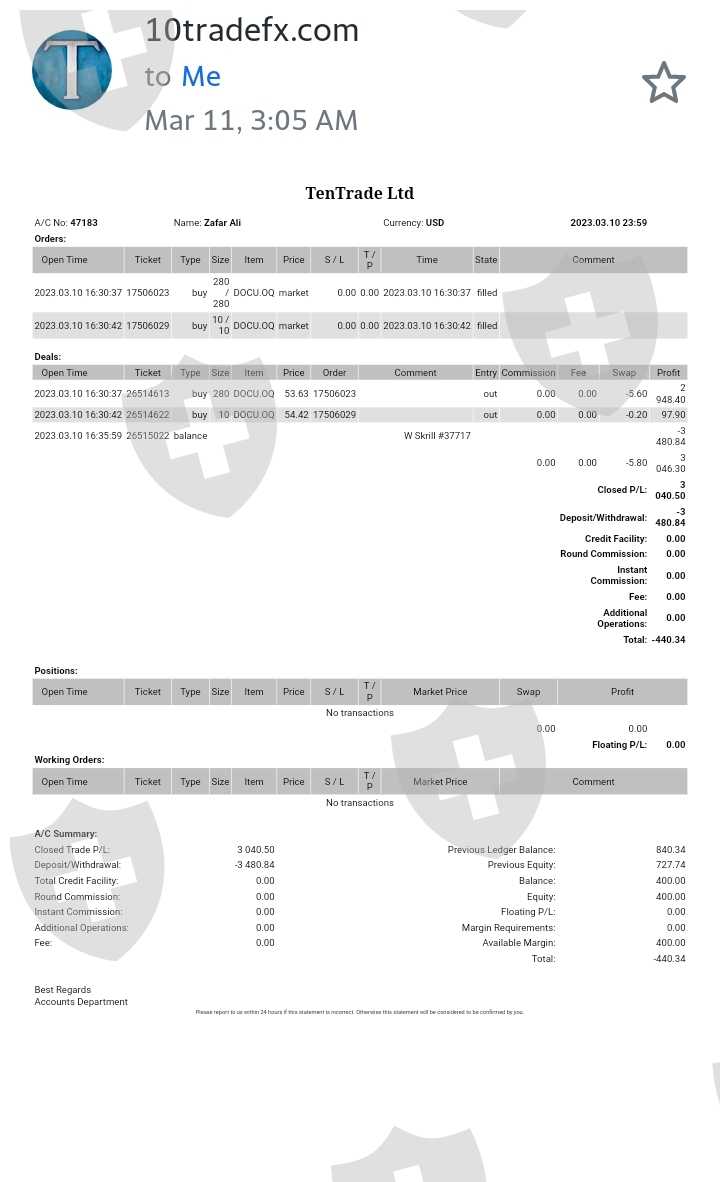 大家好,我叫扎法阿里。我的TenTrademt5 id是47183。10tradefx是黑交易商,不要在这里开户。 TenTrade声称是注册交易商。我告诉你他们如何骗我的所有细节。我正在联系他们的规定。他们将被罚款,该经纪人将被禁止。我以850 美元的价格购买了docu us share。我只买了209股。购买股票后,我还有550 美元的可用保证金。第二天开市时我的利润是3040 美元。当我关闭交易并放置提款时,他们接受我的提款并向我发送电子邮件以接受我的提款(附上截图)。其次他们拒绝了我的提款并告诉我我欺骗了他们。我做了什么欺诈行为,我只是买了我们的股票,当我看到我的账户有利润时,我就关闭了交易。这是为了结束交易而获利的欺诈行为吗?我什至没有从他们那里得到任何奖金,所以这些条款不适用于我。我用自己的钱交易。我损失了这个交易商不会补偿我的钱。首先他们扣除了我所有的利润,我的余额减少到850 美元,然后他们又扣除了550 美元,现在我的余额是300 美元,这TenTrade告诉我退出(附视频)。我警告大家远离这个交易商。如果您有任何存款,请尽快取出。我只想通过我的资本投资获利。否则我也在其他平台和监管机构上发帖。