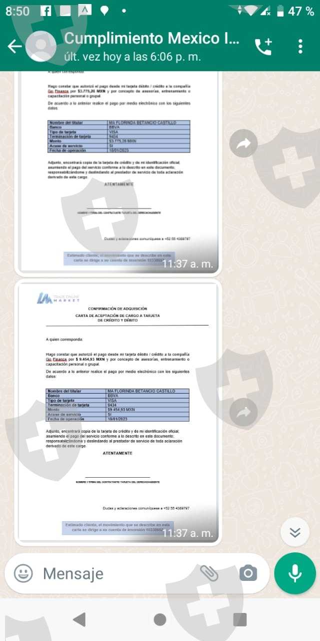 2023 年 1 月 11 日,页面出来了,一位名叫 NATALIA VERONA 的顾问联系了我,她的号码是 5521706614,他们只询问了我的详细信息,从我的卡中,第一笔存款是 3800 美元,然后是 6015.68 美元,另外 5 笔是 6015.68 美元,另外 5 笔是.但除此之外,他们还从我的卡中拿走了 9454.93 美元和 3775.26 美元。在他们未经我同意的情况下从我的卡中取出这些金额的那一刻,我想与他们沟通,但他们没有回答,在他们联系我之后,因为我在一条消息中告诉他们,我会向他们举报小偷和骗子。他们最好让我取款,他们告诉我,我必须购买保险才能退还我的资金,但我不再相信他们,因为他们想要另一笔近 7000 美元比索的押金,而且他们已经拿走了我所有的钱。他们成立了一个剧院,因为他们把我介绍给了他们会支持我的其他人。一开始我可以进入平台,但现在我不能,当我尝试时我得到一个错误或者它不存在。