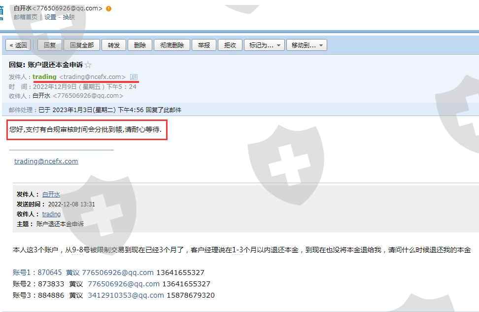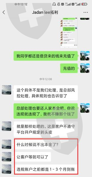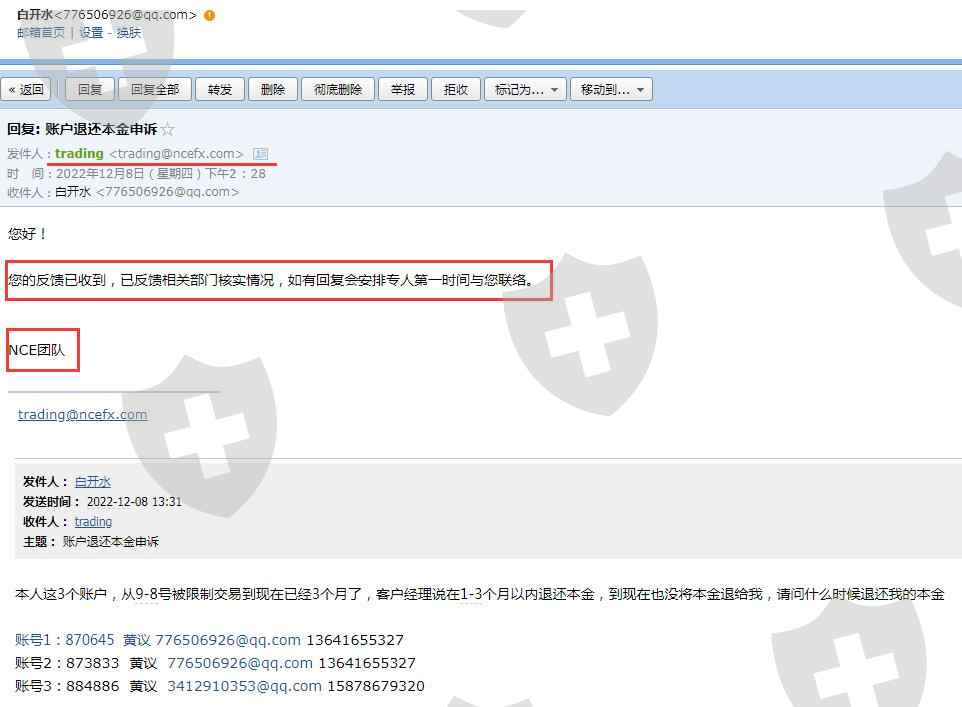 1.本人有3个账户,账号1 : 870645 账号2 : 873833 账号3 : 884886 ,在拓利这个外汇平台开户了有接近5年时间,2022年9月份拓利TRI这个平台和澳联国际NCE平台合并之际,本人这3个账户就披限制交易,至今已有半年时间。 2.拓利未合并到NCE之前,我的账户一直正常出入金,合并之际,无端限制我的账号,没办法交易,也没办法出金,也没有任何人通知我。 3.本人没有任何违规操作,拓利在没有任何理由的情况下说我违规了 ,如今申诉无门,我的本金也未退还给我。 4.当时与客户经理协商了很多次之后,客户经理说拓利会在1-3个月以内退还本金,但是直到现在,拓利也没将本金退还给我。 5.本人已经多次反馈了 , 2022年11月份,NCE官方邮件告知我平台会尽快退还本金,但是至今没有一个明确的答复。 6.本人3个账户里的本金有7万多美金,本人要求拓利立即退还回来。