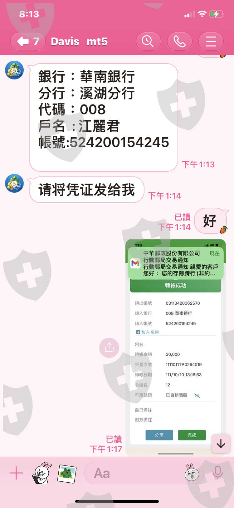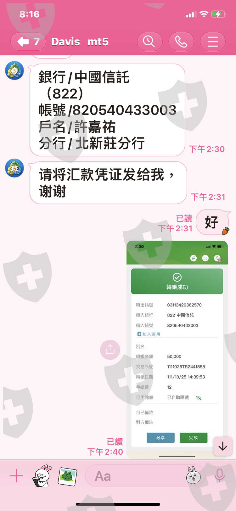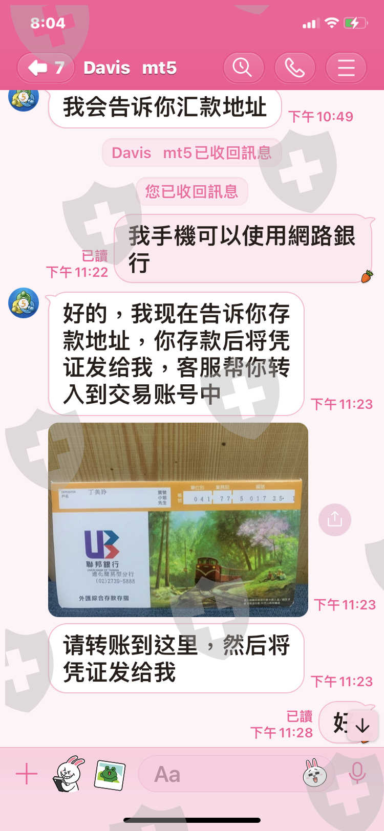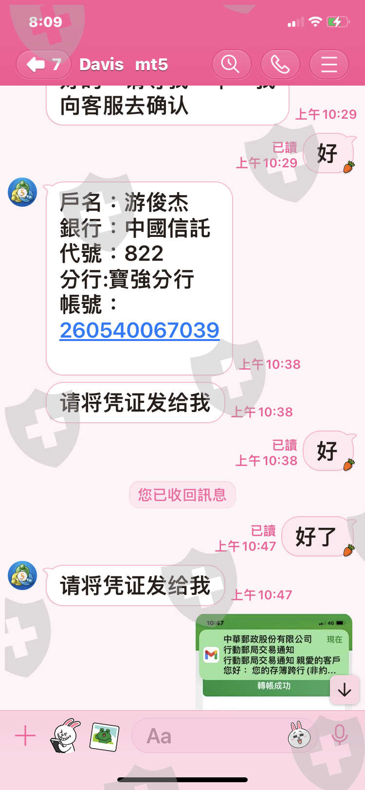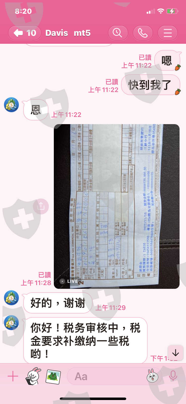 去年10月中對方說要出金,到現在還用各種理由回無法出金,一個當白臉一個當黑臉,根本就是要吃掉我的資金,還有幾張匯款單,線上只能傳9張,還有我朋友也從他那裡匯四十萬台幣,但是他忘了傳匯款單給我,他們收款那裡都會有紀錄,麻煩幫幫我,謝謝