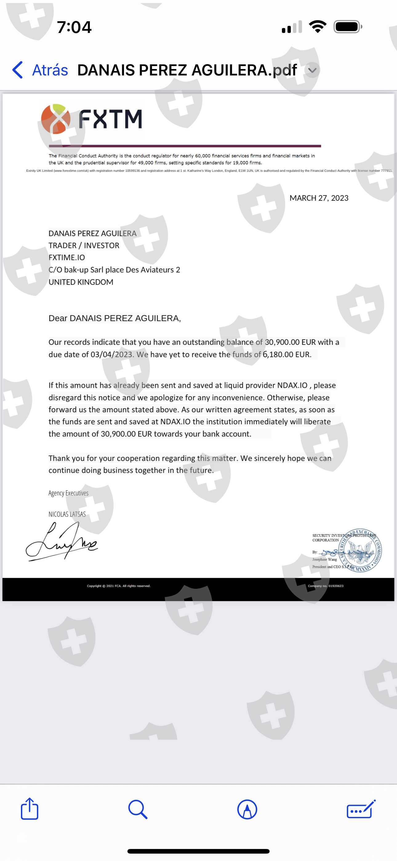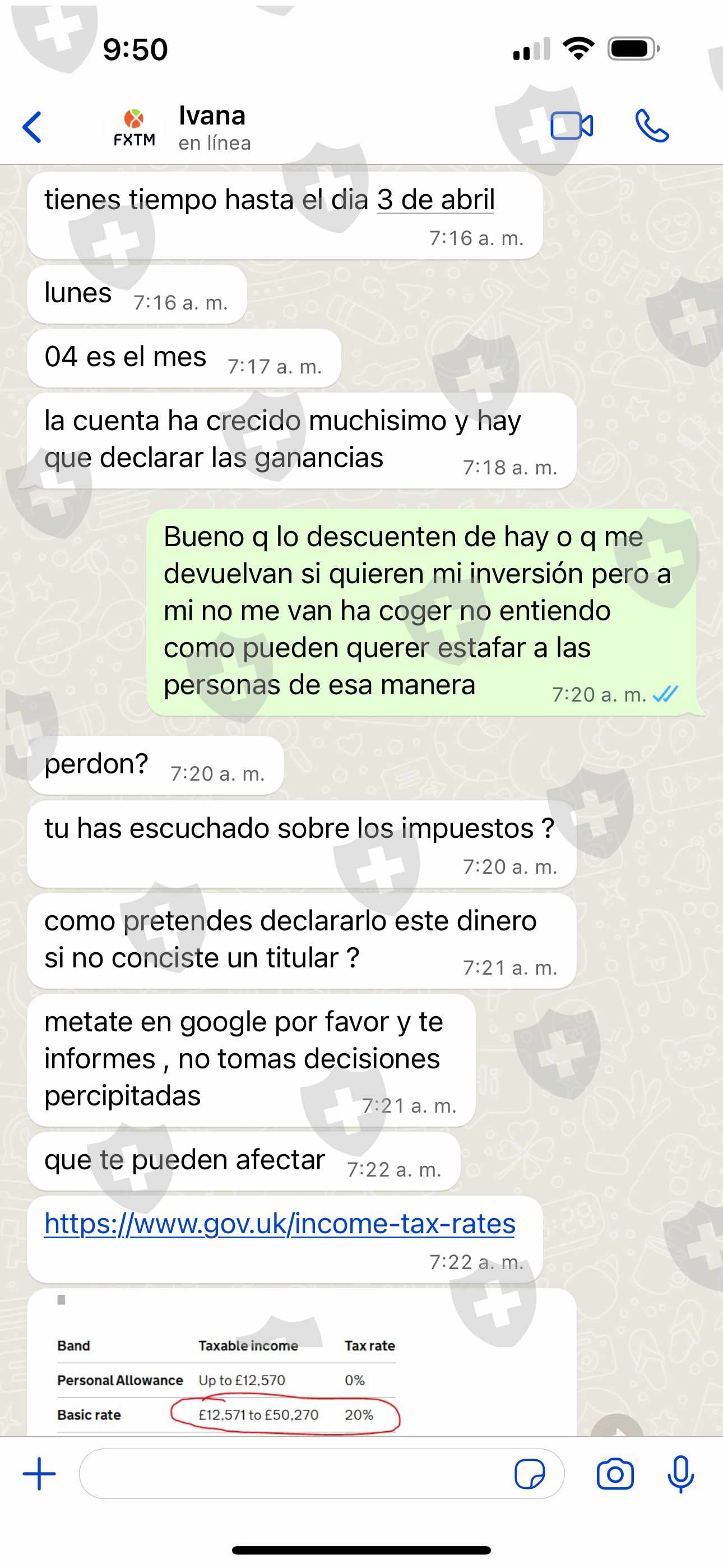canadiense y los depositamos le dije q por ese dinero tenía q pagar un interés mensual de 600 dólares canadienses y me dijo q eso lo podíamos sacar q no era problema pero después me enteré de esta página de y me pude dar cuenta q esta compañía FXTIME no es regulada y la brokers me enseñó los datos de esta otra compañía q se llama FXTM a la cual le escribí y me dijeron q ellos no tenían nada q ver con FXTIME entonces le puse mas atención a las operaciones q hacía la brokers y me di cuenta q movía la gráfica en ganancia ya q obtenía muy buenas ganancias yo le dije q quería sacar la inversión y me comenzó a poner trabas q eso no se podía hacer q tenía q serrar la cuenta y sacar todo el dinero y le dije q estaba bien q lo iba ha sacar todo y serrar la cuenta pero ella me envío un documento q dice q yo tengo q depositar 6180 euros de impuestos antes del día 4 de abril del 2023 y si no los deposito pierdo todo mi dinero q ya hay 30900 euros pero yo se q si yo deposito me van ha estafar y tengo miedo ya q tengo invertido 7930
