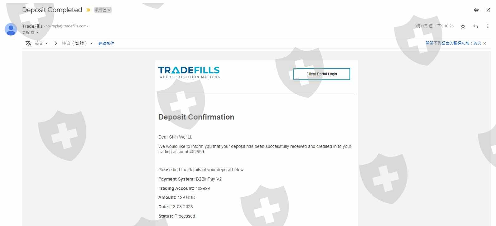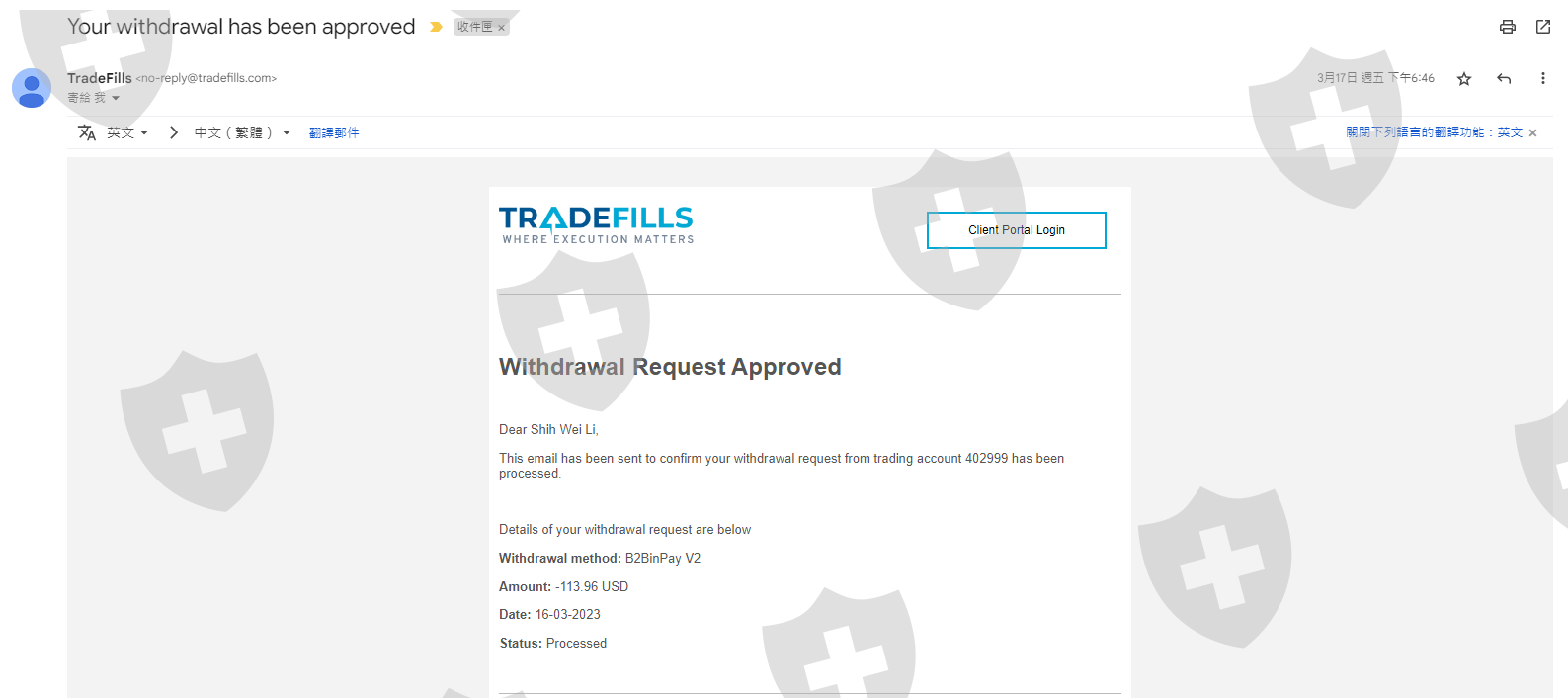 本人於2023/03/13註冊 Tradefills 平台交易帳戶並透過USDT-TRC20入金129 USD(如附圖),之後於2023/03/16申請透過USDT-TRC20出金113.96 USD(如附圖),TradeFills於2023/03/17通過我的出金申請,但是我並沒有收到款項,後續寫信給客服沒有得到任何回信(如附圖),2023/03/24平台將我的客戶端後台關閉無法登入,2023/04/06TradeFills官網https://www.tradefills.com/已經無法進入了且客服信箱support@tradefills.com也無法接收信件了