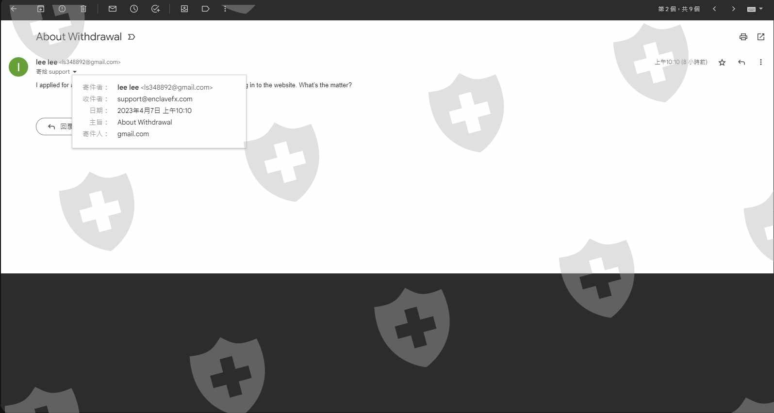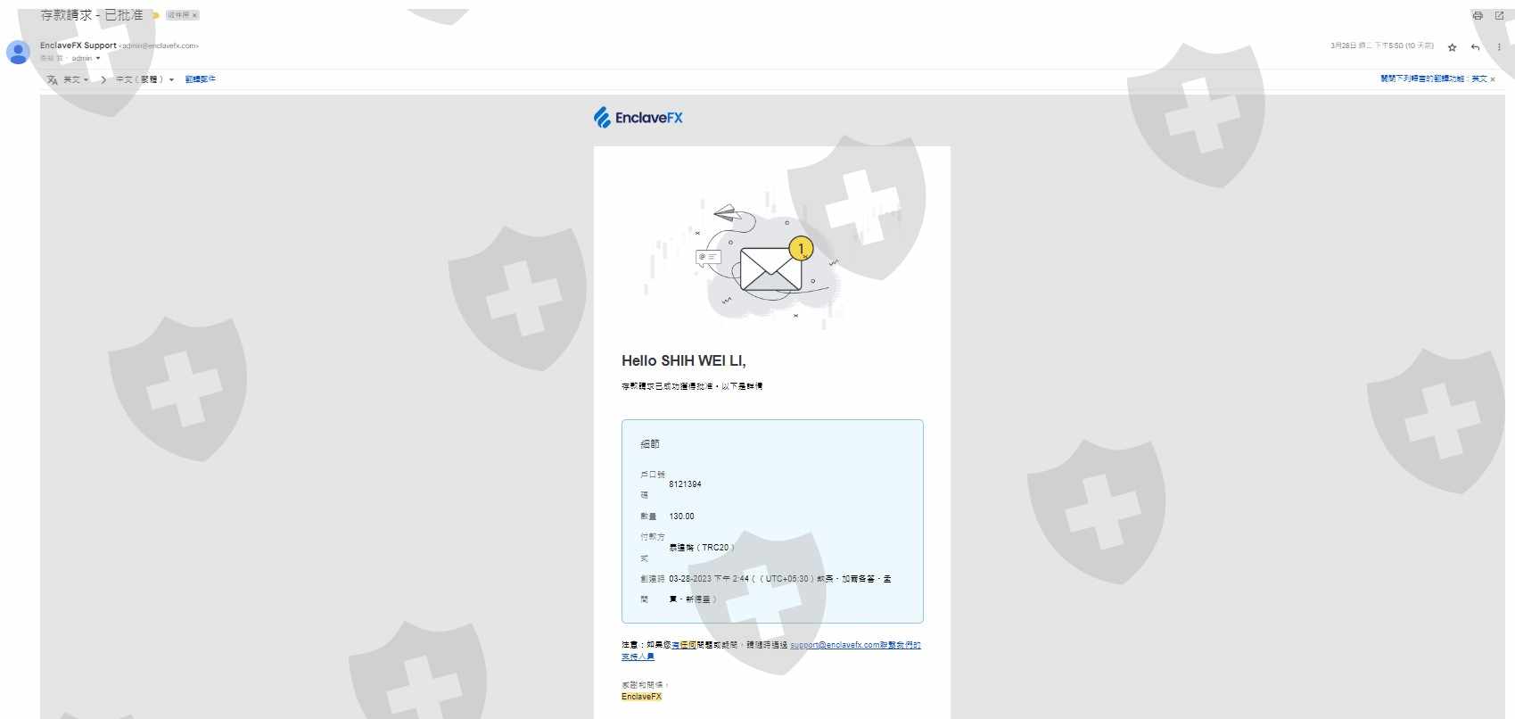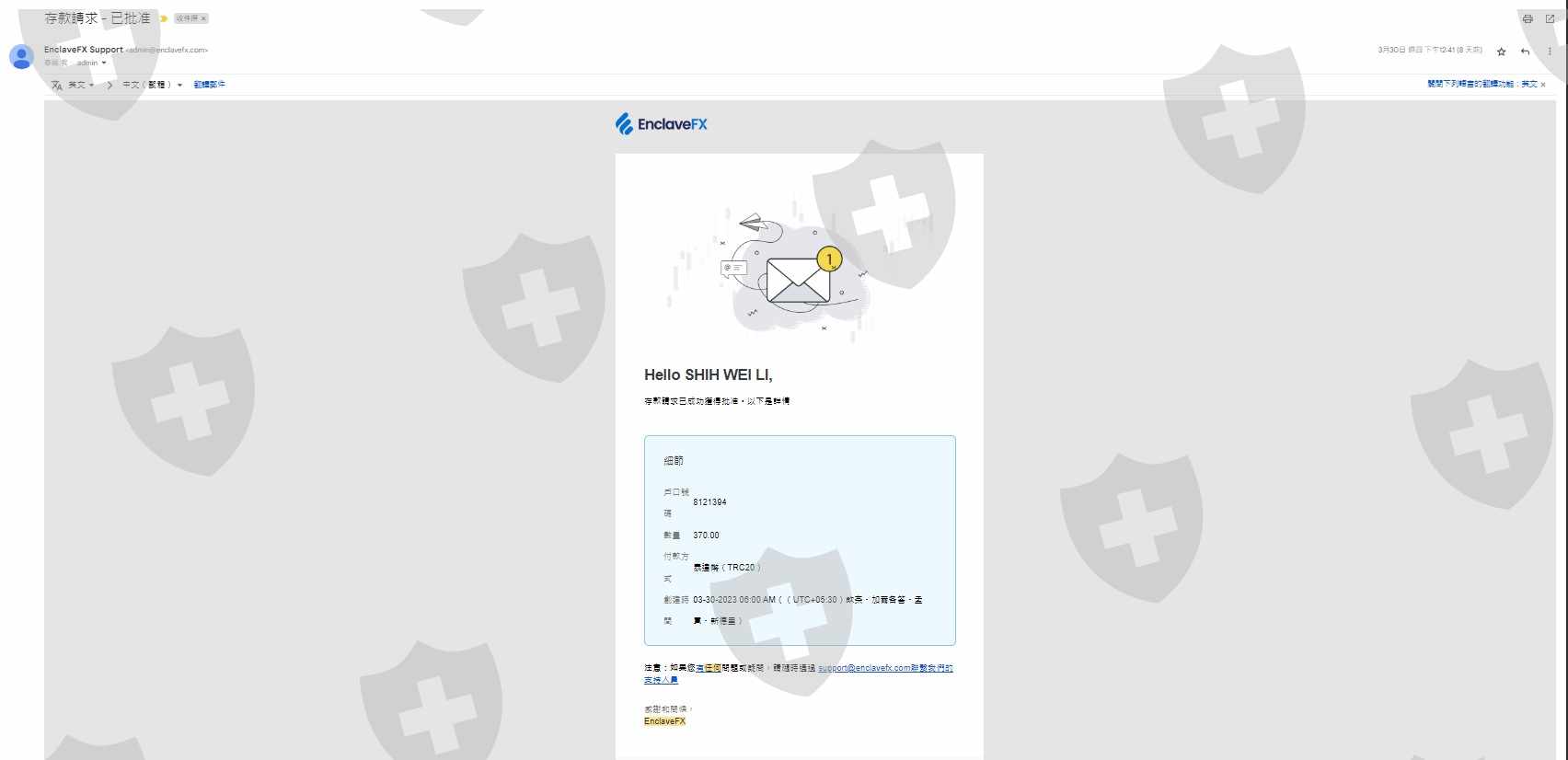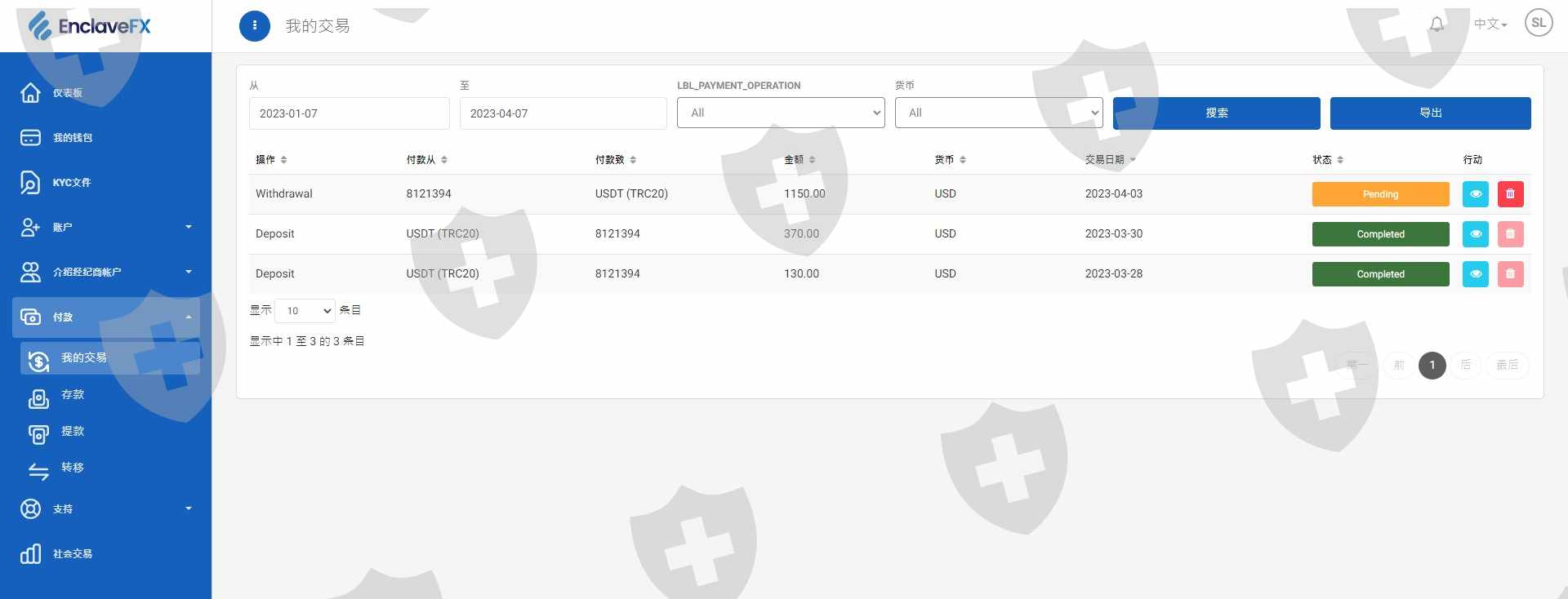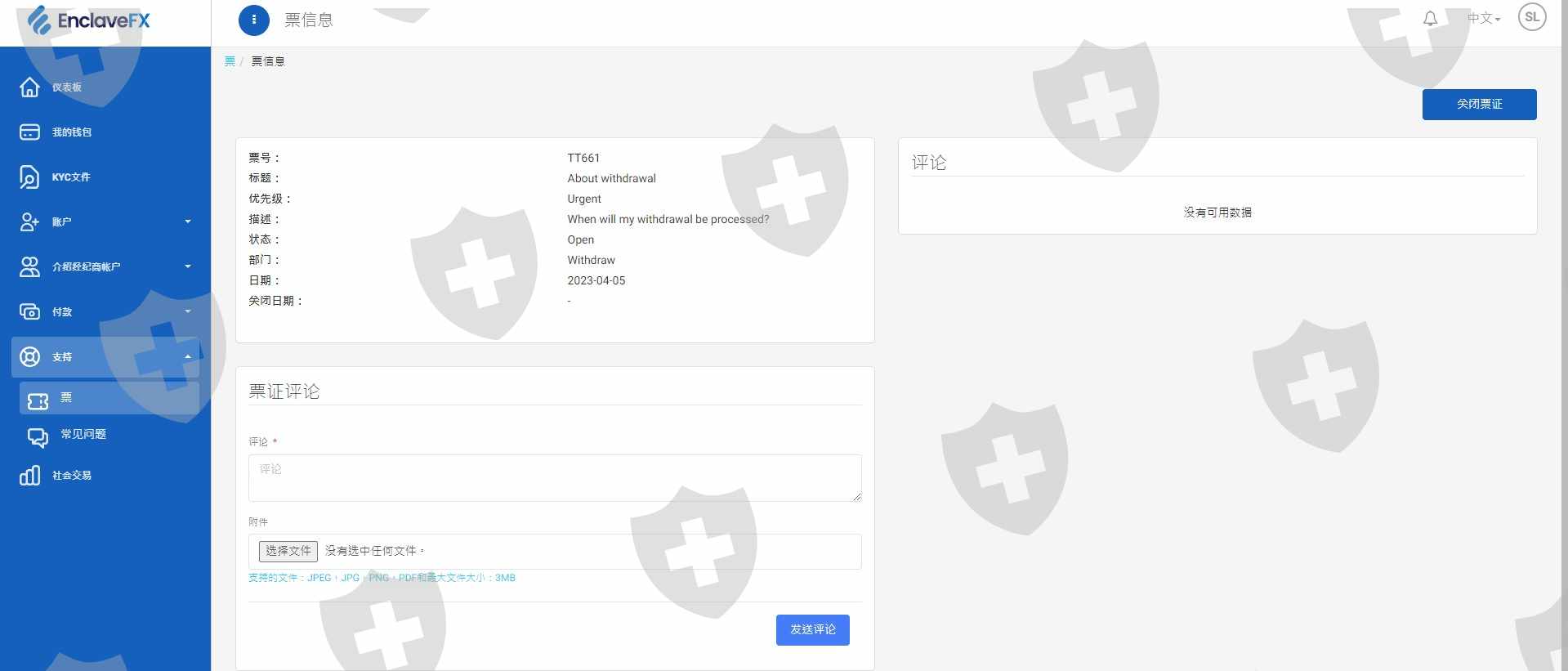 本人於2023/03/28開設EnclaveFX交易帳戶,於2023/03/28透過USDT-TRC20入金130 USD(如附圖),並於2023/03/30透過USDT-TRC20入金370 USD(如附圖),2023/04/03透過USDT-TRC20出金1150 USD(如附圖),一直到今天2023/04/07都沒有處理出金,寫信給客服沒有任何回復(如附圖),後台開票也沒有任何回應(如附圖)