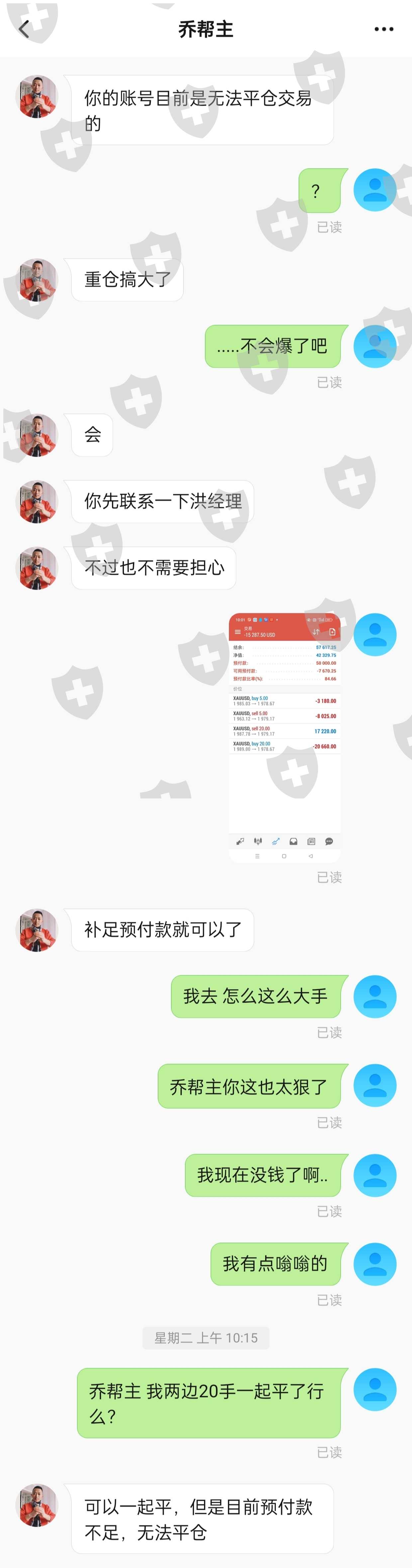 乔帮主,王老师什么的和洪经理是一伙的都是骗子,引导我们把账户给他们操作然后恶意锁仓,不让操作只让补保证金,不补每天扣保管费还不够还要再扣3000美元,不补仓强制平仓了也继续扣。吃相恶心,什么瘫痪在床的妻子,什么几百万美元的账户都是故事。