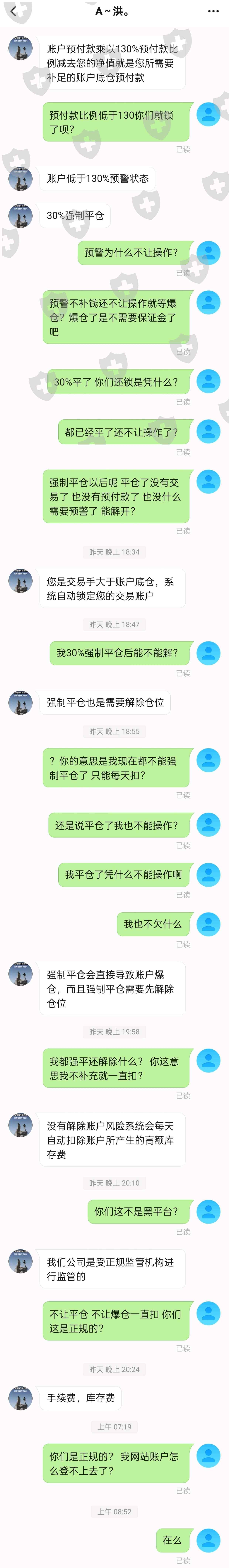 乔帮主 王老师什么的和洪经理是一伙的都是骗子,引导我们把账户给他们操作然后恶意锁仓,不让操作只让补保证金,不补每天扣保管费还不够还要再扣3000美元,不补仓强制平仓了也继续扣。吃相恶心,什么瘫痪在床的妻子,什么几百万美元的账户都是故事。