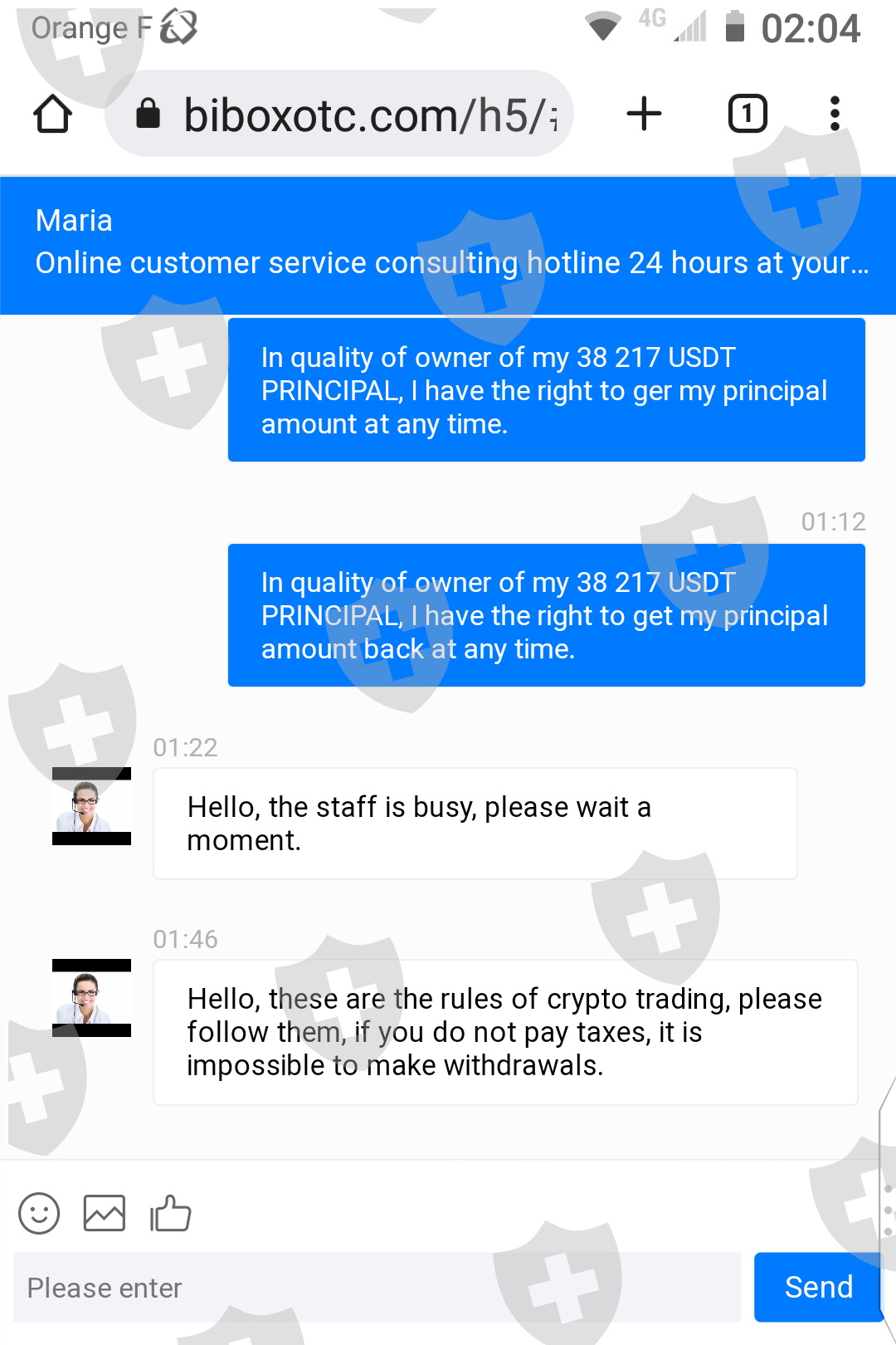 BIBOXOTC.com : SCAM : IMPOSSIBLE withdrawal of 255,09 KUSDT (55 KUSDT personal income tax payment is asked by Online Customer Service to withdraw).