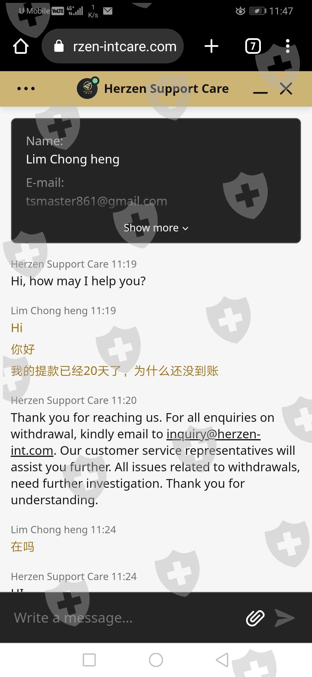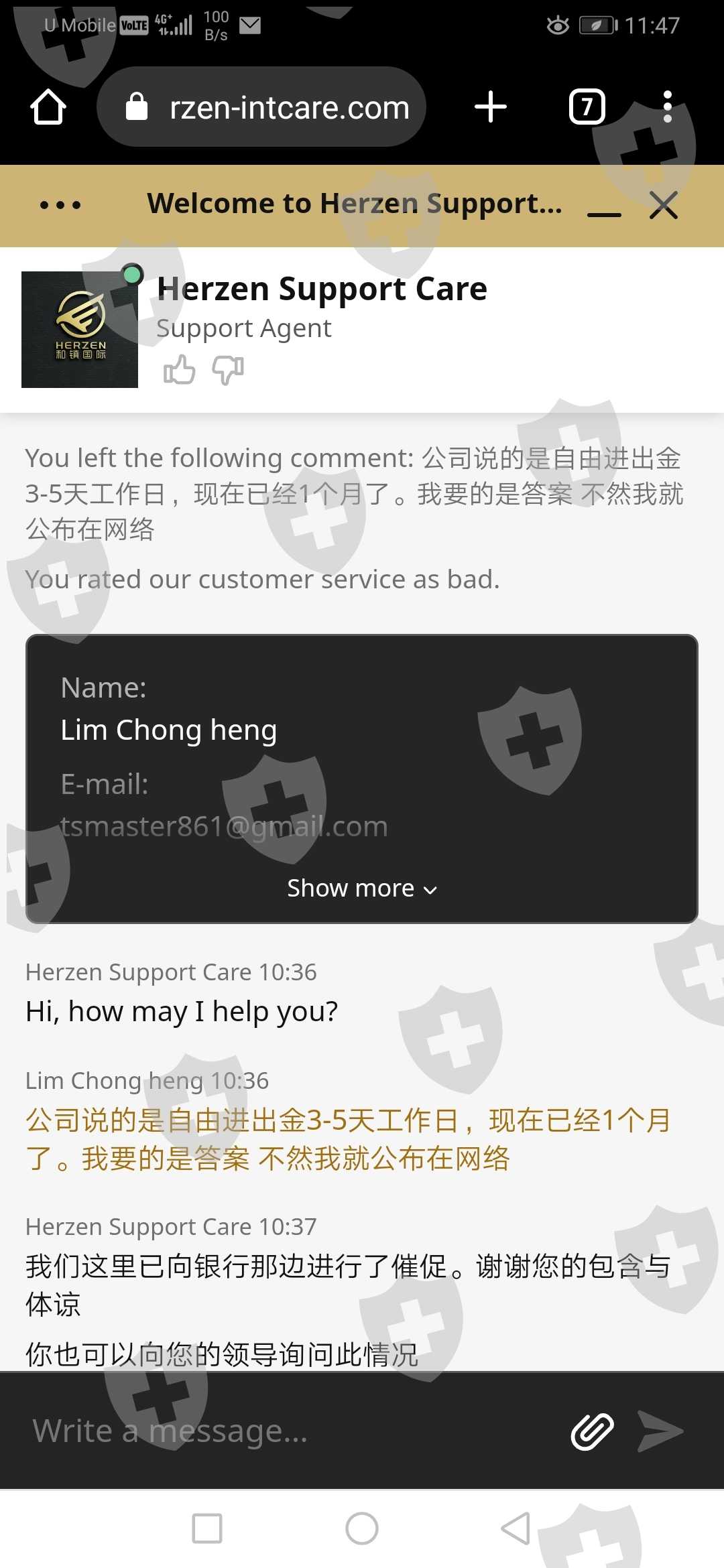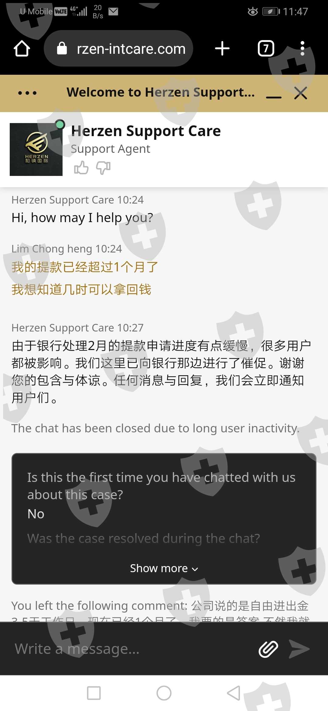 公司答应5-7工作日自由进出金,就是个骗话,我2月14日号提的本金10000,足足等了2个月,在这过程中我一直有跟公司客服follow, 但是都是踢足球上线推herzen,herzen推AIFC, AIFC更死借口多多竟然说labuan户口被冻结.看截图对话。最后一次上公司见老板给出的解决方案是把10000本金分三次拿,我也跟着做3500 3500 3000,结果等了10多天钱又没收到,只是公司发来email(email里的名字也故意写错) 要求一堆无理的出金规则,一个字 就是 赖.... 希望公司出来解决 不然我就发到社交媒体.我把以下对话跟证据全发出来