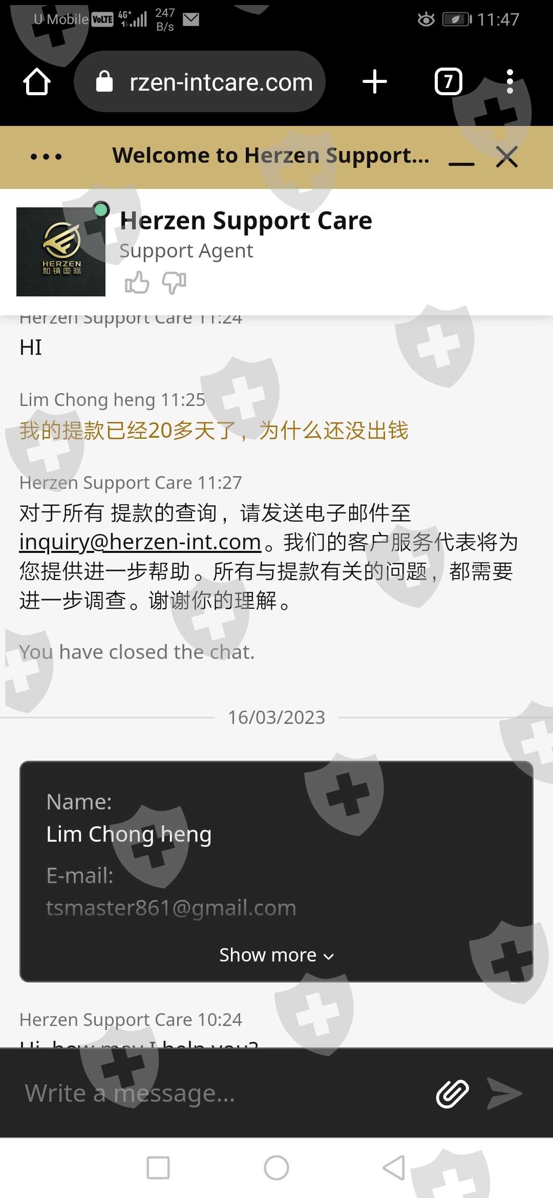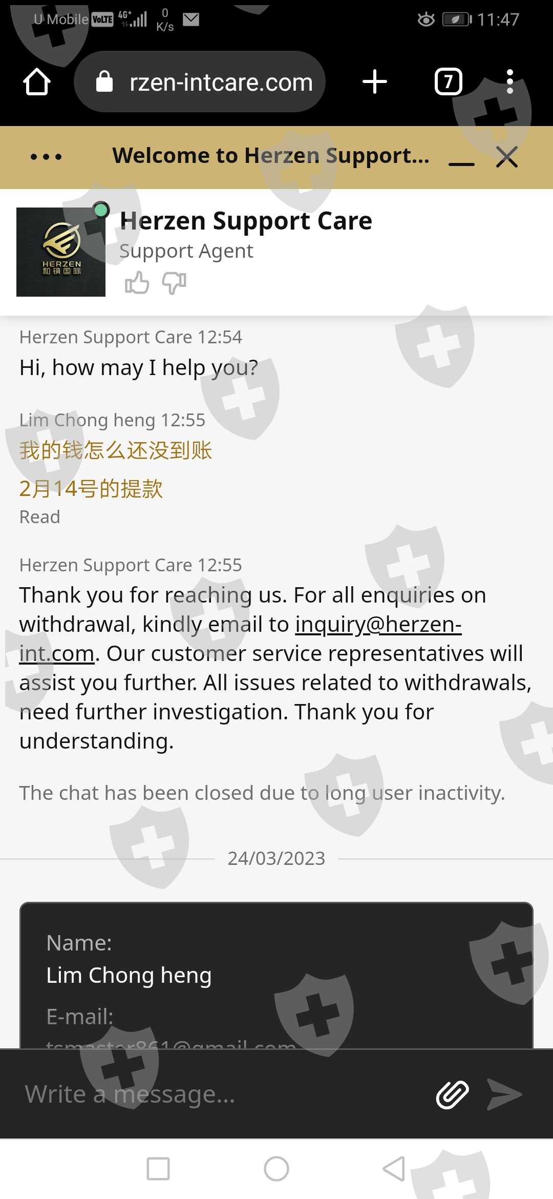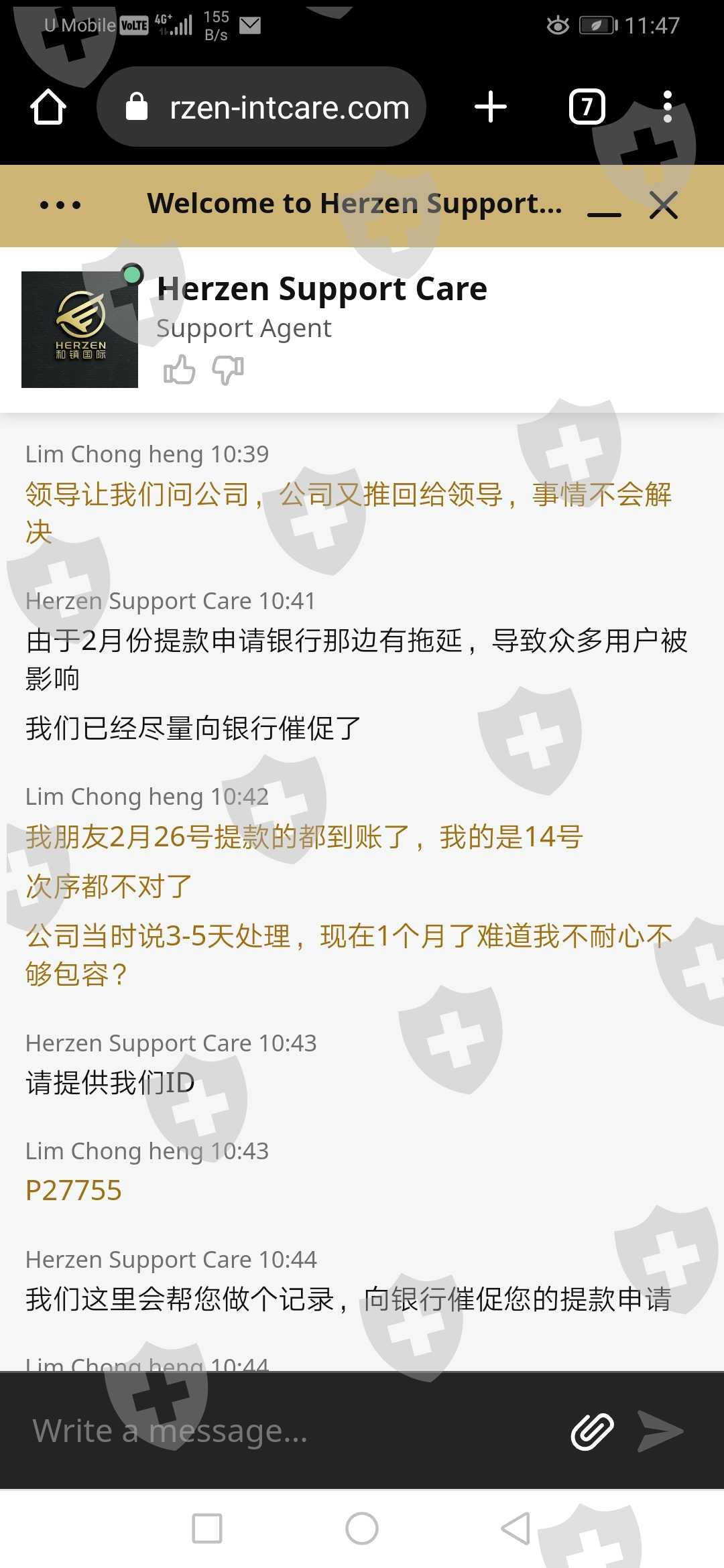 公司答应5-7工作日自由进出金,就是个骗话,我2月14日号提的本金10000,足足等了2个月,在这过程中我一直有跟公司客服follow, 但是都是踢足球上线推herzen,herzen推AIFC, AIFC更死借口多多竟然说labuan户口被冻结.看截图对话。最后一次上公司见老板给出的解决方案是把10000本金分三次拿,我也跟着做3500 3500 3000,结果等了10多天钱又没收到,只是公司发来email(email里的名字也故意写错) 要求一堆无理的出金规则,一个字 就是 赖.... 希望公司出来解决 不然我就发到社交媒体.我把以下对话跟证据全发出来