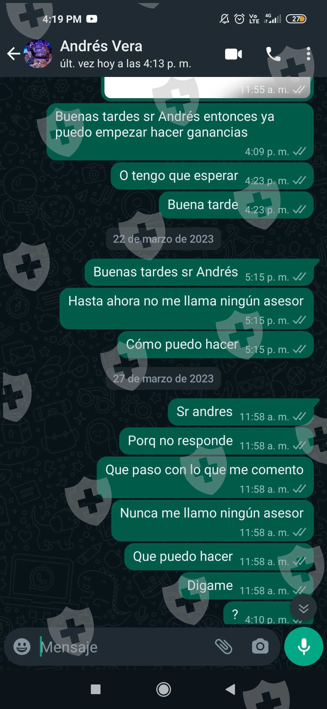 Buenas tardes , mi nombre es Victor Marcelo didimo cauper yengle , soy una persona que trabaja sueldo mínimo y tengo muchas responsabilidades, un día ví un anuncio de Warren bowie Smith que podría ayudarme económicamente , me anoté en una encuesta y a los días me llamaron un joven que me dijo que se llamaba Andrés vera , diciéndome que tenía que empezar invirtiendo 200$ que me arriesgue que iba hacer una buena inversión no iba perder nada , me arriesgue inviertiendo 200$ en partes porq no me alcanzaba el dinero tuve que esperar que me paguen para poder completar , entonces después de invertir me dijo que me.llamaria un acesor para acesorarme y me pueda explicar cómo hacer dinero en esta plataforma , pero nunca me llamaron , trate de comunicarme y ya no me daban respuesta , me intente comunicar tbm con los número de atención al cliente por llamada y por whasssp dónde no me ayudaron y tampoco me daban repuesta , ahora solo quiero recuperar mi dinero pero me niegan la solicitud de retiro por favor necesito que me ayuden a recuperar mi dinero por favor soy una persona que bajo recursos necesito mi dinero por favor como puedo hacer