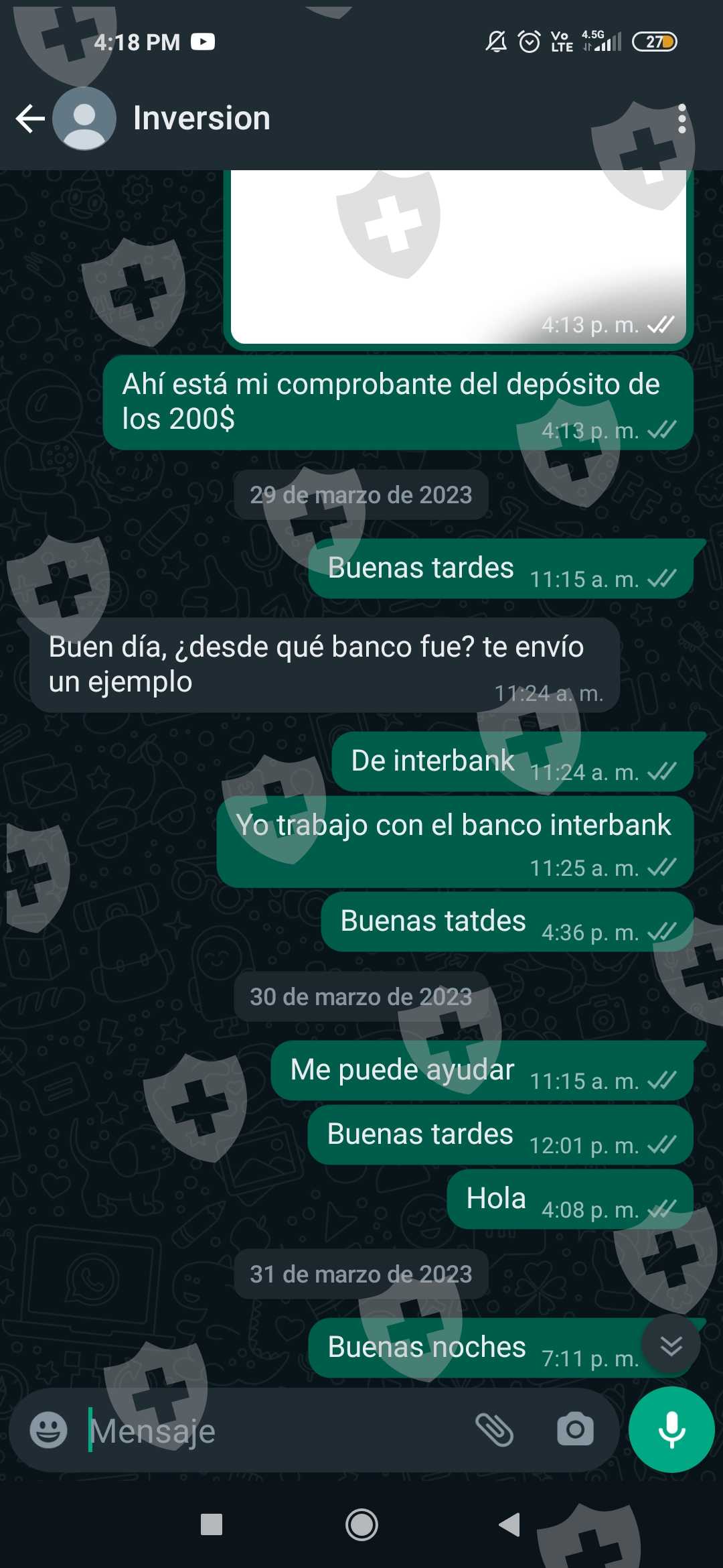 下午好,我叫 Victor Marcelo didimo cauper yengle,我是一名从事最低工资工作的人,我有很多责任,有一天我看到 Warren bowie Smith 的广告,他可以在经济上帮助我,我报名参加了一项调查和几天后,他们称我为年轻人 他告诉我他的名字叫安德烈斯维拉,告诉我我必须先投资 200 美元来冒险,我将进行一笔不错的投资,我不会损失任何东西,我冒险投资200美元零件,因为钱不够,我必须等待他们付钱给我才能完成,然后投资后他告诉我,代理人会打电话给我并解释如何赚钱在这个平台上,但他们从来没有给我打电话,我试图联系他们,他们不再给我答复,我也尝试通过电话和whasssp与他们联系客户服务号码,但他们没有帮助我,他们没有给我一个答案,现在我只想收回我的钱,但他们拒绝了我的提款请求,我需要你帮我收回我的钱,我是一个资源匮乏的人,我需要我的钱,我该怎么办