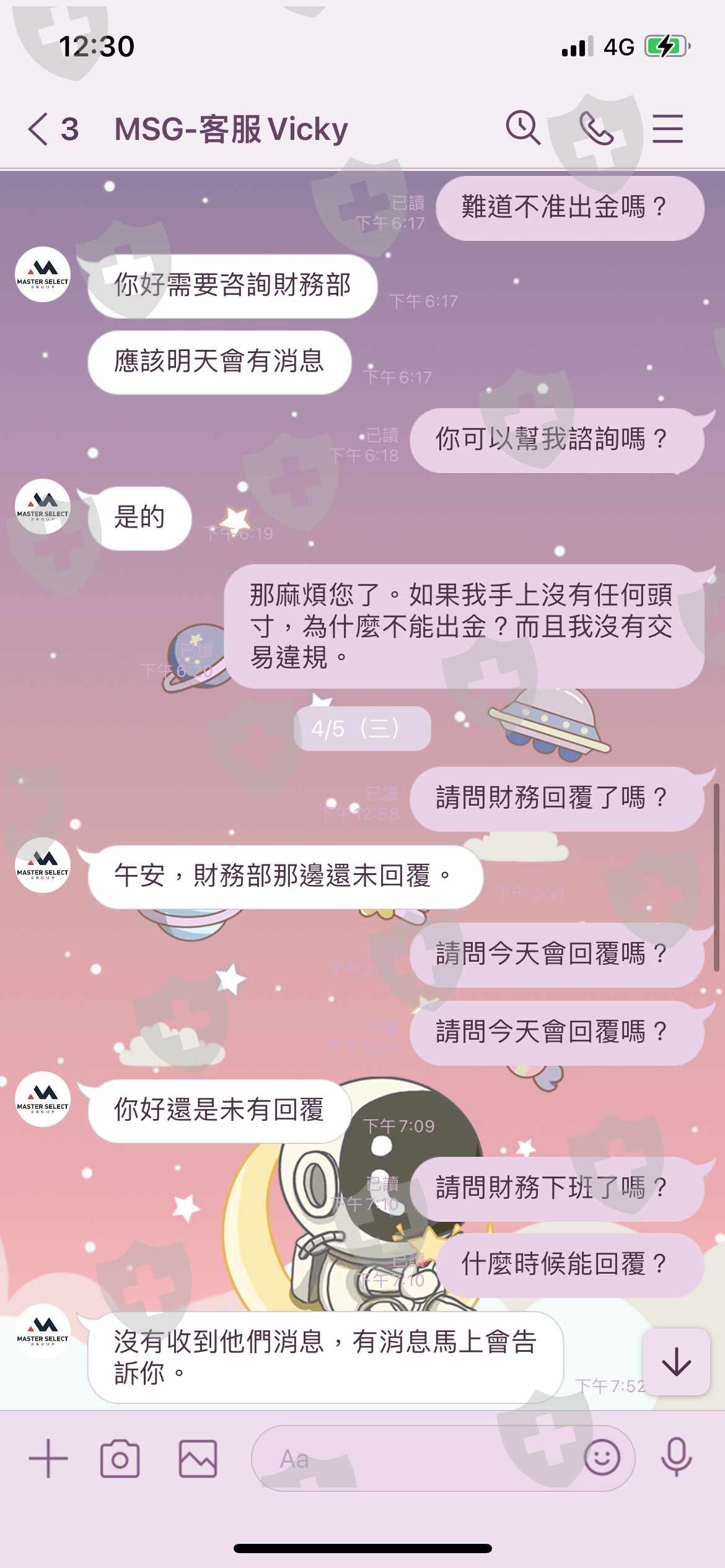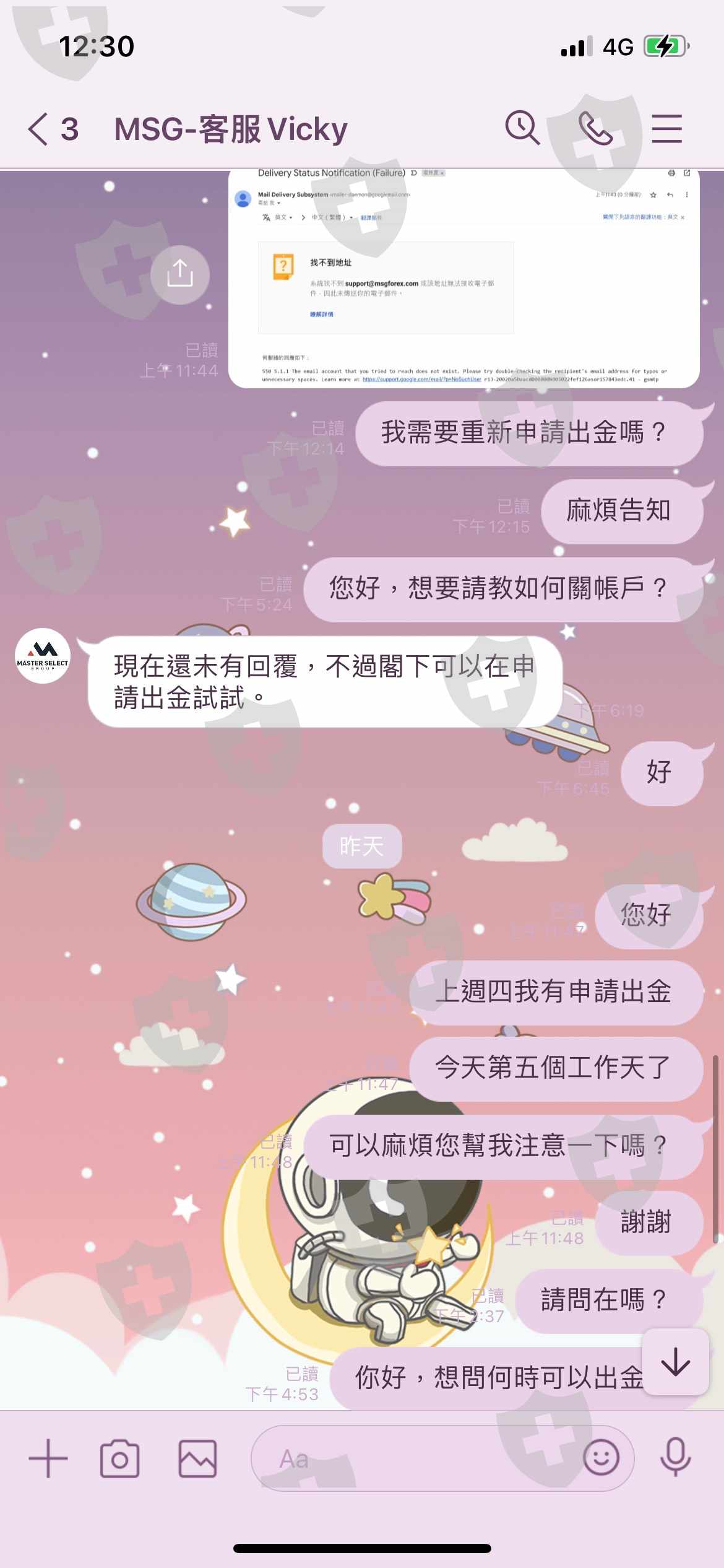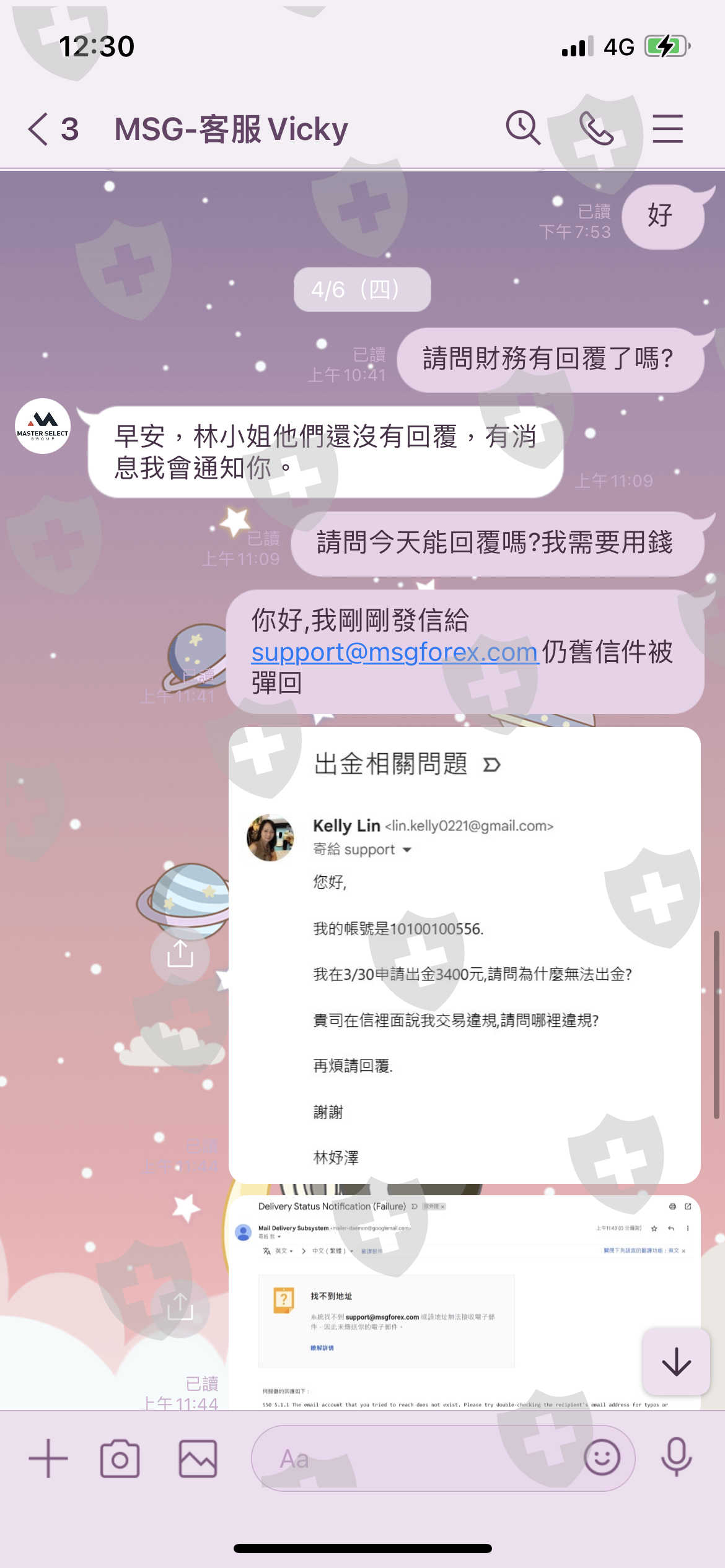 我在2023/3/29將所有頭寸平倉並申請出金美金3400元,MSG在2023年4月4日收到有郵件說不讓出金因為交易違規。但我沒有任何違規事項,所以發Line詢問客服。客服諮詢財務很多天都沒有告知原因。我發了郵件到support@magforex.com詢問出金相關問題時,郵件被彈回來。再度打官網客服電話一樣是空號。