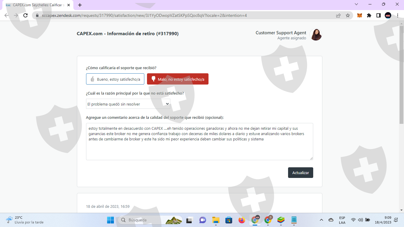 我在这个平台上存了 180 美元,他们给了我 100 美元的奖金。我开始交易获得了数笔利润,直到我达到 789 美元......然后我试图撤回它们,这个腐败的经纪人告诉我,我只有 252 美元,并且由于我的资本最低,利润将被消除应该有 Capex简而言之,在第一次提款前 90 天,他们骗了我,我有 547 美元或更多的利润,他们从我这里拿走了……你可以看到图像证据,与支持人员的对话真的是经纪人的垃圾…… .. 保持距离 Capex!!!!!!