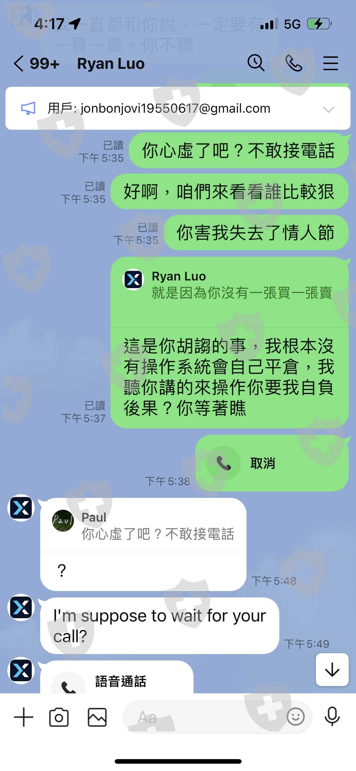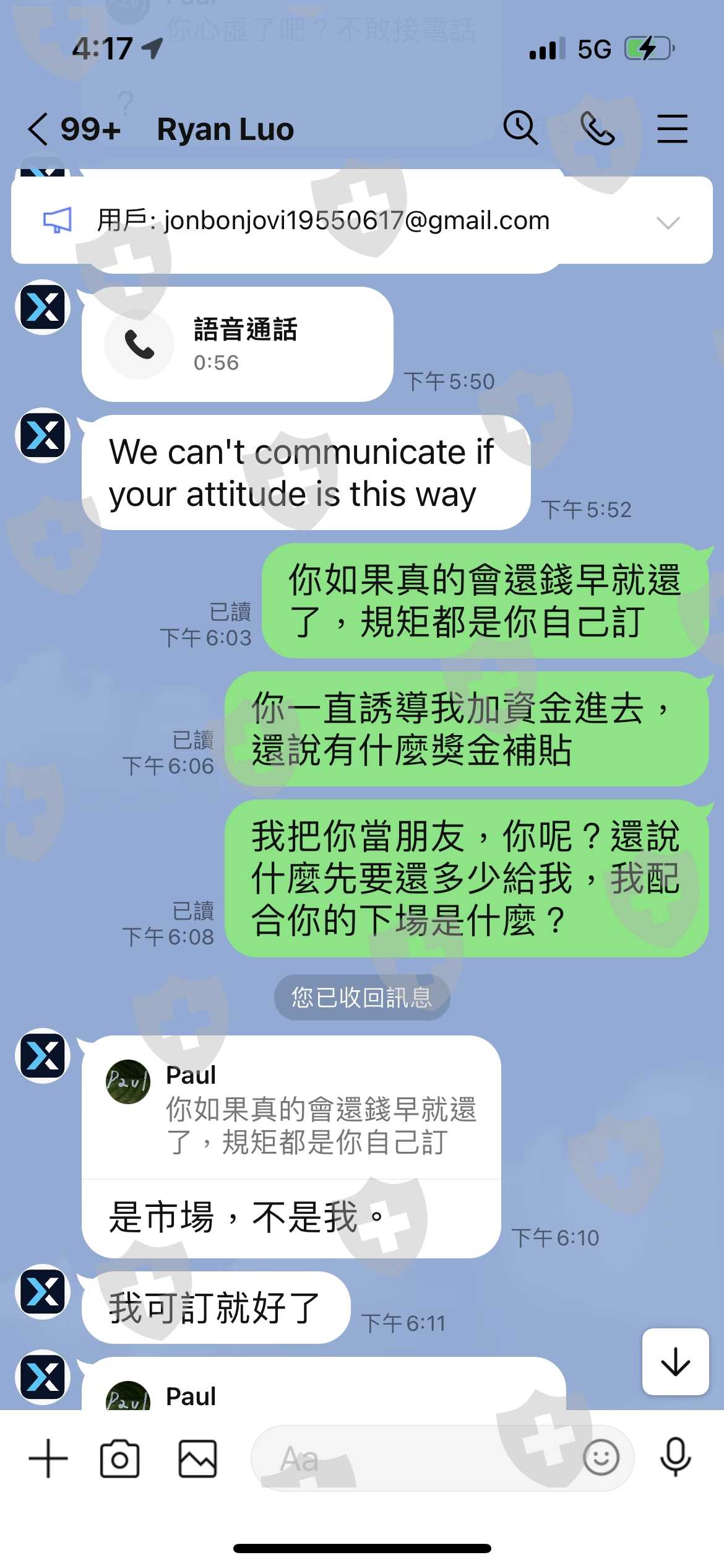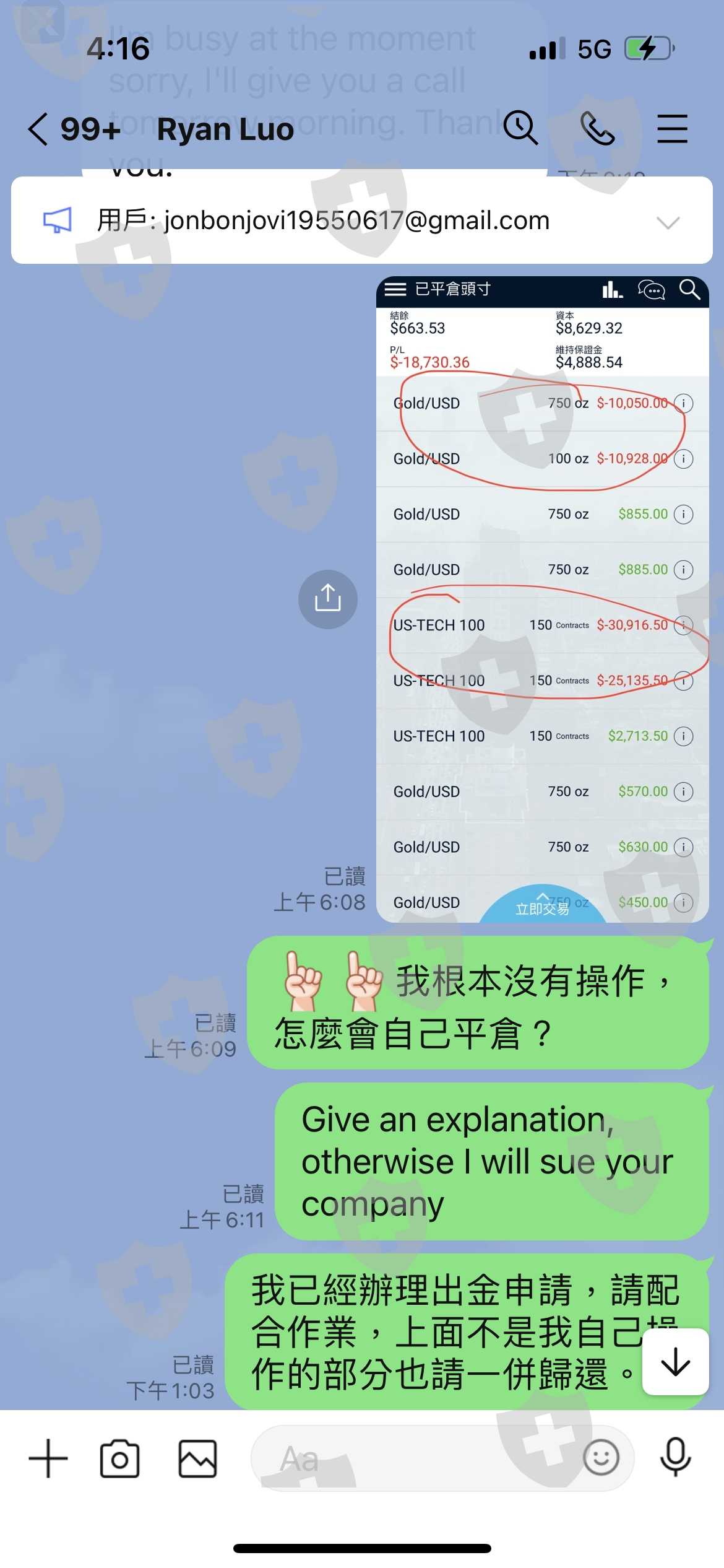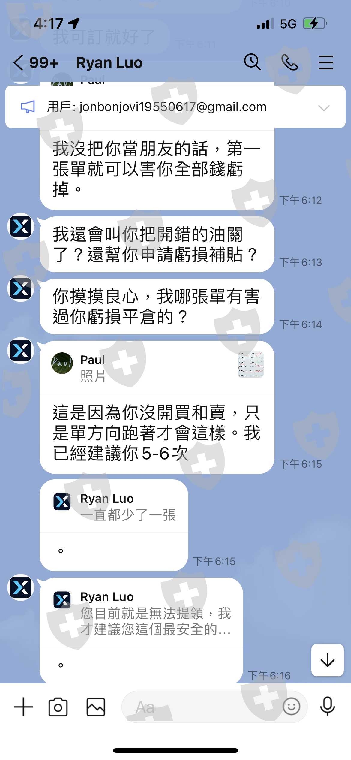 这平台从来没有主动告知客户应注意的投资理财风险,客户已提出退款申请,该名业务员却滥用客户基础信任感导致投资失利,保证金低于水平将导致投资标的自动平仓却不主动说明,只见电邮通知,这些都是废话,最重要的是这公司的业务员擅自指导投资者进行操作,事后却不肯负担任何责任,甚至还告知投资者说你去告啊!你告不赢的!真是可恶至极