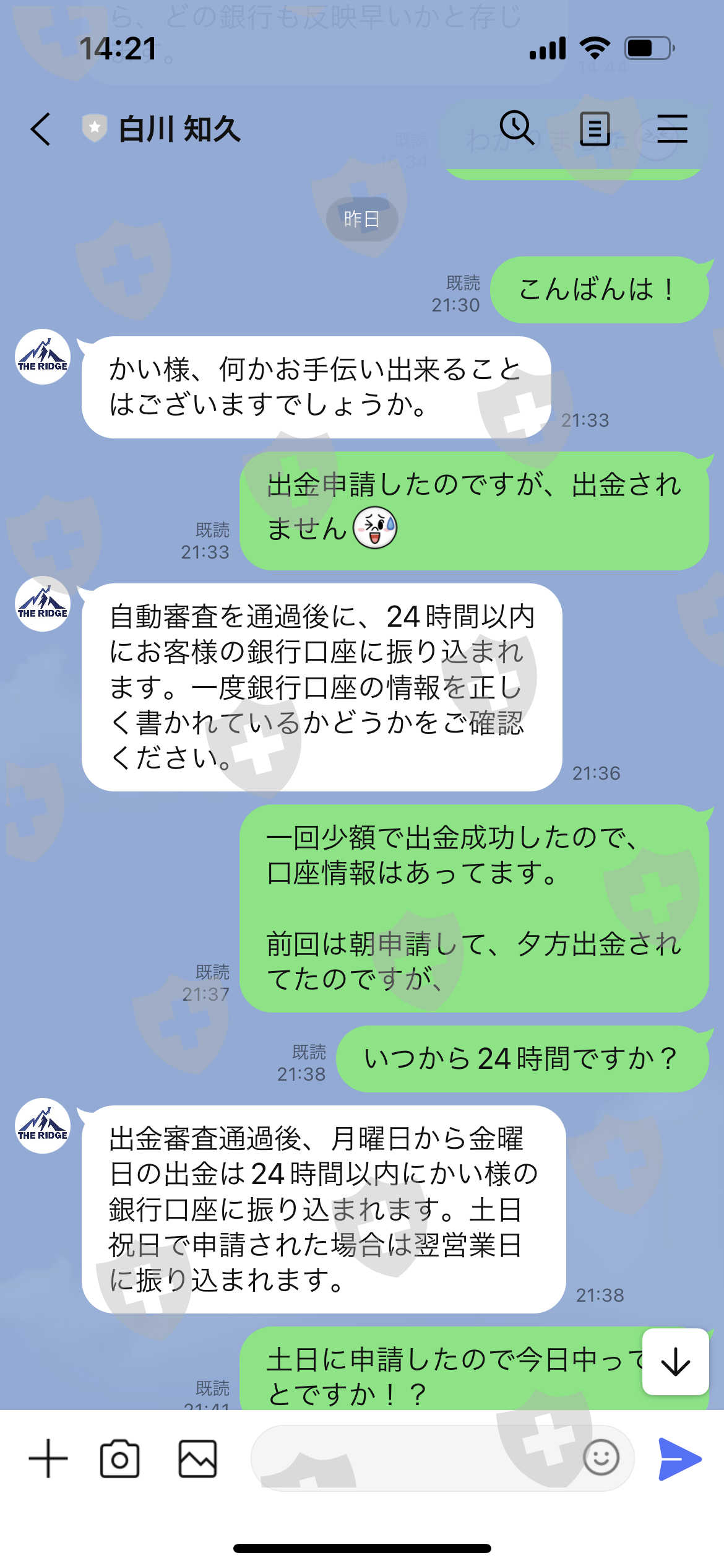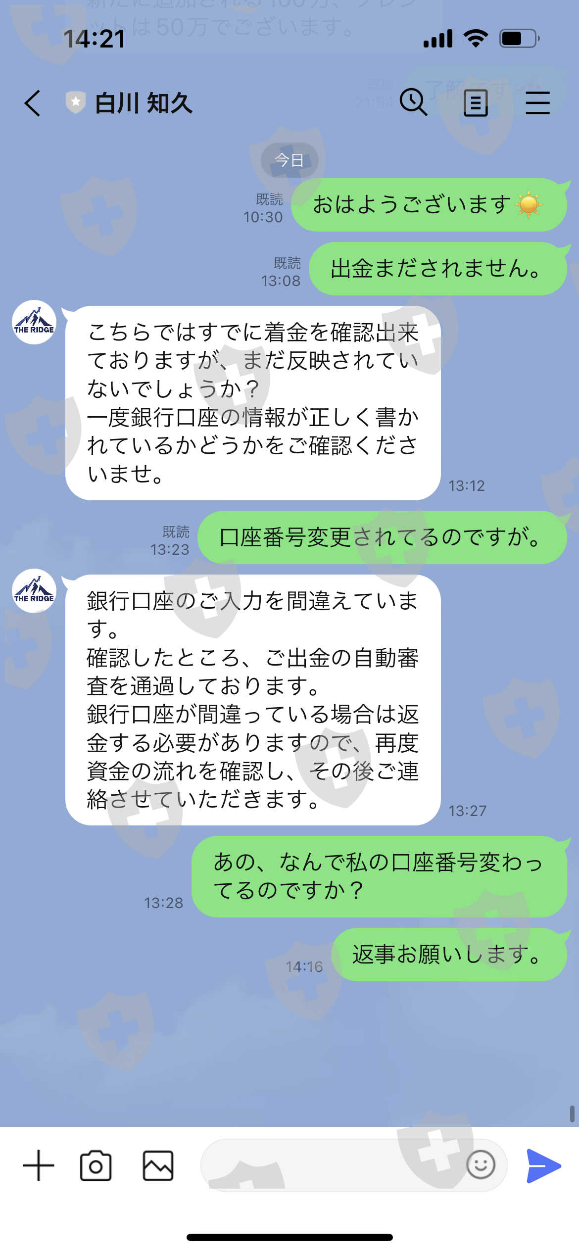 そしたら出金されないので。連絡したら口座番号の確認お願いします。ときたので確認すると口座番号が一箇所改ざんされて、いました。