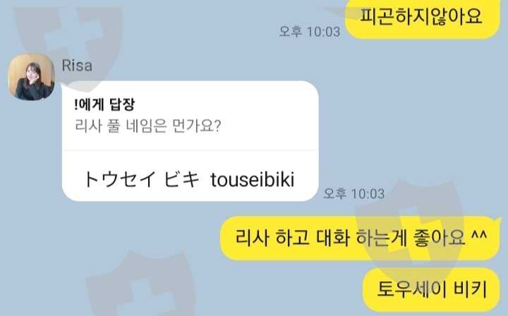 I'm not tired 10:03 PM Reply to Risa! Is Lisa's full name far away? トウセイ ビキ touseibiki 오후 10:03 리사 하고 대화 하는게 좋아요 ^^