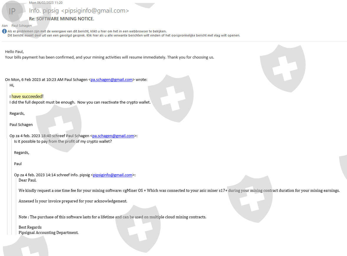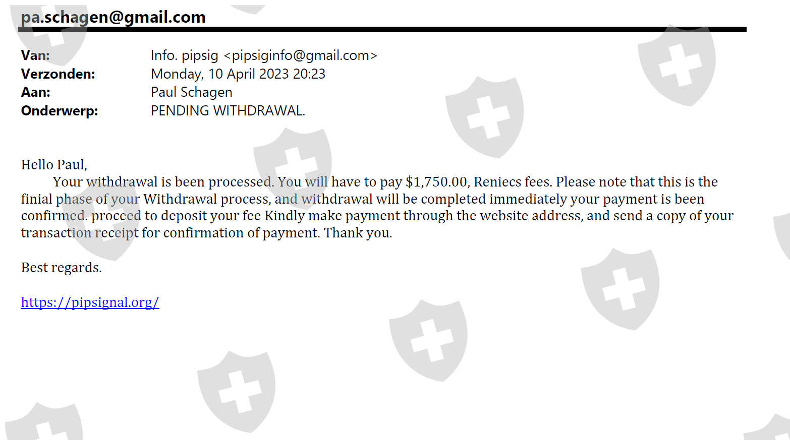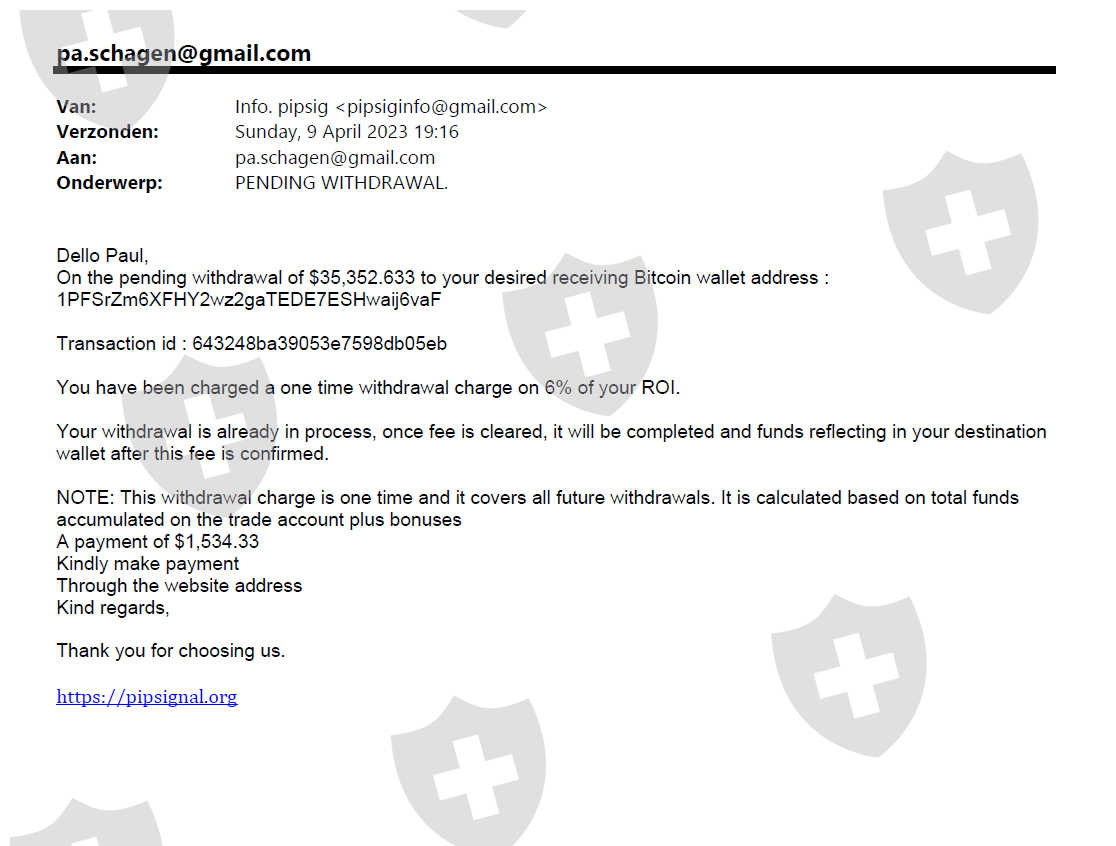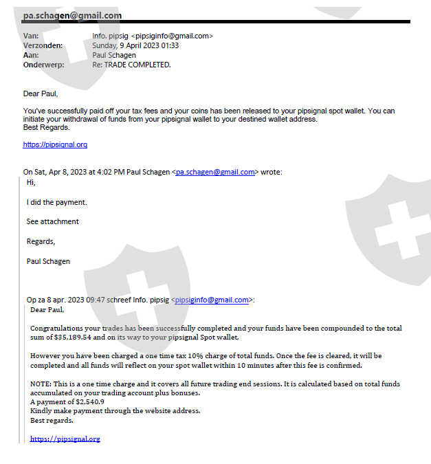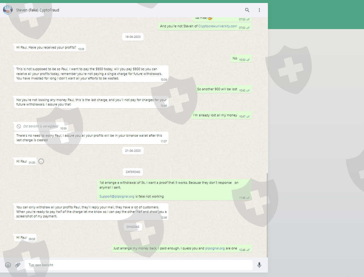 I have been scammed. He approached me through the official youtube channel of https://www.youtube.com/@CryptoCrewUniversity. And it looked to me that it was really Youtuber Steven Courtney. Scammers business whatsapp account (+1 (469) 894-4306) still active. So i did anwer his whatsapp message. The way he talked was exactly how Steven talks on his YouTube channel. That was october 2022. He persuaded me to invest in www.pipsignal.org. To avoid my losses at Binance and slowly earn back in crypto. Started with a small amount but he convinced me to invest more and more the last months for long term investment. Because it was the time to invest with the current market. I also saw my wealth grow slowly. So...no problem I thought. And of last year I had to buy a mining software: cgMiner OS +. A few weeks ago I wanted to withdraw my investment (35.352,633USD). Then I had to pay Fee (taxes) after Fee. The last Fee I did not paid. I became suspicious. Try to withdraw with smaller amout, but nothing happens. My emails were no longer answered. Very simple they won't let me withdraw. I was scammed. Boiler Room Scam. Both the website and the Whatsapp number are still active! I sent a total of ADA: 5134.90834200 and BTC: 0.70863814 (€ 19.097,50) All our savings lost to the scammer. I have kept all screenshot and email whatsapp and other documents as proof. Plus a complete overview of the payments made via Binance.Scammer Wallet: ADA: addr1v89wcds4nv66te82hpkzc7fu8wrp0qpv5l8zfe2vxfa5h5sga52s4BTC: bc1qjw25p3k2agqzfgnm5a4agawa0q66t7jtx605xvBTC: bc1qtkefer2p7lkmcm2tjmsz0q8plw5kmsuanthyep How could I be so stupid to fall for this. Life is hard enough with 2 autistic children. Wanted to make life a little more bearable for our family. But the opposite has happened. Nowhere to go in the Netherlands. Crypto is not yet regulated!
