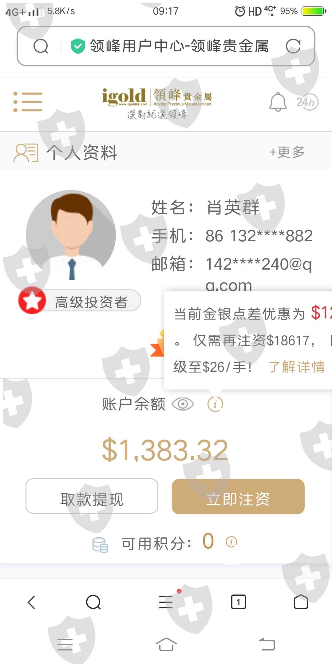 领峰贵金属未取得国内法定监管资质备案,非法通过百度及广告大肆宣传误导用户诈骗用户本金,通过非法渠道洗钱,本人账户13281783882在投诉后单方面强制限制用户账户,要求其退还冲值本金23460元!
