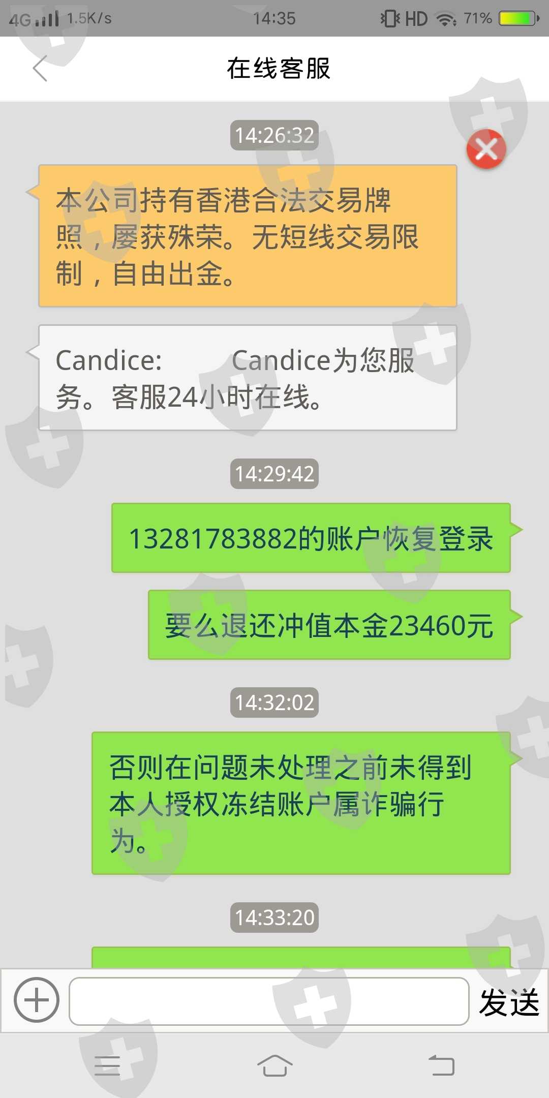 未取得国内法定资质备案非法从事外汇期货伦敦金银交易,诈骗用户钱款,要求退还冲值本金23460元。