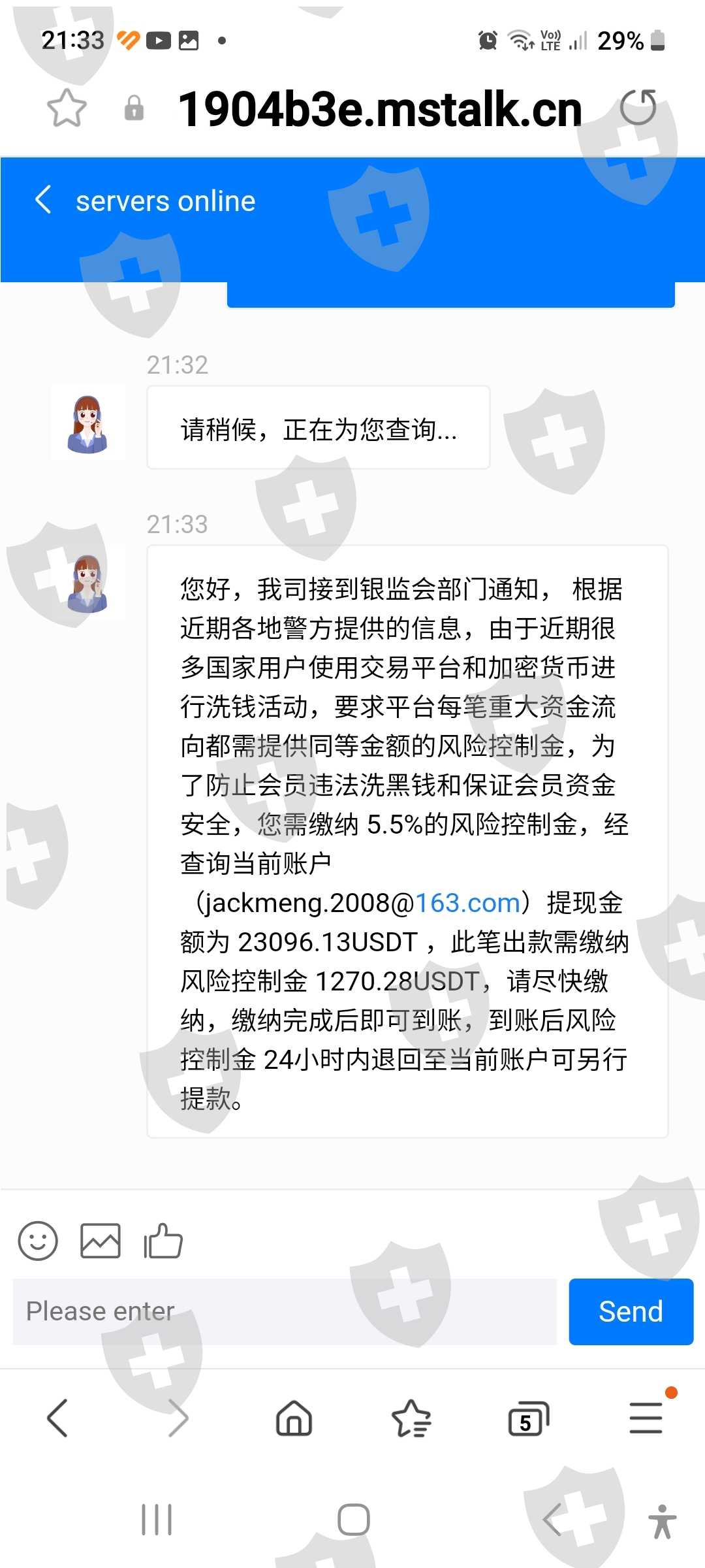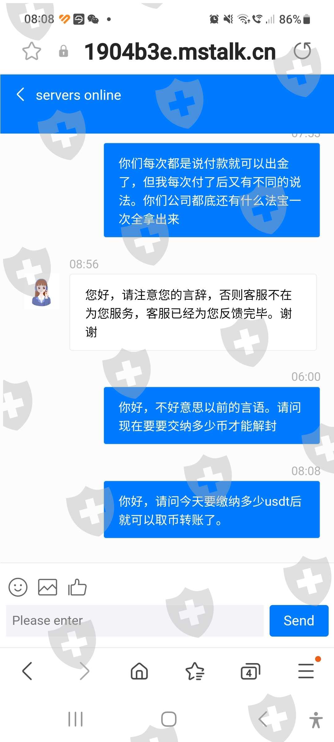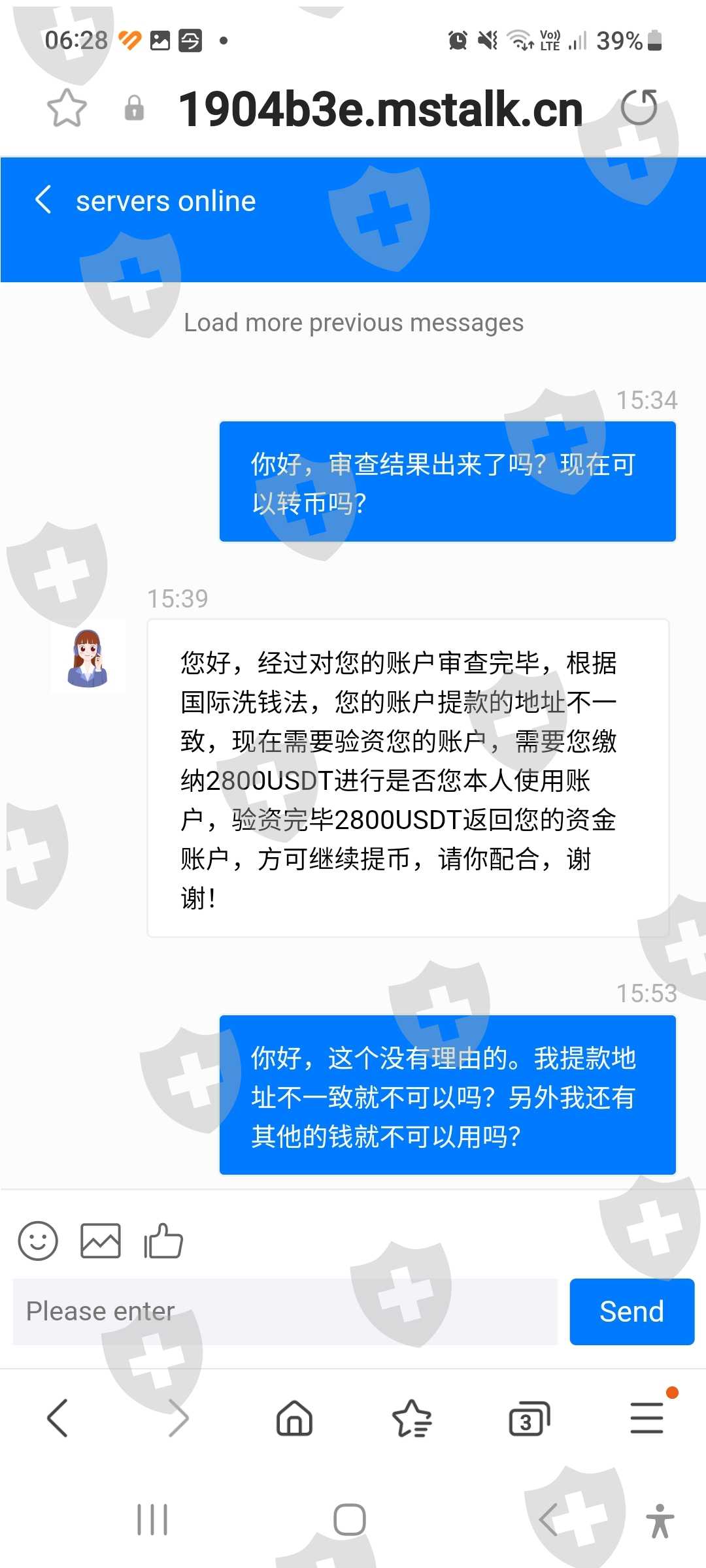 在一个网友的介绍下进了这个网站买币。先是赚了260usdt 让你提币转账后。再继续投入了差不多15000澳元。到一次转币4000usdt 的时候就以不是你的地址为由扣着不放并冻结资产。等我交纳了所谓的验资后就要再进多了百分之八十的流水量。等我要提款时就要交2210usdt的抽水。的我交了后,又以滞纳金为由要交每天百分之五的钱。今天交完了又以风险控制金为由再1270usdt的钱。这个是钓鱼平台请慎重。
