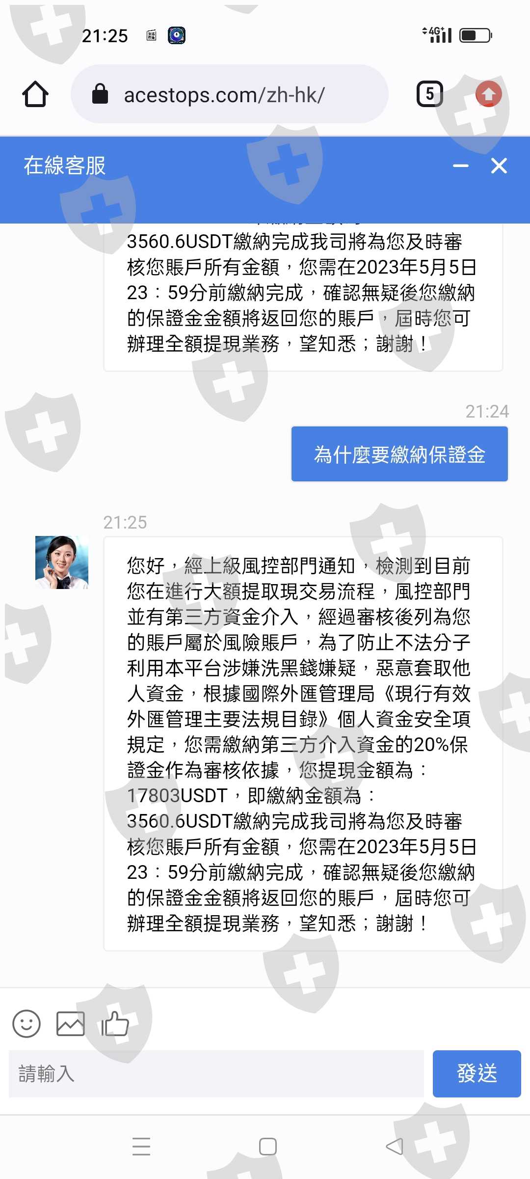 3月底在IG認識一個網友!!之後一直入續叫我入金投資,剛開始投資1萬,之後又投入3萬,沒多久又說行情好叫我去借貸款20萬...好加在我借來只投15萬...之後又說行情好要幫我入金1萬美金,幫我入金之後又說有活動叫我去問客服,客服說有利息活動,我覺得可疑堅持不參加,提出金,客服說有第三方介入資金所以要繳稅金20%金額是3560USTD,到現在無法出金