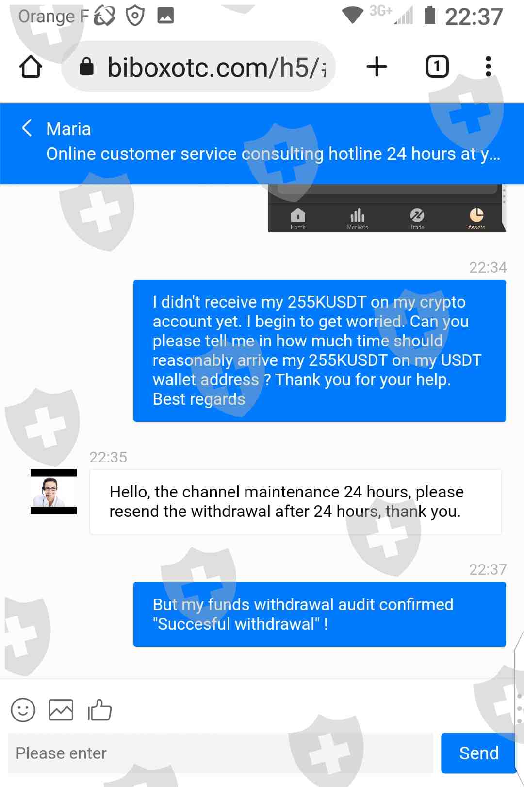 我今天写了第二次针对犯罪和欺诈的投诉BIBoxotc.com 交易商(https://www. BIB oxotc.com)和这个,我是一个严重的浪漫骗局的受害者,这个骗局是由一个在社交媒体上认识的非常聪明但非常危险的女人犯下的。她自称是经验丰富的金融和货币分析师/交易员,并建议我在她推荐的经纪人平台上学习加密货币场外交易:https://www. BIB oxotc.com.her 假名是jane milka(很可能是假身份......)她告诉我来自法国国籍,在美国学习和生活了一段时间(手机:+33 7 55 52 20 65 ).她能说流利的法语和英语。经过广泛的研究和验证, BIB oxotc.com 不合法: BIB oxotc.com 是一家不正规的经纪商,没有任何金融监管机构颁发的任何官方交易许可证。 BIB oxotc.com 也不持有官方电子货币服务许可证。一开始jane milka建议我小额投资,在她的推荐和监督下,我们的同步交易完成于BIBoxotc.com 平台成功。之后,她推动我投入越来越多的钱,以通过与她的交易赚取更多利润。我的总投资金额是38,2 k€,我目前BIB自2022 年12 月结束以来,oxotc 账户余额为255,09kusd。当我想取回我的所有资金时BIB2022 年12 月的oxotc 255,09 kusdt 账户余额, BIB oxotc 在线客服非法要求我缴纳“25% 的个人所得税”(55 kusdt !!!),以便“有权”提取我所有的255,09 kusdt 资金!尽管我多次与BIBoxotc 在线客服告诉他们我绝对不必直接向任何经纪人支付“25% 的个人所得税”! ,而只向我居住国的官方税务局支付,他们一直要求我尊重BIBoxotc 平台规则!并且只通过usdt 转账到他们的特殊税收钱包地址来支付我的税款,这听起来像是投资骗局和税务欺诈……!尽管简·米尔卡和BIBoxotc在线客服。我还试图退还我仅有的38,200 欧元投资本金,但是BIBoxotc 在线客服总是拒绝释放我的38,2 k€ 本金,并且总是告诉我在实现取款之前我必须首先缴纳税款!我解释了BIBoxotc 在线客户服务,我是我的资金所有者,我无需缴税即可取回我唯一的本金!并且我可以随时随意收回我自己的资金!他们保持着令人难以置信和不可接受的立场,一直拒绝释放我要求的38,2 k 欧元投资本金!我几乎不怀疑简·米尔卡会和她一起工作并为之工作BIBoxotc 经纪人诈骗新人并诱使他们将积蓄投资于诈骗BIBoxotc 平台……事先完全知道这个骗局BIB即使在缴纳了25% 的个人所得税后,oxotc 也绝不会授权任何投资者通过成功提款来取回他的资金(本金+ 利润)……! ! ! jane milka 说服并敦促首次亮相的投资者存入尽可能多的钱,只希望他们存入的资金总是越来越多……! ! !在切断了与jane milka 几周以来的所有联系之后,她最近于2023 年4 月26 日通过whatsapp Messenger 回复我,向我提出一项安排,让我预付55kusdt 以支付我的55kusdt BIB oxotc等,成功提取我的255kusdt数字资产BIBoxotc 平台偿还了她,退出后,她借给了255kusdt 和这个,以结束我们的财务诉讼。作为她帮助的对应,jane milka 要求我寄给她第一个2000 usdt 作为我善意的证明和资金存款证明:她想确保我会很好地偿还她预付的55kusdt。我在5 月5 日的上周五向她发送了我的2000 usdt 存款,作为回报,她在几分钟后向我发送了她假装的所谓crypto.com 55kusdt 纳税凭证(见下面的截图!)我还发送给BIBoxotc 在线客户服务我的所有资金提款申请,以确保它已完成。 BIB oxotc 在线客服验证了它(见下面的截图)。我的第一次BIBoxotc 255,09kusdt 资金提款申请被认定为失败BIB5 月5 日星期五oxotc 系统审核!我的第二个BIBoxotc 225,09kusdt 出金申请,终于操作成功BIBoxotc 系统审计于5 月5 日星期五18h46mn 和我的255,09kusdt 很好地扣除了我的BIBoxotc 账户余额显示为0(见下面的截图)。但是,不幸的是,我的225,09kusdt 从未到达我个人的usdt 接收钱包地址!几个小时后,我发现我的BIBoxotc 账户余额已退回我的225,09kusdt 所有资金! BIB oxotc在线客户客户向我解释原因是24小时提款通道维护,我需要在24小时后提交新的提款申请(见下图)。然后简米尔卡让我问BIBoxotc 在线客户服务其他方法来提取我的资金,我被问到BIBoxotc 在线客服不能接受且完全违法的以下事情(见下图):« 您好,您的钱包地址检测异常,为了用户资金安全,您可以支付账户余额的百分之五作为国际转账手续费,然后提交您的银行卡账户,由我司安排财务为您办理国际汇款。 » 显然,我拒绝了。我的钱包地址是从我合法且受监管的交易所复制粘贴的。当然,我的钱包地址显然符合欧洲法律和所有金融法规。事实上, BIB oxotc在线客服及其同伙jane milka首先要逼迫我支付非法5%的国际费用BIBoxotc账户余额有权自由提取自己的资金。那是非法的,是勒索资金的。事实上, BIB oxotc 在线客服尽一切努力阻止我提取资金,总是发明其他新的虚假和非法借口! ! !此外, BIB oxotc 甚至没有官方电子货币服务许可证……jane milka 和她的骗局BIBoxotc 公司的同谋还想让我向他们提供我的借记卡详细信息,以劫持、入侵和窃取我银行账户中的钱:那是严重的金融犯罪! ! !自2023 年5 月7 日起,我的BIBoxotc 账户被冻结,我无法再使用我的255,09kusdt 资金。我不能接受和容忍如此高级别的金融犯罪和危险:经验丰富的浪漫骗局+严重的金融骗局+资金勒索+258,480kust! ! !金钱盗窃+身份盗窃! ! !在与骗局和犯罪作斗争后,我真的感到深深的绝望BIBoxotc 现在已经超过5 个月了,却无法成功提取我的255,09 kusdt 资金,或者至少是我的38,2 k€ 资金!我郑重地允许我请求wififx 以其专业知识和与官方监管金融机构的合作紧急帮助我收回我的255kusd 资金的本金+