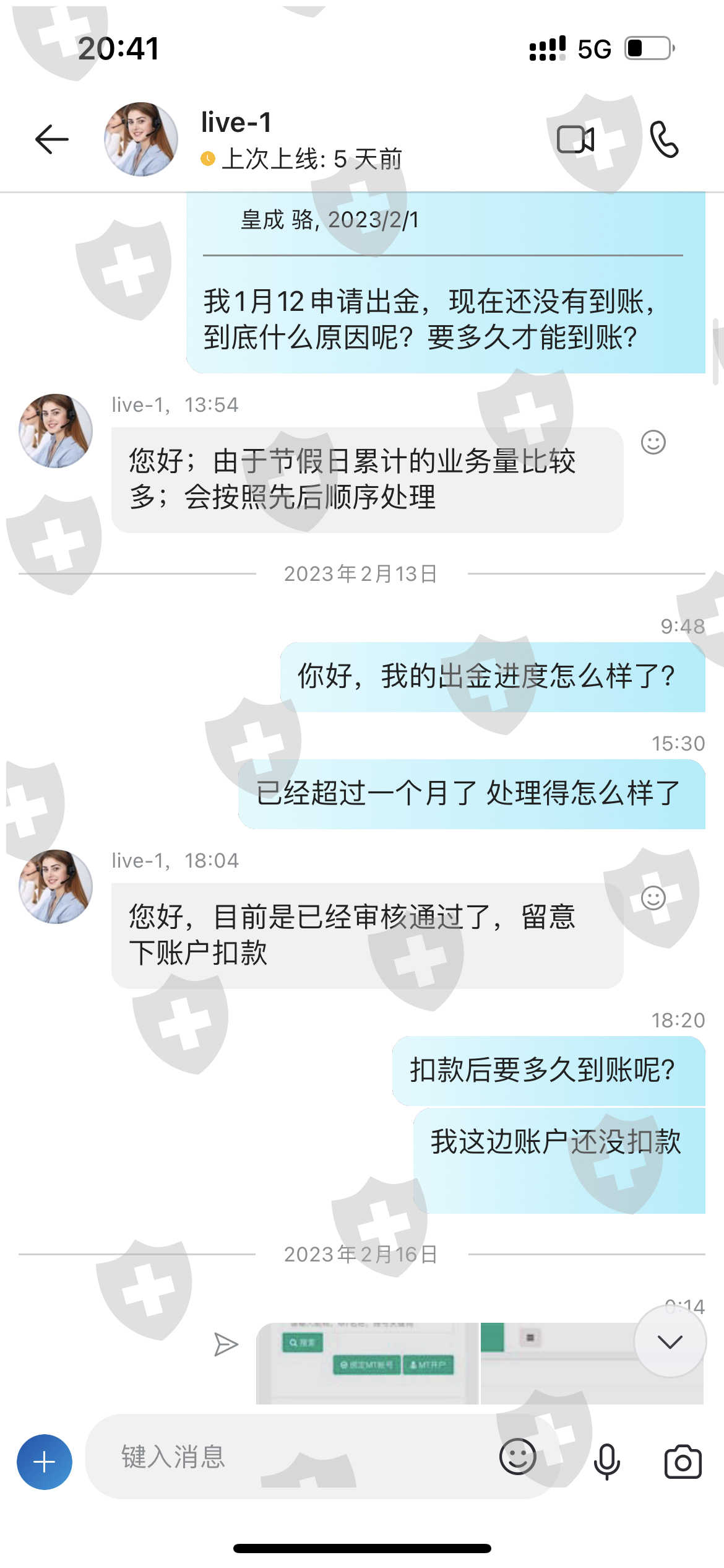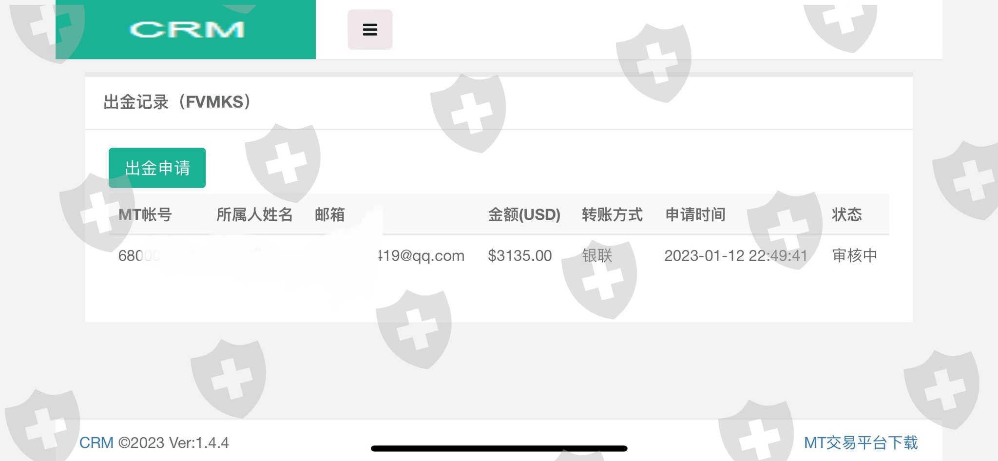 2023年1月12日申请出金3125美金 然后客服各种理由拖 多次说马上到账 结果一拖再拖 每次都各种不同的理由,而且客服也是一问三不知,不正面回答你。现在到了4月底说会在月底处理完,现在5月10号了,要么说正常核查原因,要么找客服不理人,要么就装疯卖傻,各位认清这家FVMKS了,绝对的骗子公司。现在我的账户已经登不上去了,钱也拿不回来。已经报警立了刑事案件,经侦已经在调查。无论最终结果如何,请大家擦亮双眼。