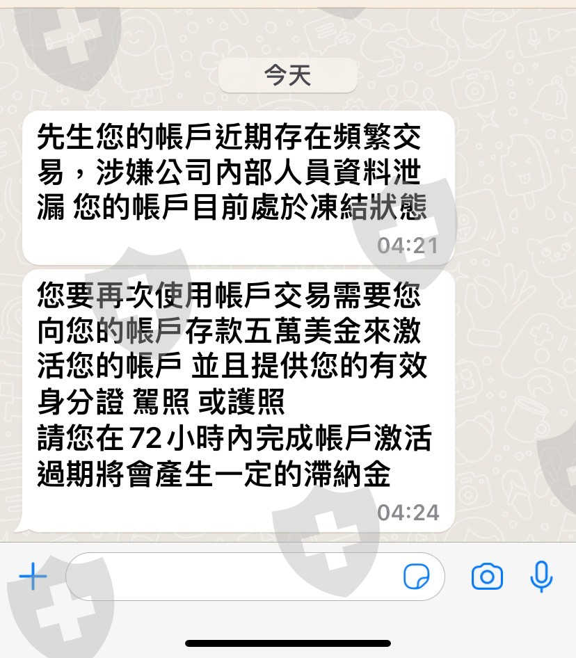 於2022年12月中旬,自稱在元大銀行底下的投資女專員,利用社交App聯繫上我,聲稱可以利用此平台的外匯操作賺取高報酬,在她的話術下選定2萬美金方案,初始先用虛擬貨幣平台,用新台幣兌換USDT入金,之後為期兩倜禮拜的操作,對方利用貨幣對的高點差及手數,通知我即時做多或做空,很快就賺到10萬美元,兩倜禮拜結束,被通知要先付佣金才能提領,當佣金付完後,卻被平台告知涉嫌內線交易而無法出金?連同帳號要都被封鎖,若要解鎖還需付5萬美元才能解鎖帳號,簡直可惡極了!
