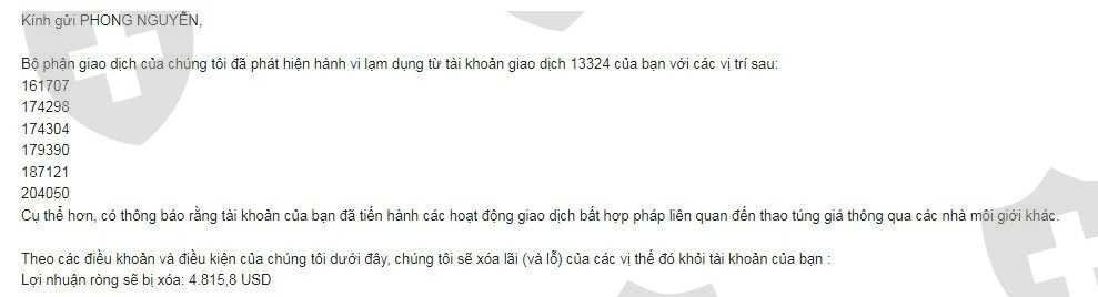 Tôi giao dịch vào sàn này được gần nửa năm nay, nhưng đợt vừa rồi tôi đặt mua một vài mã cổ phiếu và có khoản lợi nhuận thì sàn lại báo tôi giao dịch thao túng giá thông qua nhà môi giới khác và xóa hết lãi và vốn của tôi.