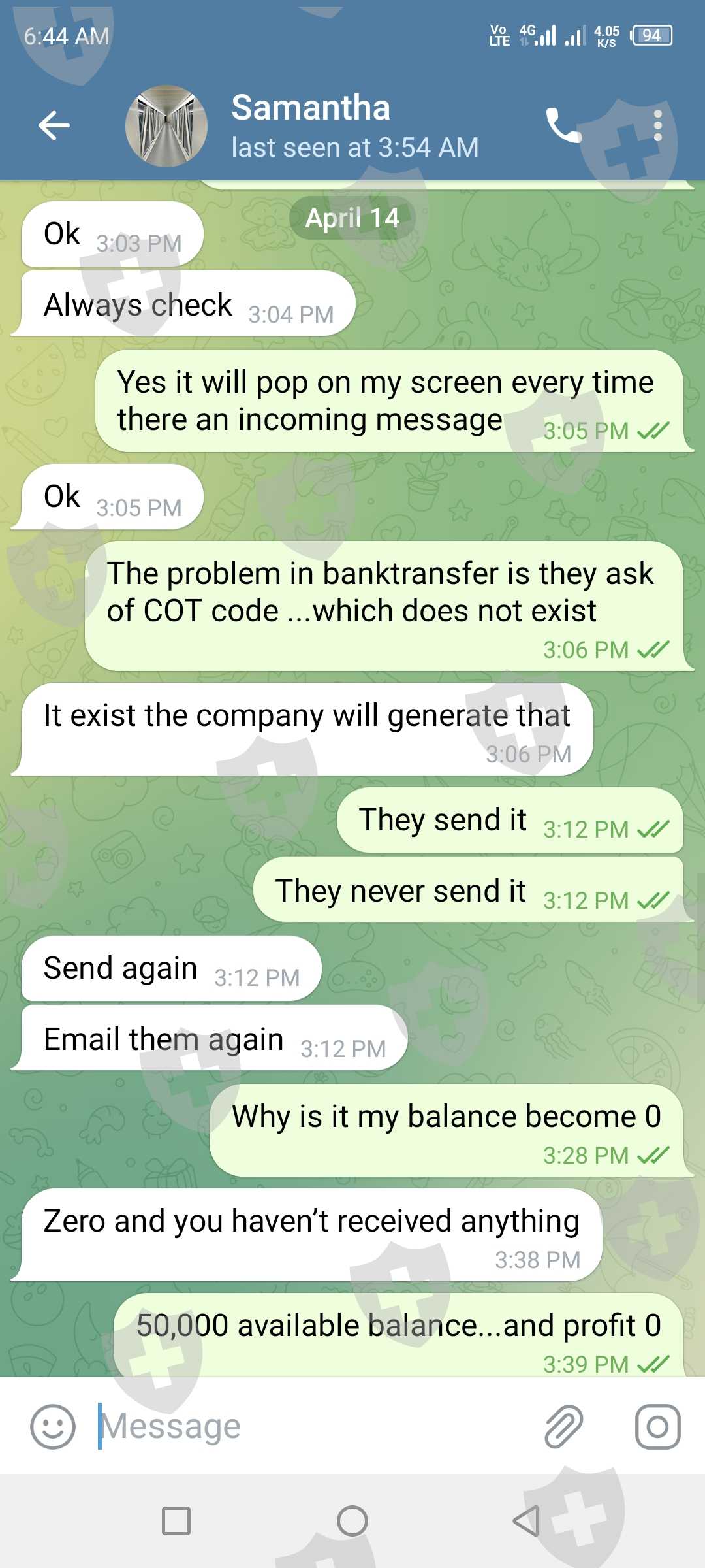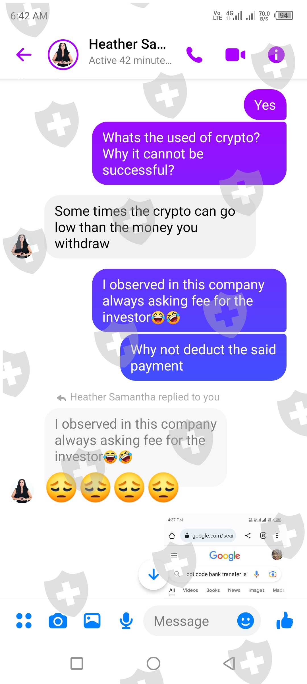 at first I invested a 5000 php for membership fee after 2 days they ask for a verification account fee of 50,000 php but I only send 30,000php so that I can withdraw my profit now here comes the withdrawal process at first I selected the Crypto withdrawal process but sad to say it always pending and they say that is under maintenance for 2mos and they say to proceed to a bank withdrawal so when I tried to withdraw the amount it ask for a COT code ..then the COT code cost 15,000 php.. so o did not pay the cot code...I think it is scam because that Samantha Heather is now not reachable in facebook and in telegram all our conversation is deleted includinf the said manager.