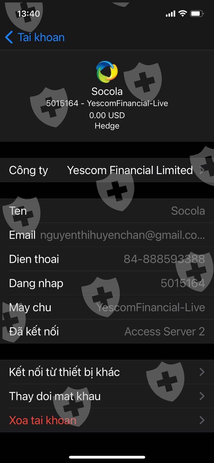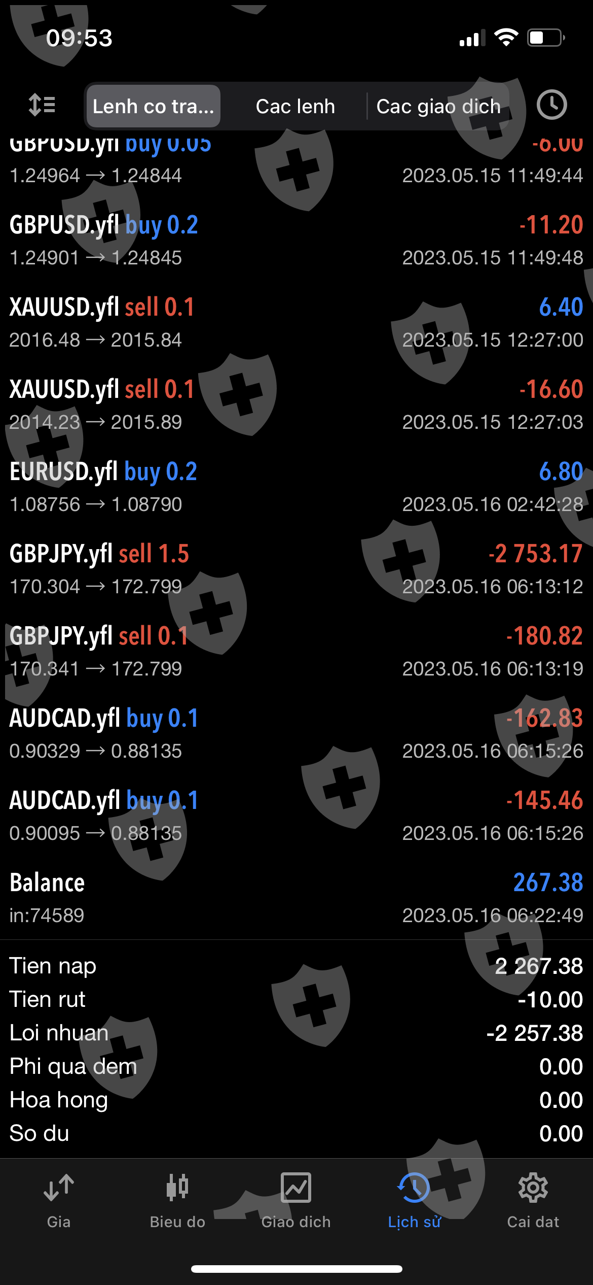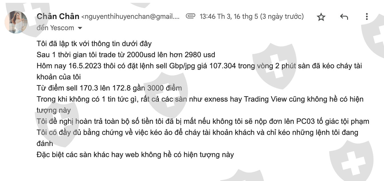 Tôi đã lập tk Yescom dưới ID với thông tin dưới đâySau 1 thời gian tôi trade từ 2000usd lên hơn 2980 usdHôm nay 16.5.2023 thôi có đặt lệnh sell Gbp/jpg giá 107.304 trong vòng 2 phút sàn đã kéo cháy tài khoản của tôiTừ điểm sell 170.3 lên 172.8 gần 3000 điểmTrong khi không có 1 tin tức gì, rất cả các sàn như exness hay Trading View cũng không hề có hiện tượng nàyTôi có đầy đủ bằng chứng về việc kéo ảo để cháy tài khoản khách và chỉ kéo những lệnh tôi đang đánhĐặc biệt các sàn khác hay web không hề có hiện tượng này