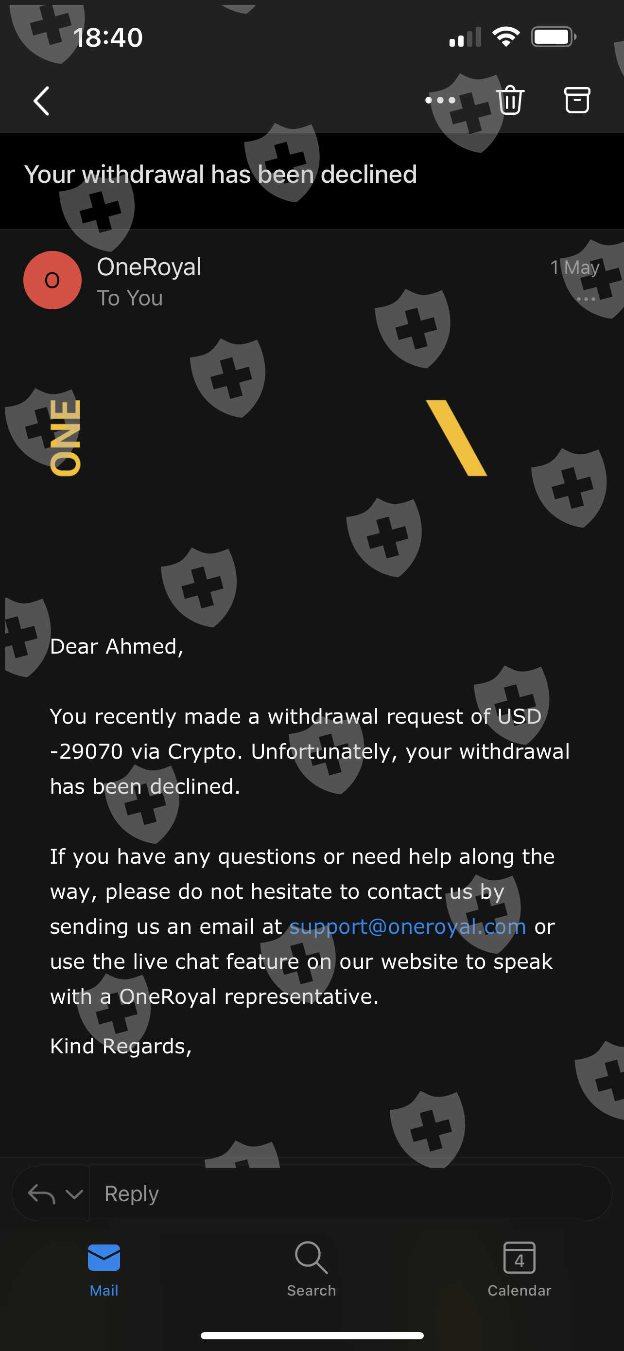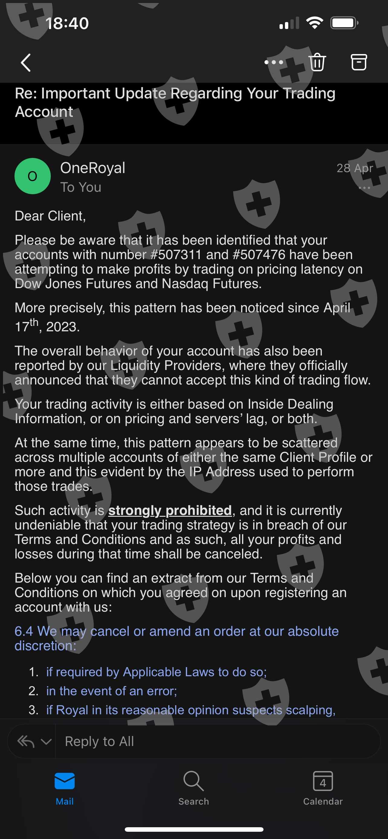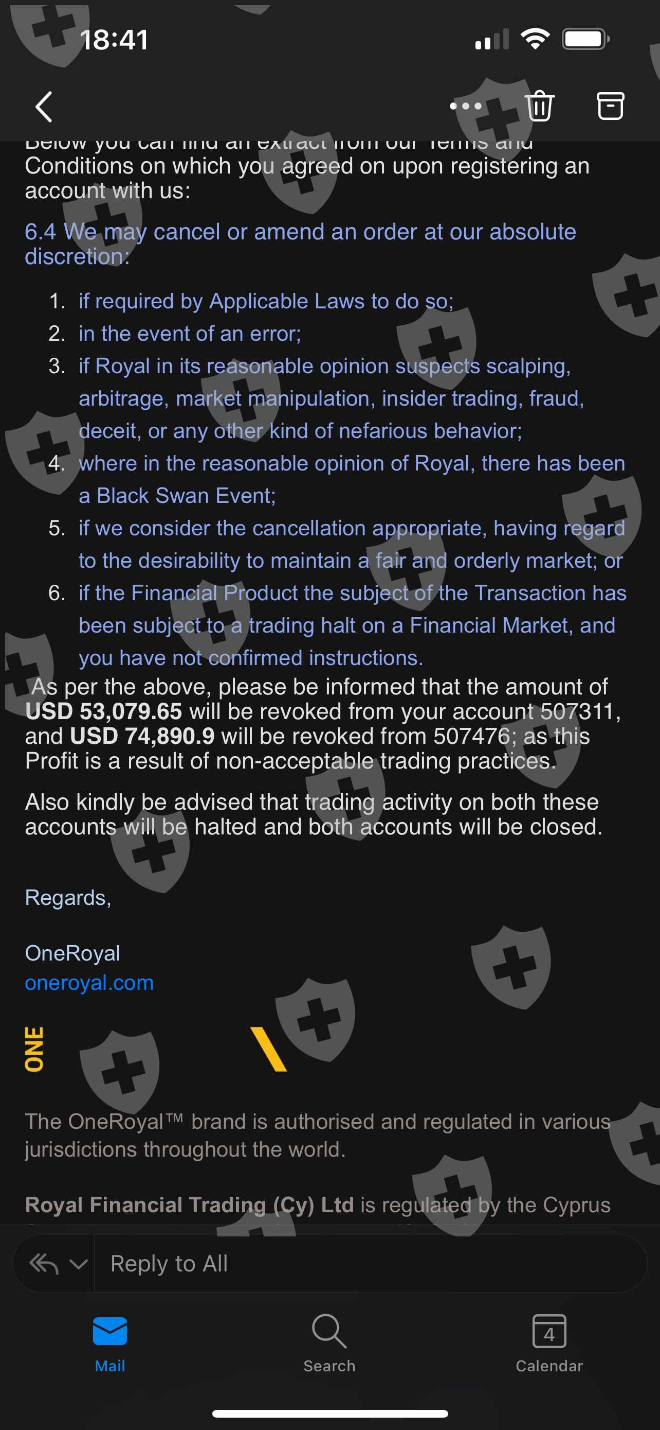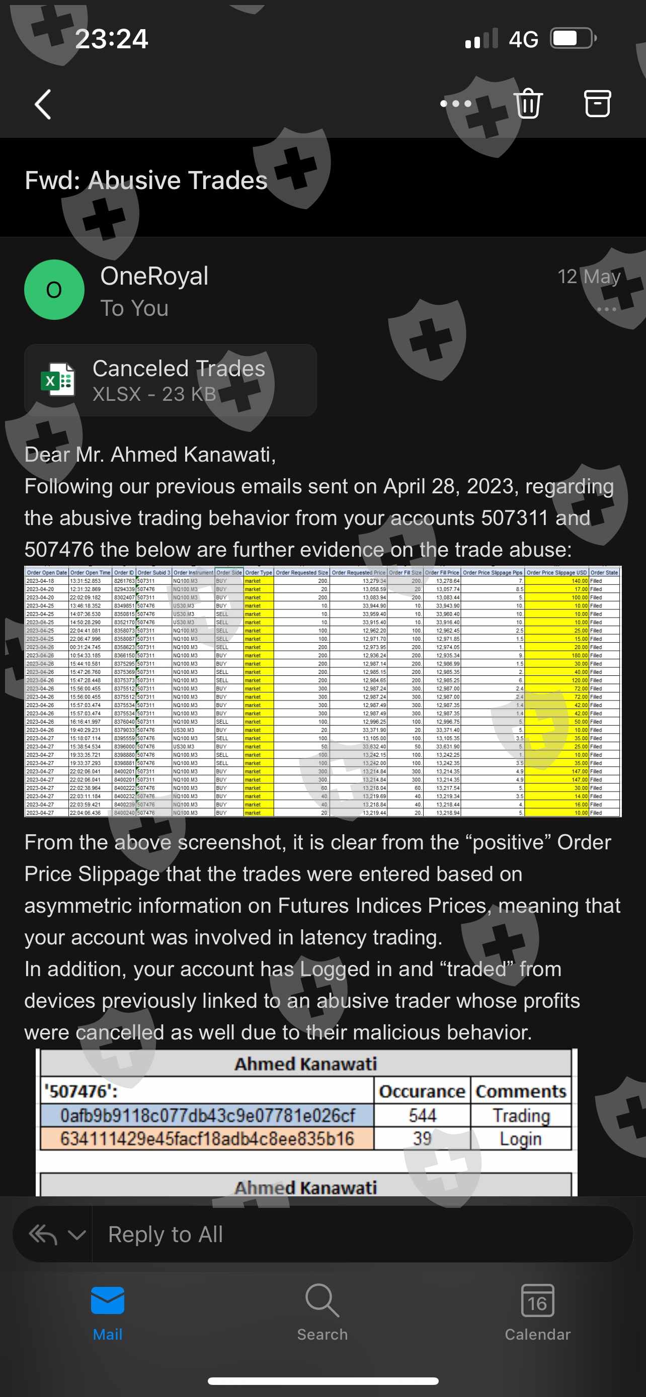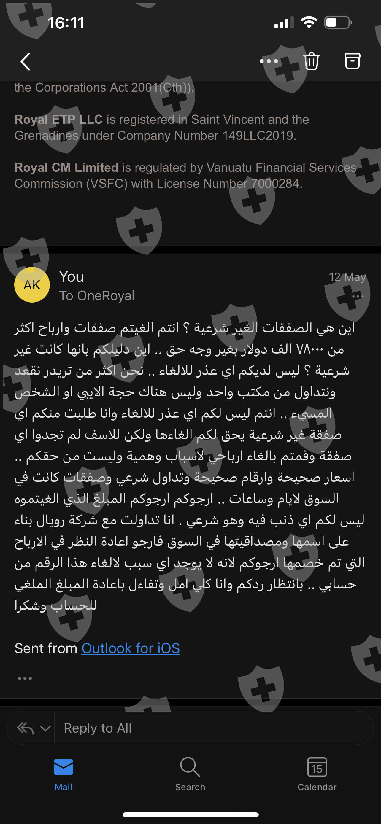 عندي عميل في شركة رويال اودع عندهم اربعين الف دولار وبعد تداول ٢٠ يوم وصلت ارباحه لا خمس وسبعون الف دولار وعندما طلب سحب الشركة رفضت طلب السحب لاسباب وهمية واعادت للعميل راسمال الايداع فقط والغت ارباحه بدون وجه حق وعندما تواصل مع الشركة عبر البريد الاكتروني لاكثر من مرة ردوا عليه بانه الايبي ادريس عندهم لعميل مسيء وانهم خصموا الارباح لهذا السبب ..قام العميل بالتواصل مع الشركة وسالهم اذا في صفقات غير صحيحة او غير شرعية فكان جوابهم نفس الرد مع العلم بان العميل المسيء الذي يقولون عنه هو غير مطرود من الشركة وحسابه شغال وقد قام بايداع ٥٠ دولار على حسابه الشخصي وتداول عليهم وسحبهم ثاني يوم ولم يتكلم معه احد .. كيف هو مسيء للشركة وكيف لم تقفلوا حسابه وتقبلون ايداعه وتداوله ؟ وعندما كسب العميل الثاني مبالغ كبيرة قدموا اسباب وهمية والغوا له