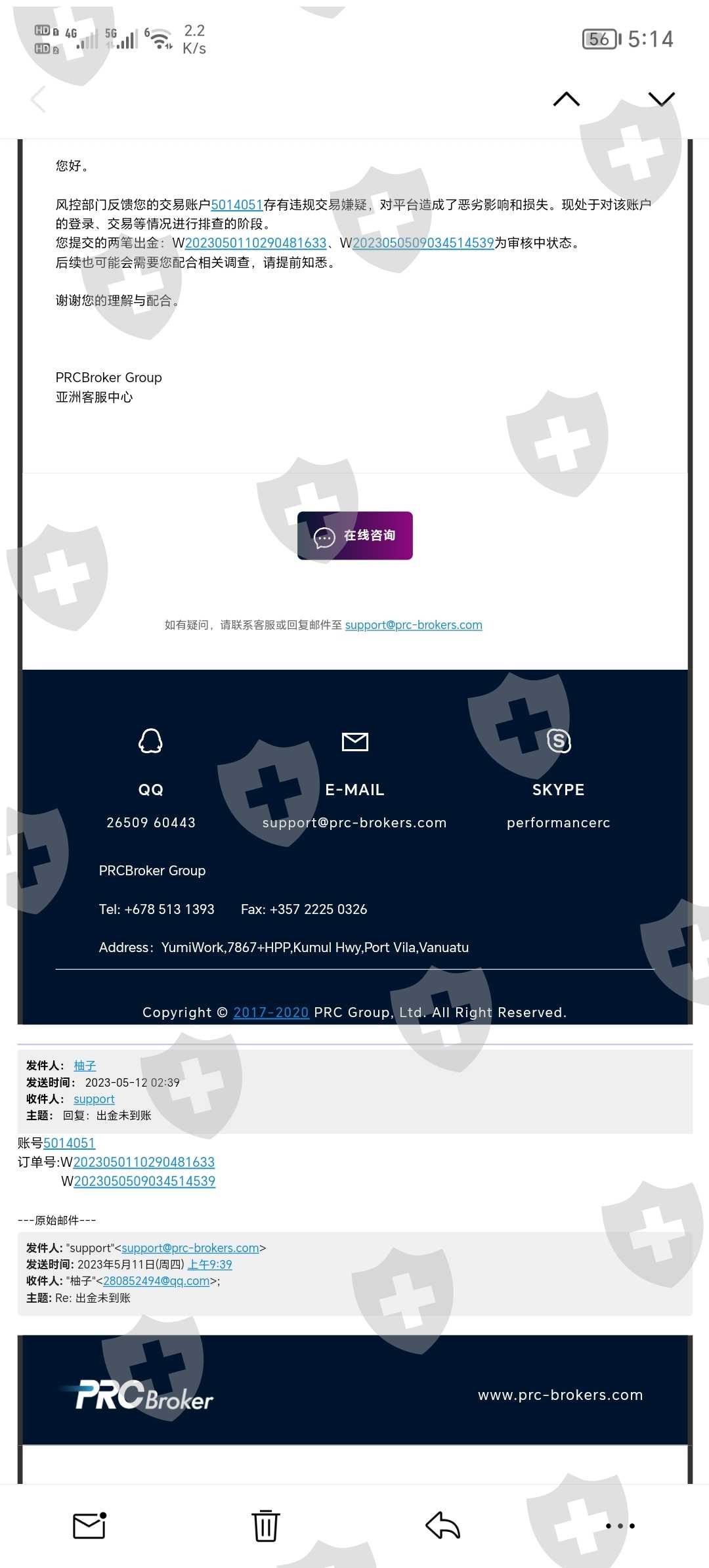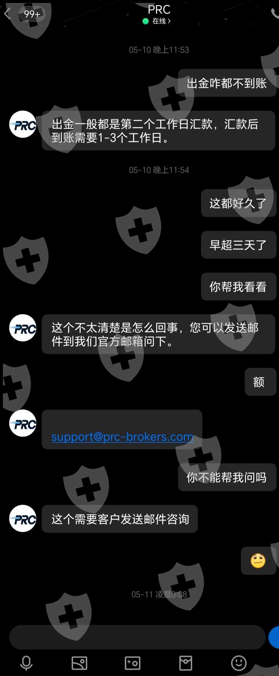 本人于5.1号和5.5号出了两笔金一直没到账,然后5.10号找了他们客服!结果客服说他没能力处理,然后又要我找他们的官方邮箱。 5.12,我发了邮件给他们官方邮箱,他们就回复了我,说我违规交易,后面还要我配合他们相关的调查!然而现在都5月22号了,一直没有下文!