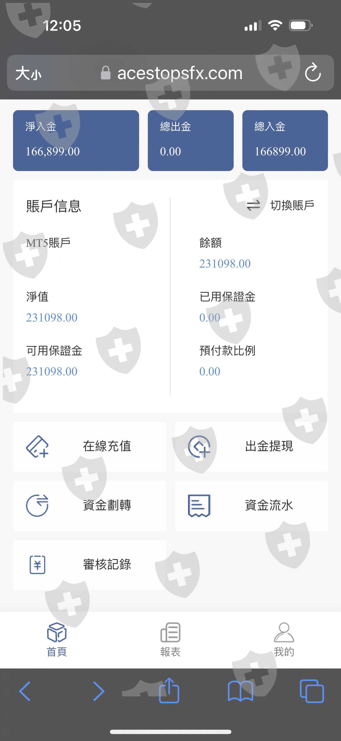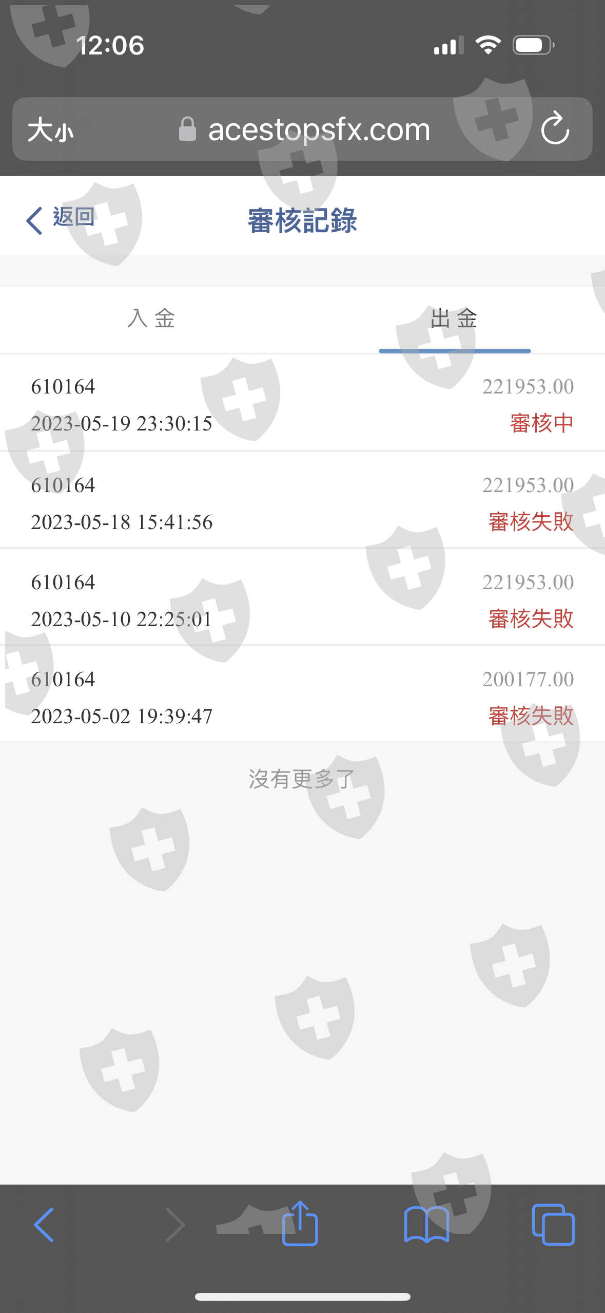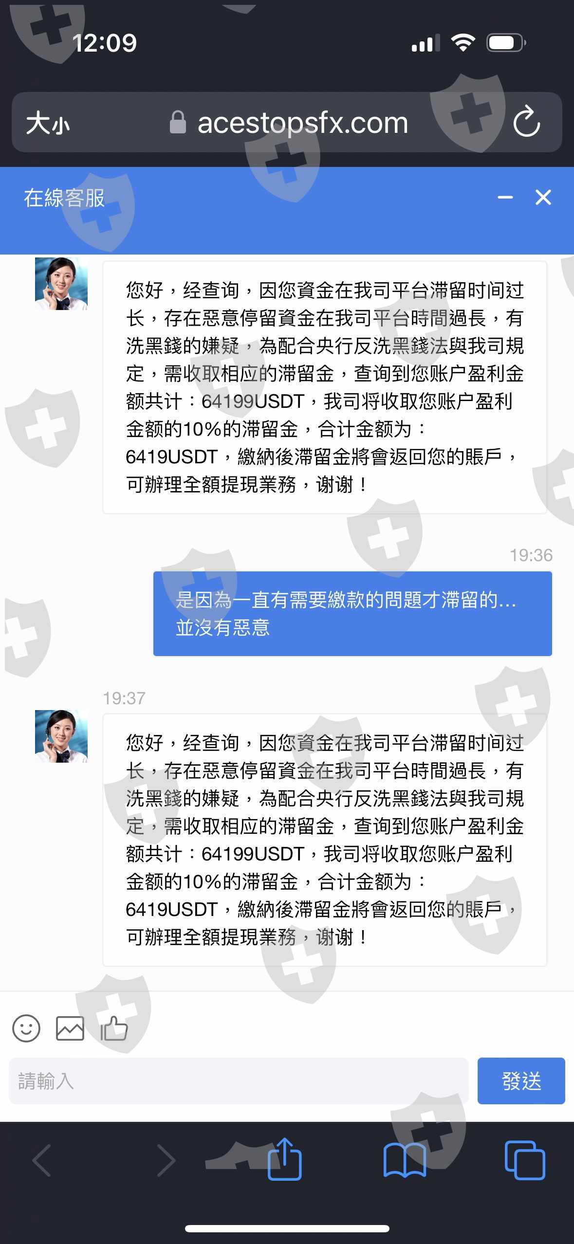 3月底透過網友介紹入金該平台,入金審核都很快速通過,交易也有獲利,來來回回總共入金10幾萬USDT,5月初帳戶內加上獲利已有20萬左右USDT,想申請出金,平台每一次審核都要求繳納各種費用,首先是開通黃金會員加快下款速度,要求再入金18888USDT,然後還送1888USDT,接著說要繳外匯稅務金,金額是帳戶總額的20.6%,並且只有7個工作日的期限,因本人之前已將所有資產全入金該平台,導致無法於期限內繳納,所以平台又要求收取一筆稅款20%的滯納金,此時距離第一次申請出金已經過了半個多月,在我以為終於可以提領的時候,平台又說我惡意停留資金時間過長,要求我繳納帳戶盈利10%的滞留金,此平台一次又一次拖延就是不給出金!另外,此平台已更改網域為https://m.acestopsfx.com/#/