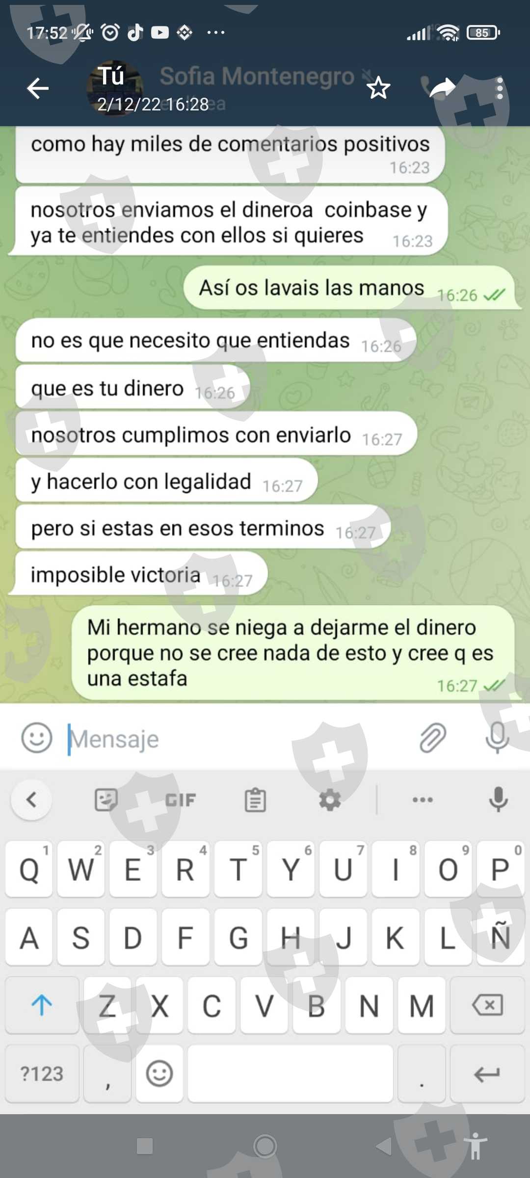 Sofía Montenegro 负责所有与转账相关的事情,前 250 和其他 1500。我产生了 24,000 并要求我 5,000 欧元兑换它,因为她说这是逃税......我失去了一切