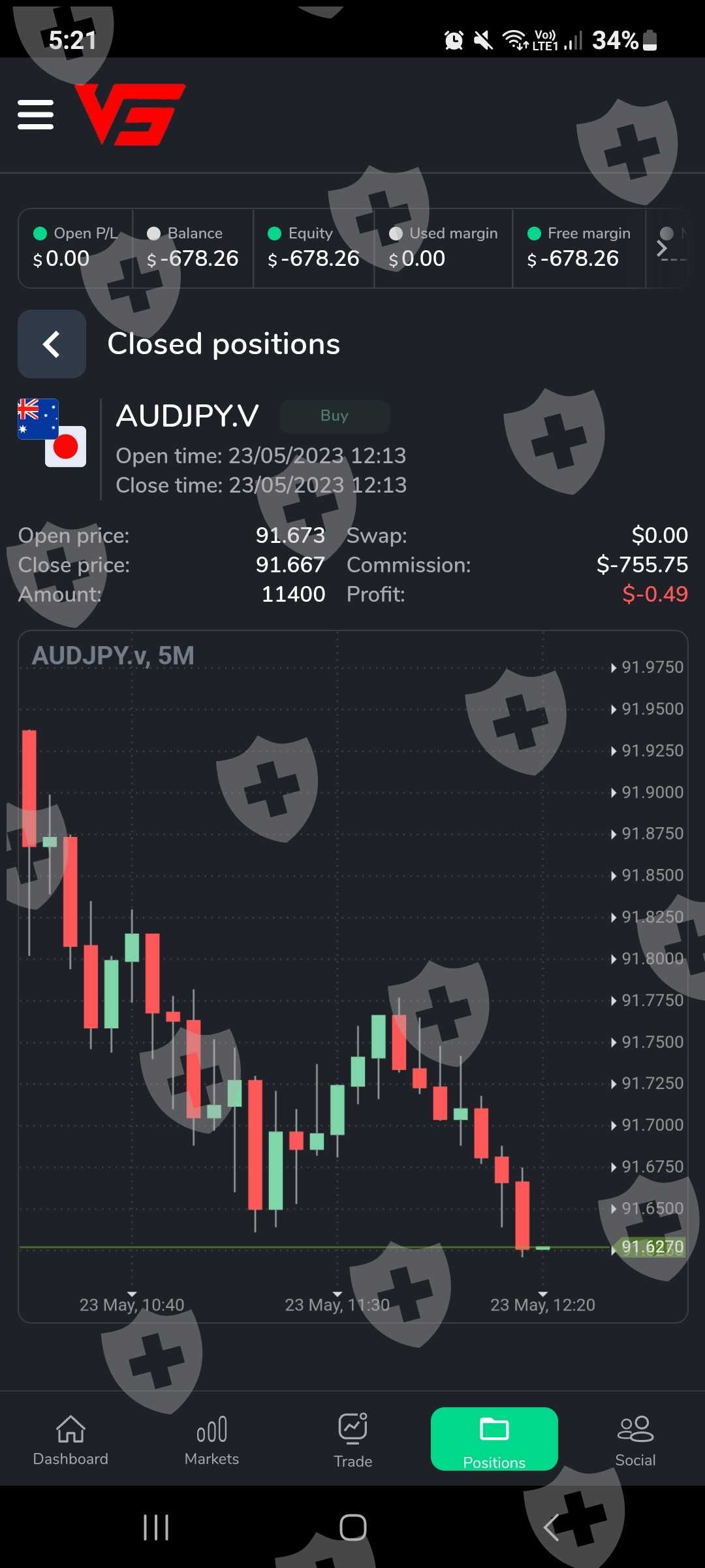 I trade on May 23, 2023 AUDJPY. I open the trade it automatically closed and my capital became negative in a span of less than a second the profit is $0.49 and the commision is $755.75 no broker in the world that will charge the trader 10 times of his capital.