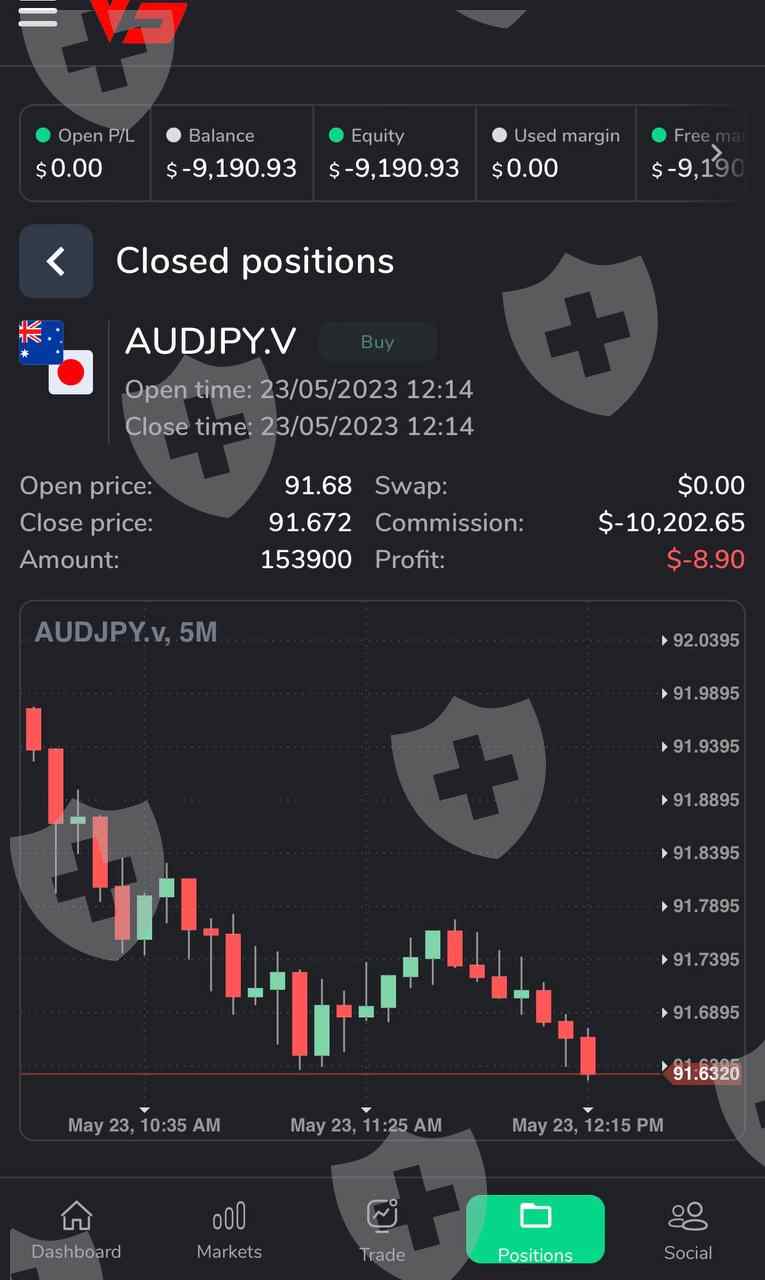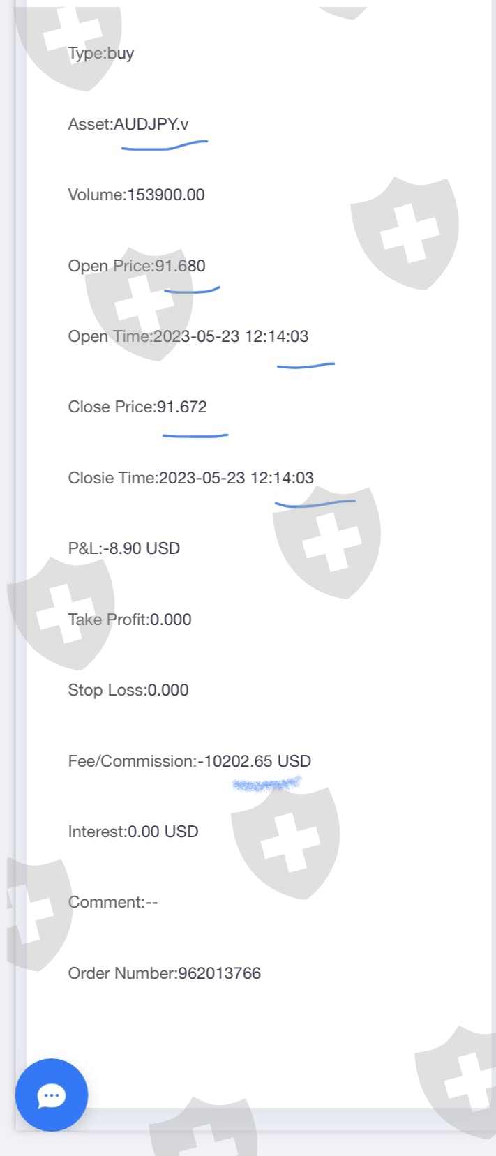 你好!我想请求对我的投诉进行深入调查,并请在必要时处理问题。我在V5 forex global 上交易,并被收取了高得离谱的费用(10 倍)作为佣金:工具:AUDJPY.V 。开盘时间:2023年5月23日12:14:03。收盘时间:2023年5月23日12:14:03。 (下订单时自动关闭)交易量:153900.00 盈亏:-8.90 美元佣金:-10202.65 。此外,我的账户在2023年5月23日14:31:21 进行了一笔奇怪的交易作为系统存款,存款是( +9190.93,订单号962013768)。目前我的账户余额为负(-10,202.65 美元),我之前1,020 美元的实际资产已经消失。所有与V5 的联系都不起任何左右,我以前交易过相同的品种,没有任何问题。之后,我将我钱包中剩余的46 美元进行了内部交易到我的主账户,我进行了交易并增加到50 美元,我要求提款到我的币安账户,V5 批准了,到今天6 天了还没有到账。我希望知道他们这么做的理由,得到回应。谢谢!