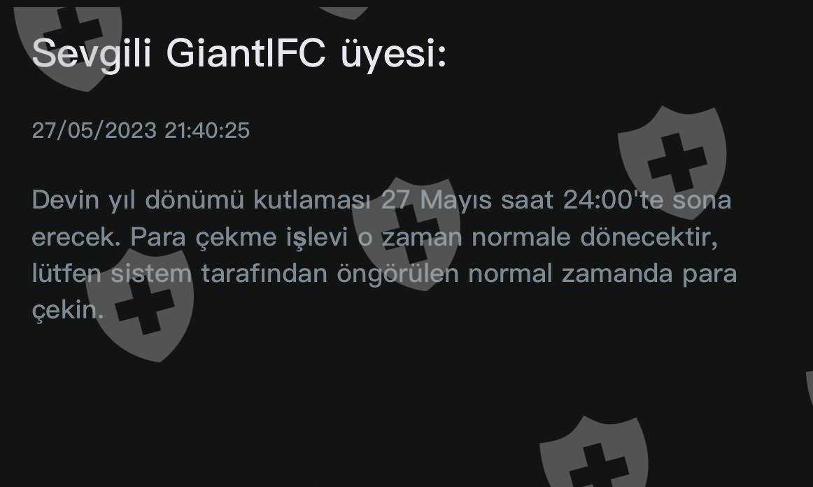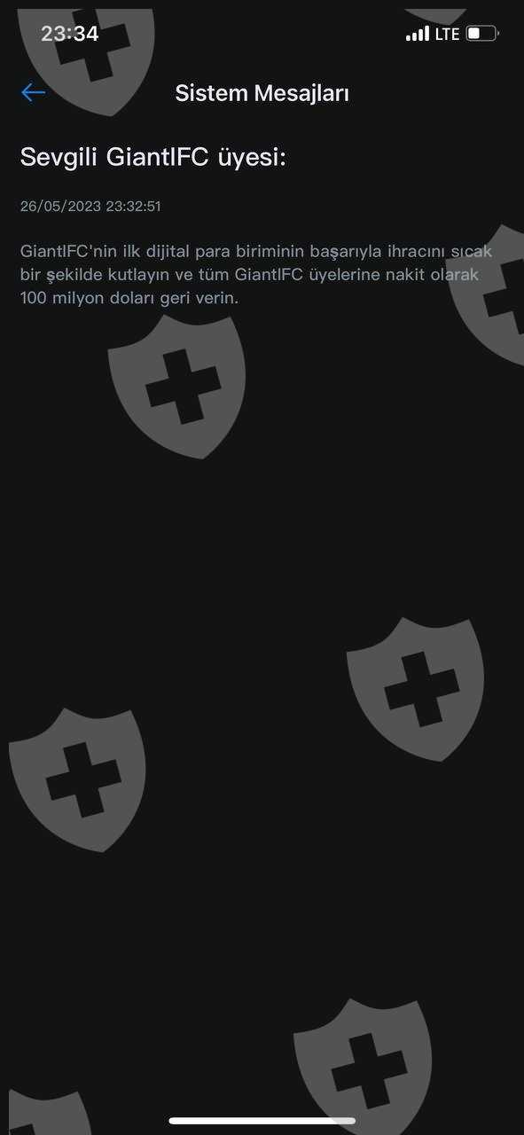 Giant IFC骗取5万多投资者,盗取5.6亿多美元 05/23/2024,暂停出金 05/24,平台收到通知,入金5%的人将被记为红利. 5 月 30 日,通知来了:“如果我们想保存我们的帐户,我们需要向平台发送 100 到 300 美元,当然我没有发送,但是在 tronscan 上跟踪他们的地址,成千上万的人发送了 $各300个,结果6月1日17:00,平台被关闭。补充:“ Giant IFC发了通知说他们要搬到xtb平台,并在平台上发布了合作伙伴照片。我们写信给xtb服务,他们回答说没有这样的协议。由于该平台关闭,超过 50,000 名投资者(其中大多数在土耳其)身无分文。我们针对 Giant IFC.现在还不知道骗子现在在哪里。