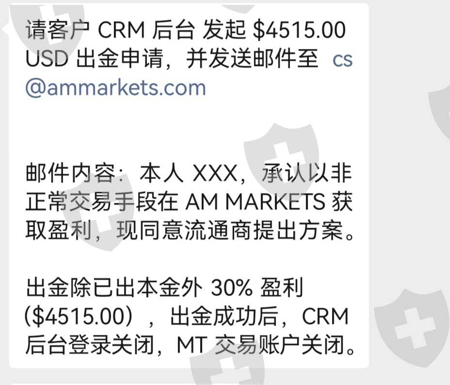 我在AMMarkets平台开户入金交易,因为赶上单边上涨行情我手里满仓多单,全部盈利没有亏损。就因为没有亏损平台说我违规交易,从5月4日申请出金一直不给处理,直到5月31号平台让我签霸王协议,就是盈利给一部分(30%)。我被逼无奈银行催收,网贷平台催着还钱,只能先拿回一部分解决眼前困难。剩下10532美金平台不给了,要求关闭我后台。这样的黑心🖤平台太恶心,平台黑我血汗钱。平台给的霸王条款如下:请客户 CRM 后台 发起 $4515.00 USD 出金申请,并发送邮件至 cs@ammarkets.com